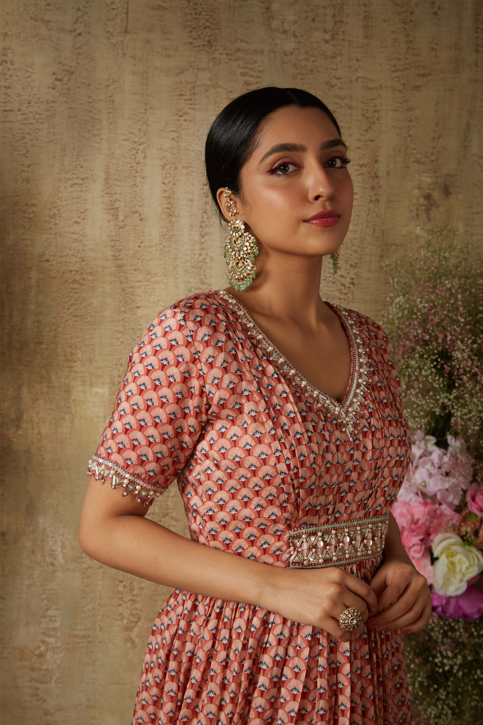 Discover elegance in our exquisite red printed anarkali, meticulously crafted with intricate front gather detailing. This ensemble effortlessly merges traditional allure with contemporary sophistication, offering a silhouette that radiates grace and charm. The vibrant red print adds a touch of richness and vitality, making it an ideal choice for both special occasions and cultural festivities. With its impeccable craftsmanship and attention to detail, including delicate gathers that ensure a flattering fit, this anarkali promises to captivate admirers. Embrace the timeless beauty of indian heritage and modern design with this exceptional ensemble, designed to elevate your style and confidence on any occasion.