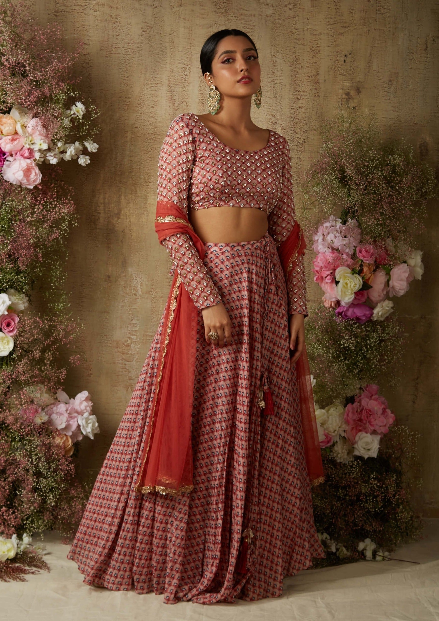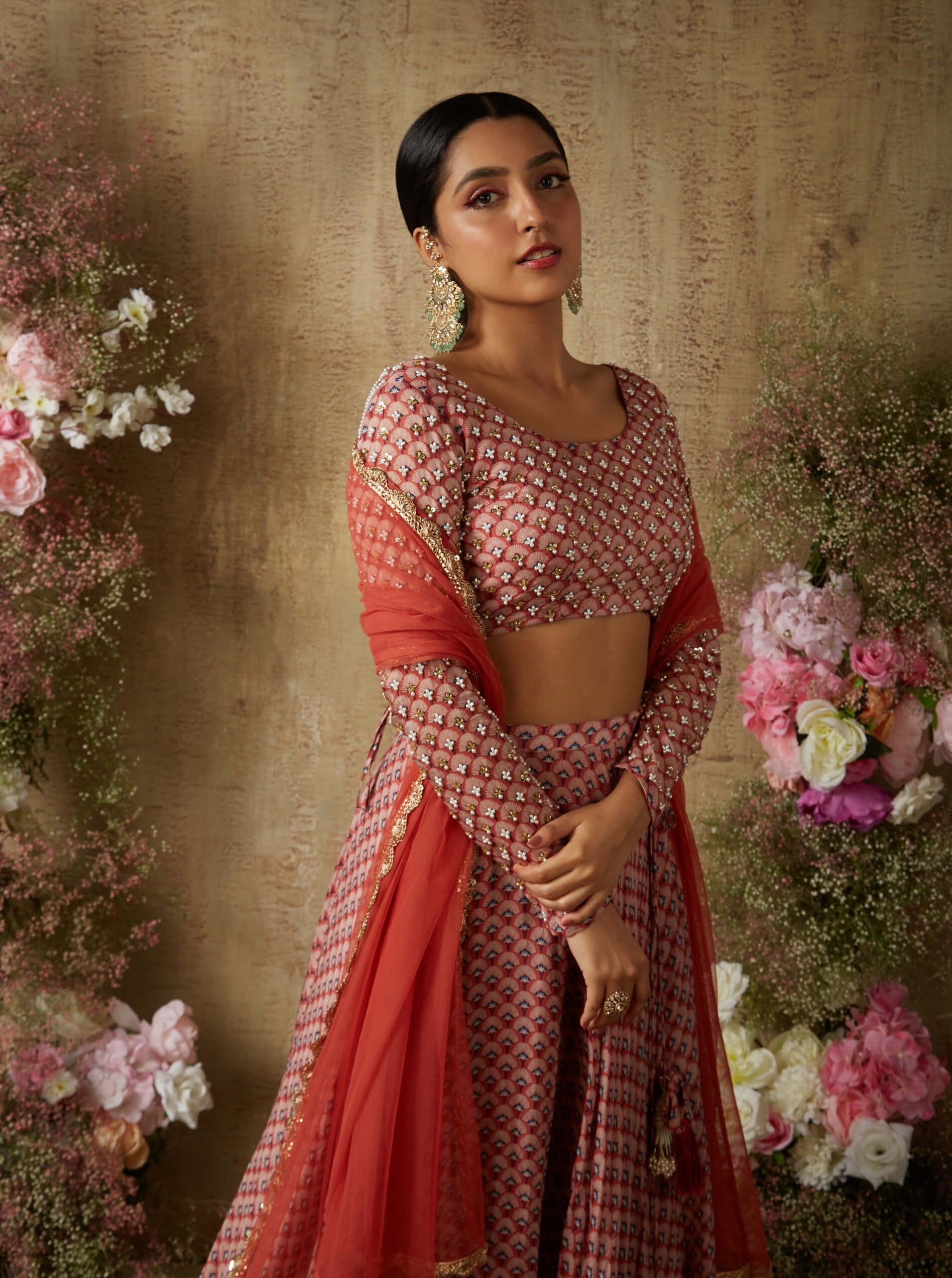 Explore elegance with our stunning red printed lehenga set, featuring a meticulously crafted blouse adorned with intricate back detailing and complemented by a delicate net dupatta. This ensemble seamlessly blends traditional artistry with contemporary design, showcasing vibrant prints and meticulous craftsmanship. The red printed lehenga exudes sophistication with its graceful silhouette, while the intricately designed blouse adds a touch of timeless charm. Paired with the ethereal net dupatta, this ensemble is perfect for weddings and celebratory occasions, promising a captivating look that captures attention with every movement. Embrace the beauty of cultural richness and modern elegance with this exquisite outfit, designed to make you feel radiant and poised on your special day.