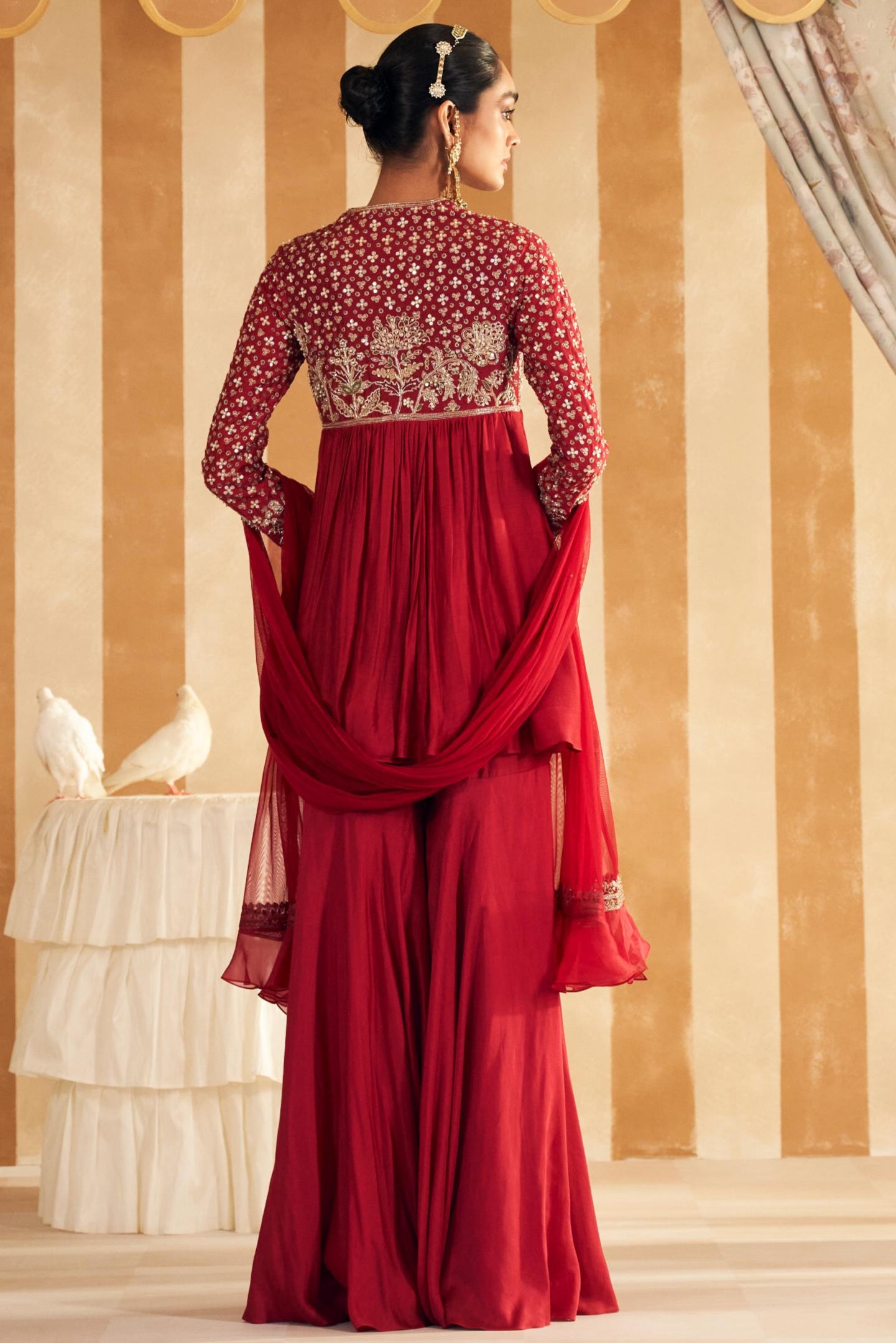 Infuse your festive wardrobe with flair and tradition in the Red Qasida Hunar Short Anarkali Set. Featuring a bold red hue and intricate embellishments, this short Anarkali set is a perfect blend of classic artistry and modern silhouette. The shorter length adds a contemporary edge while preserving the grace of timeless design, making it ideal for pre-wedding functions, festive celebrations, and cultural gatherings. Turn heads with this vibrant and effortlessly elegant ensemble.