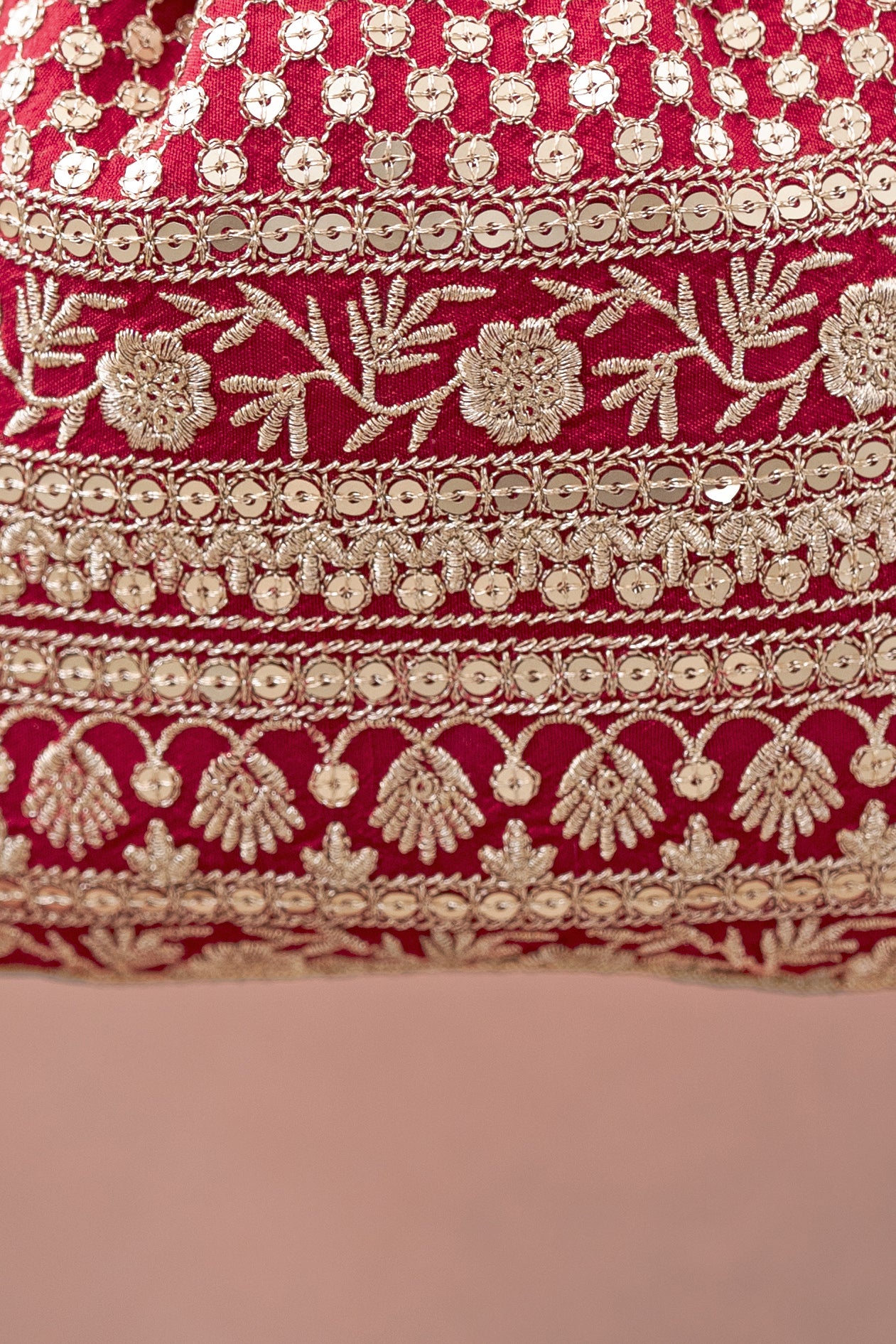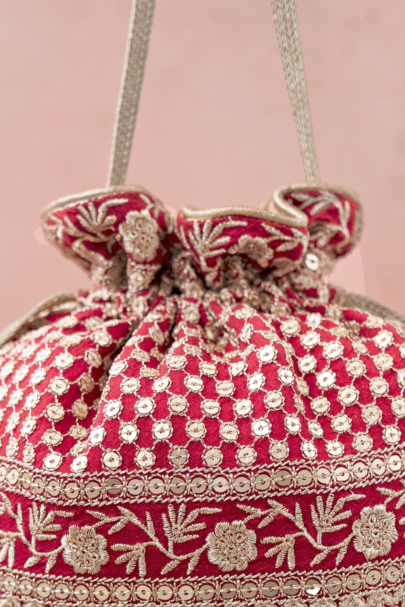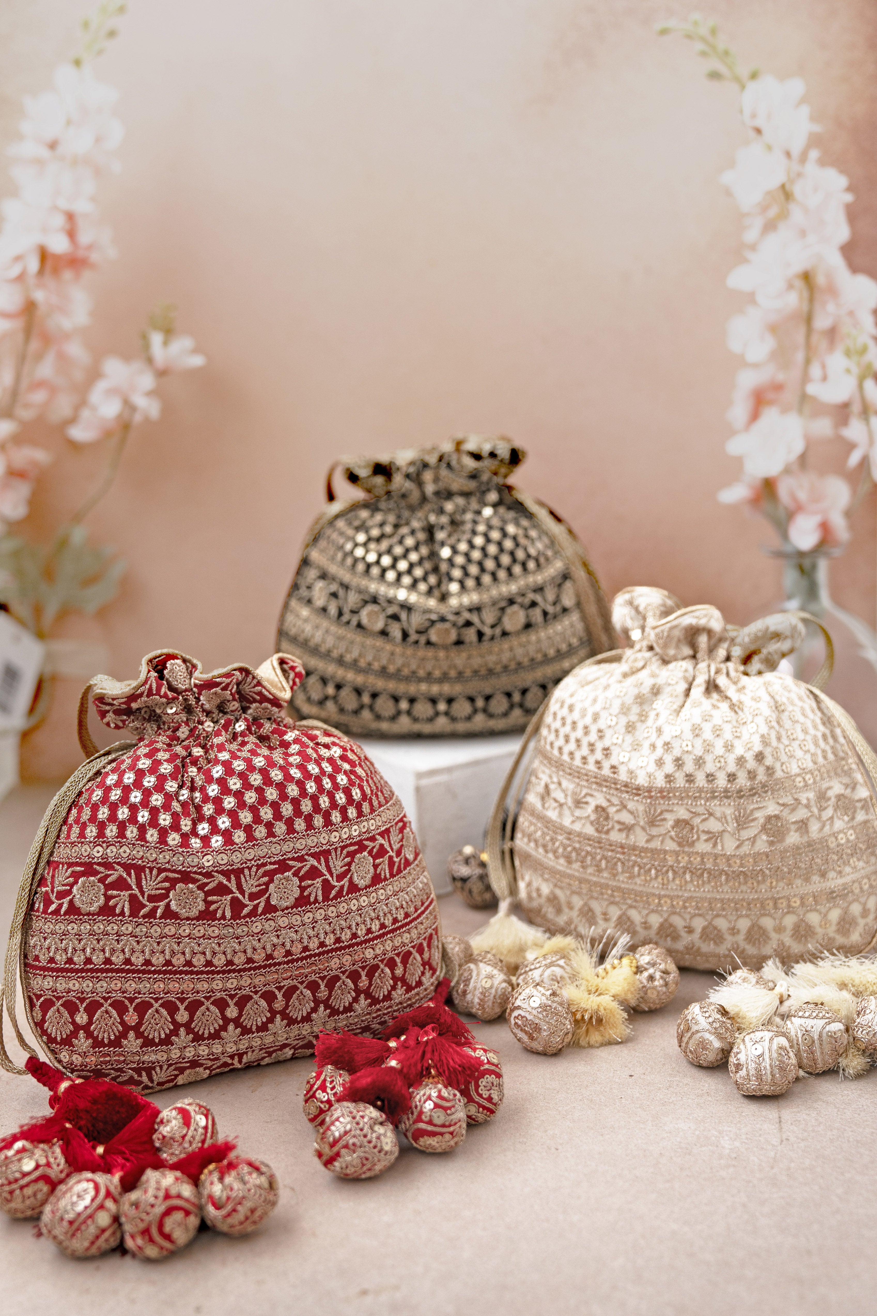 The Red Resham Potli is a bold statement of tradition and elegance. Featuring detailed resham embroidery on a rich red base, this potli adds a festive and regal touch to any ethnic ensemble. With a classic drawstring closure and spacious interior, it combines beauty with functionality. Perfect for weddings, festivals, or special occasions, it's an ideal accessory for those who love vibrant colors and intricate craftsmanship.