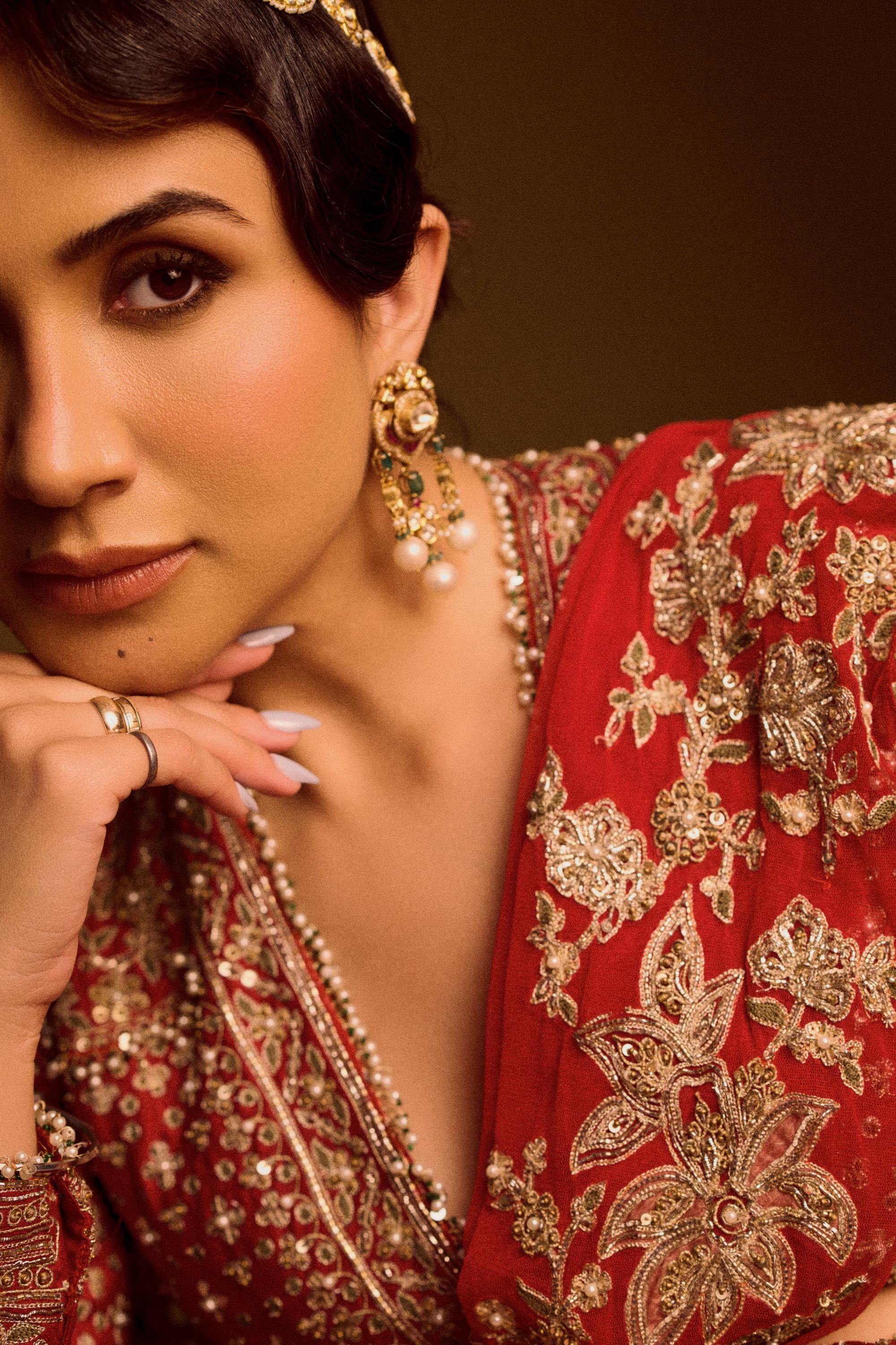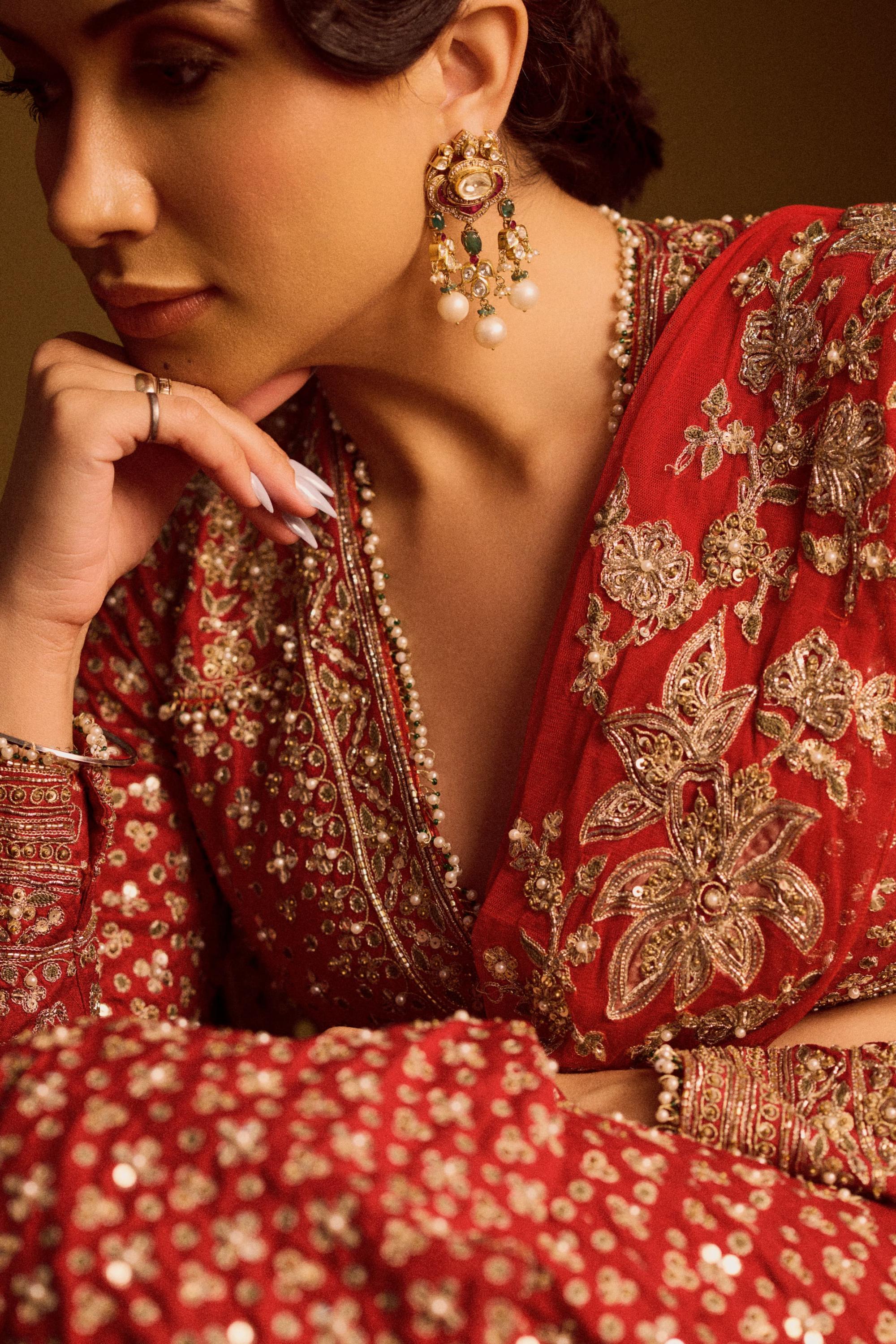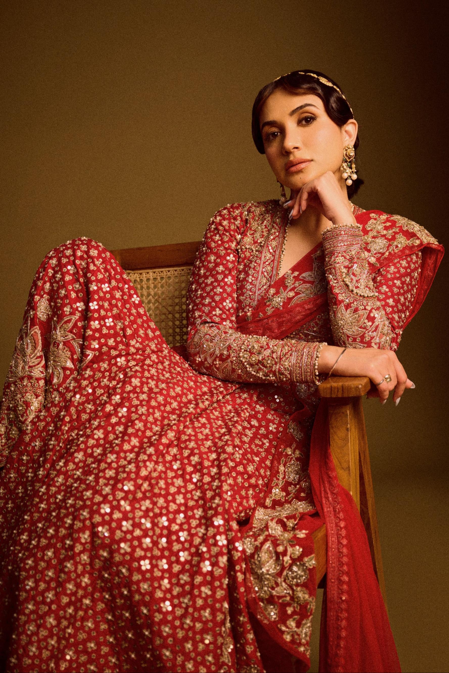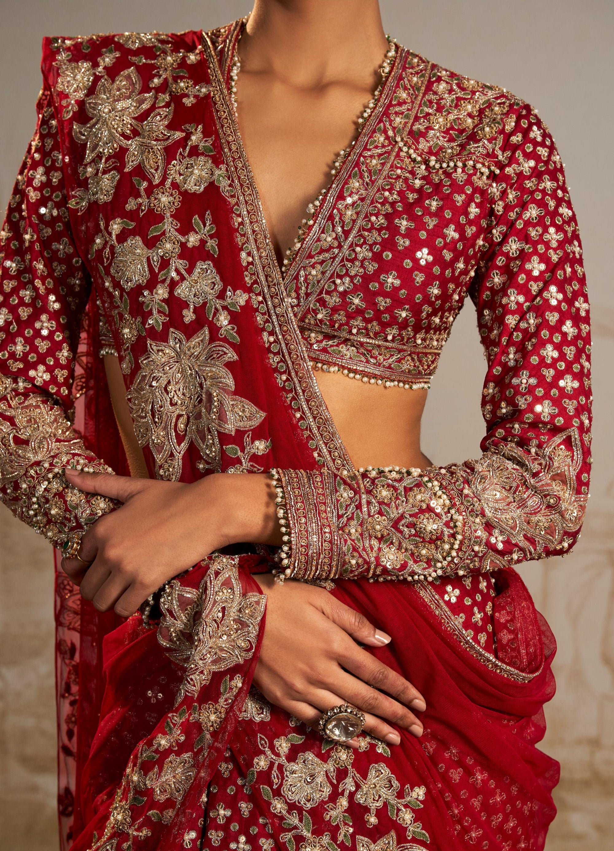 The Red Sagan Safarnama Saree Skirt Set brings together the elegance of a saree and the ease of a modern silhouette. Drenched in a rich red hue, this contemporary ensemble features a pre-draped saree-style skirt paired with a beautifully crafted blouse, perfect for intimate weddings, festive soirees, or statement celebrations. A striking blend of tradition and innovation, it's designed for the woman who moves with grace and confidence.