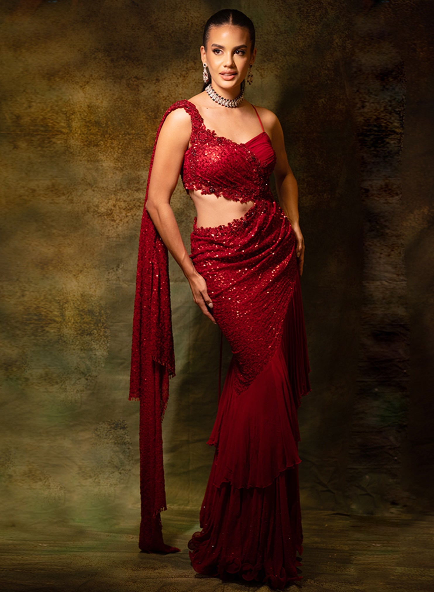 Unveil a new level of sophistication with this captivating gown, where shimmering sequins meet contemporary design. The gown features a unique one-sided pallu drape and a chic one-sided keyhole, blending traditional elegance with modern flair. Adorned with intricate 3D sequins floral work, it creates a mesmerizing play of light and texture. Perfect for making a statement at any event, this outfit combines stunning embellishments with innovative design to ensure you stand out with effortless grace and style.
