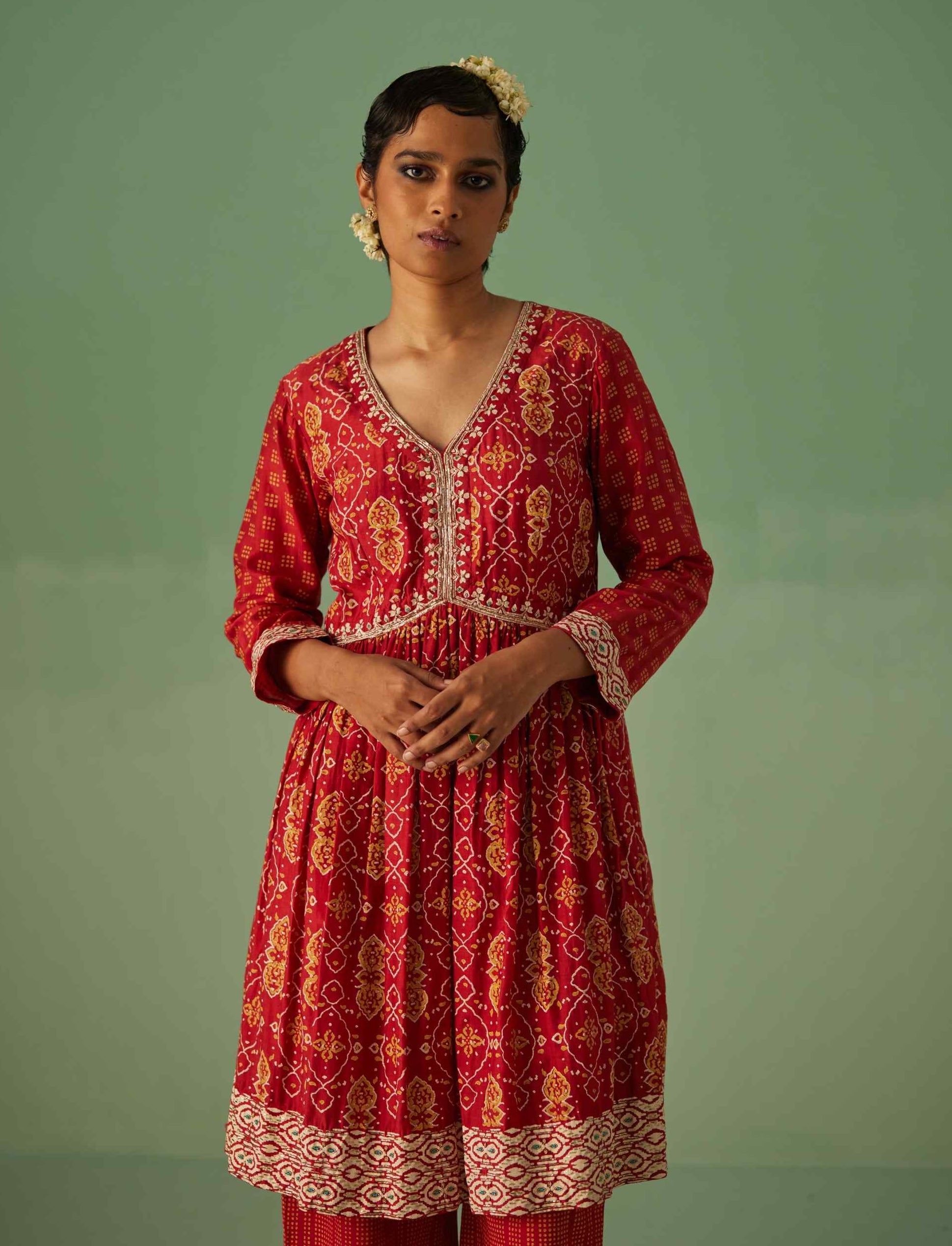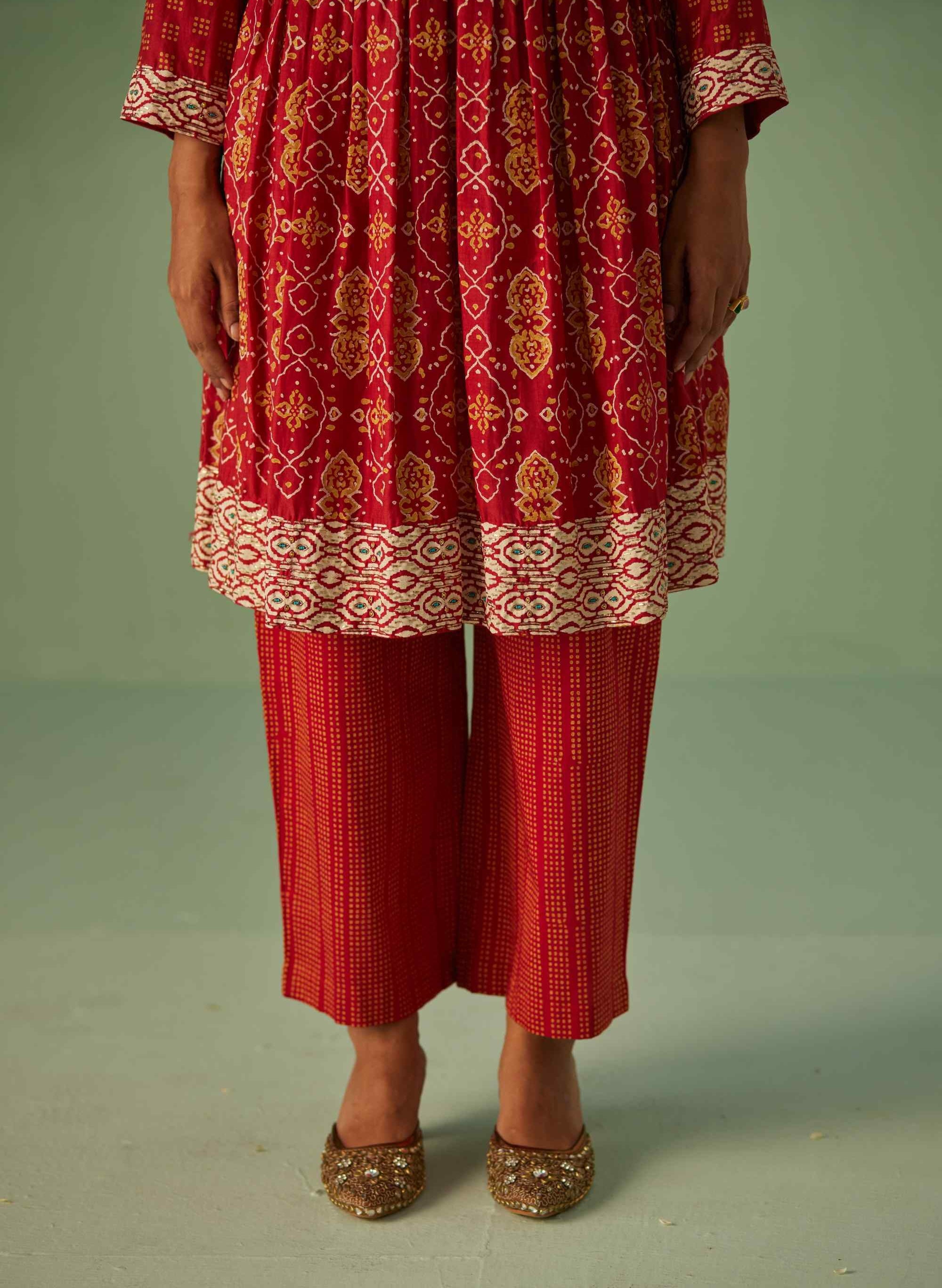 This striking red kurta features custom block printing in a harmonious blend of yellow and beige. Adorned with intricate dabka and bead embroidery, it exudes sophistication. Paired with a printed wide-leg trouser, this ensemble offers a seamless fusion of traditional craftsmanship and modern style, making it a perfect choice for chic and memorable occasions.