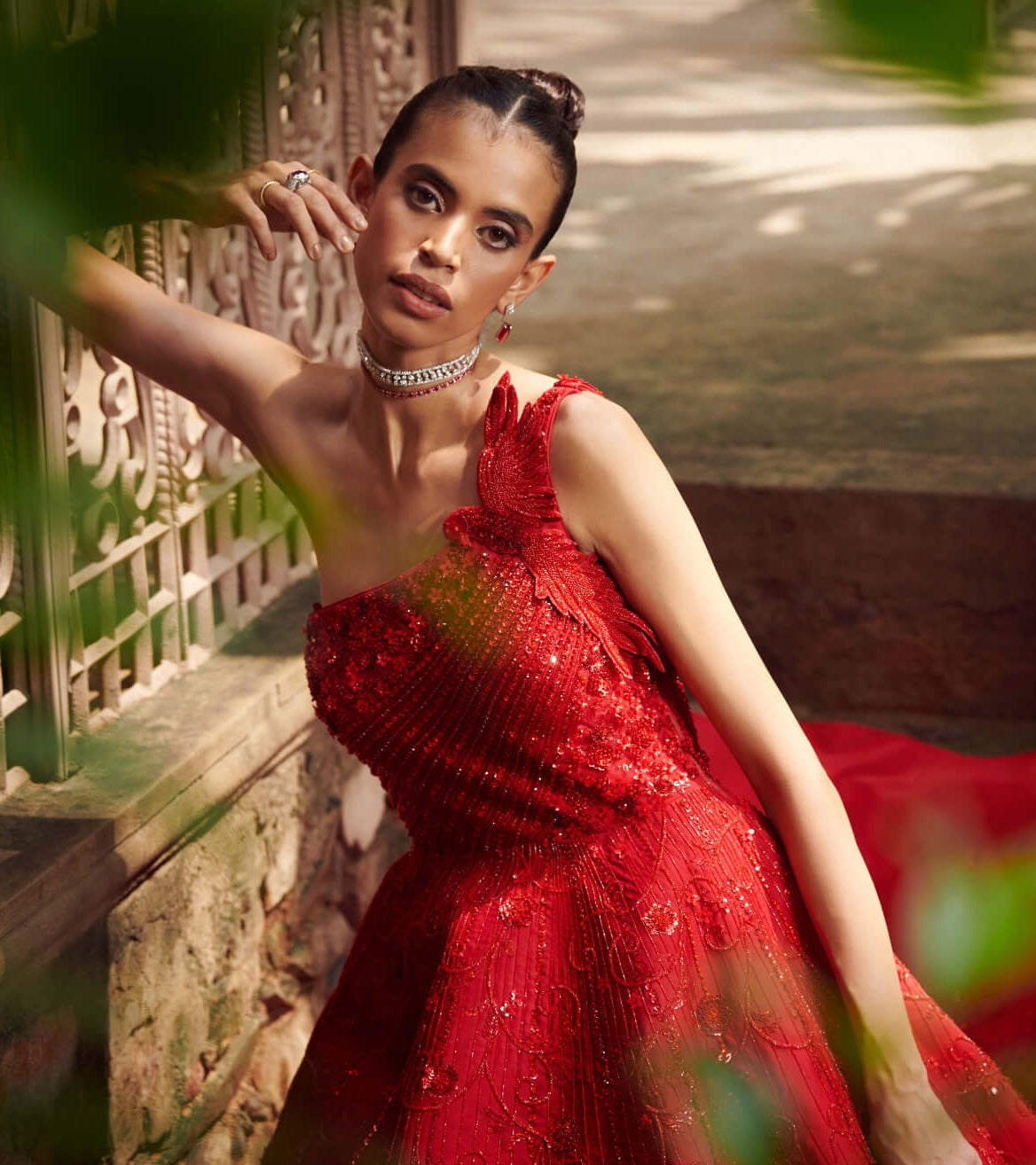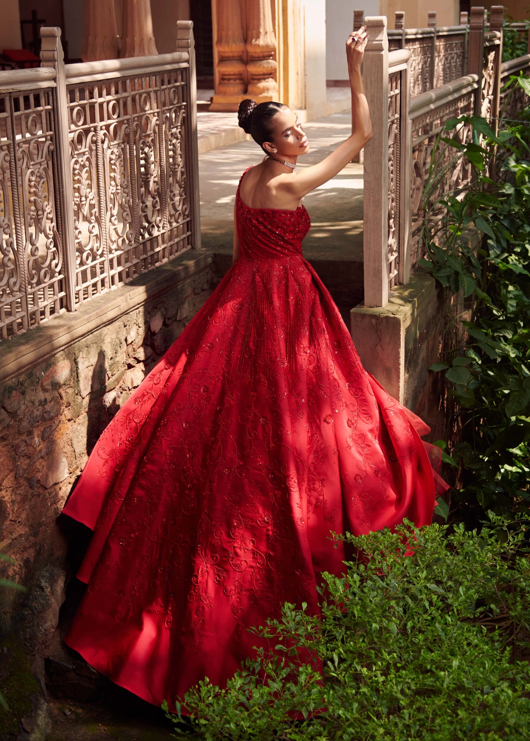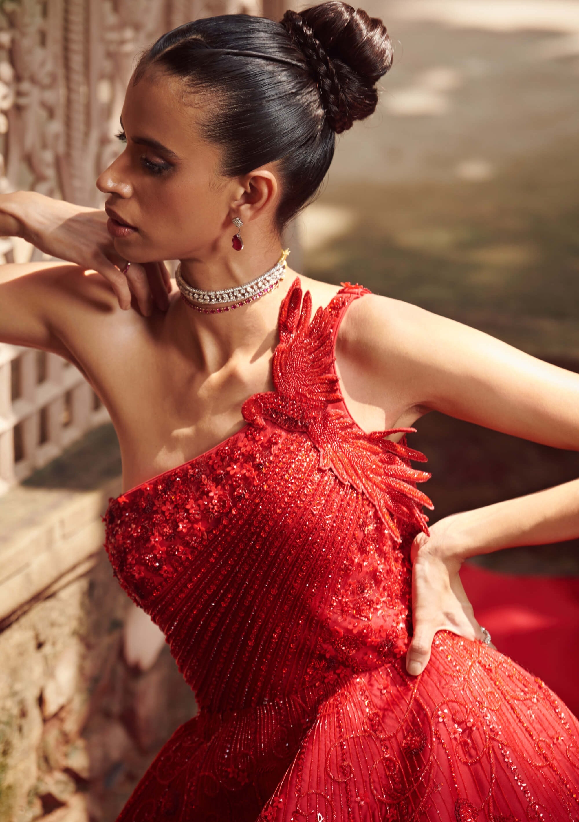 Step into sophistication with this striking red silk gown, crafted from luxurious raw silk. The gown features a unique bird embellishment on the shoulder, adding an artistic touch to the classic design. The rich red hue and elegant detailing make this gown a standout choice for any formal occasion.