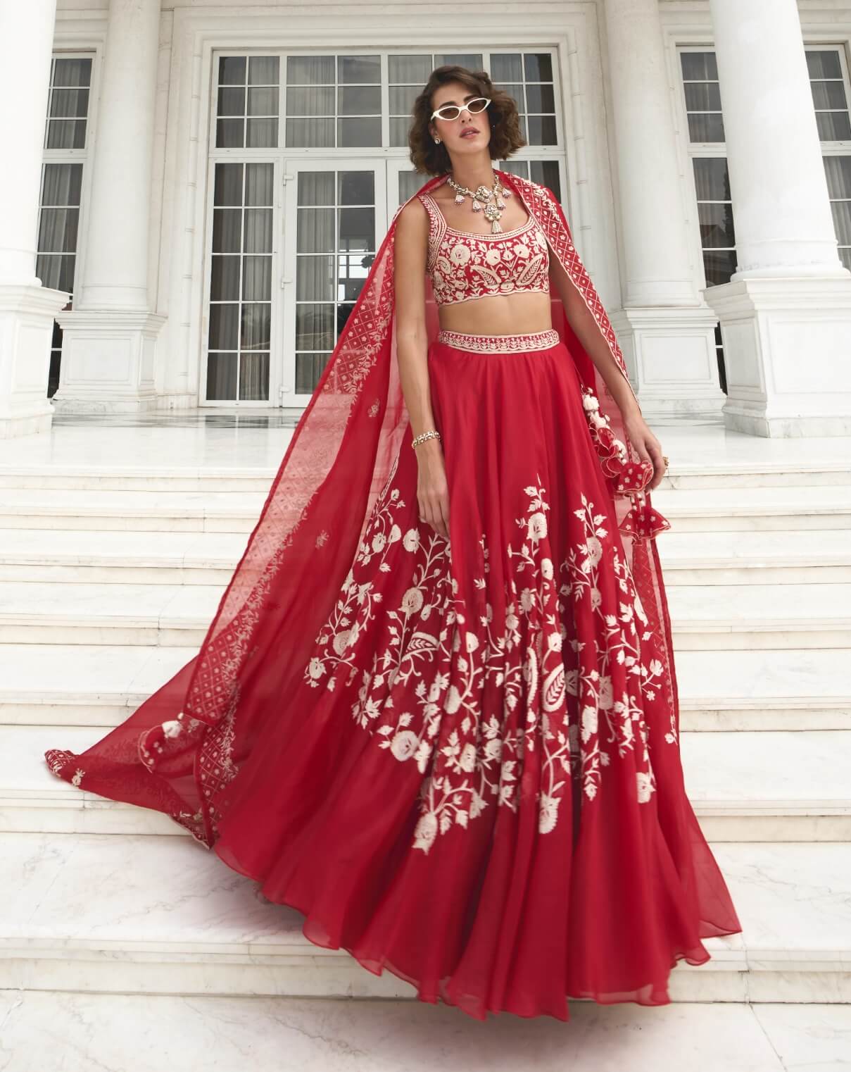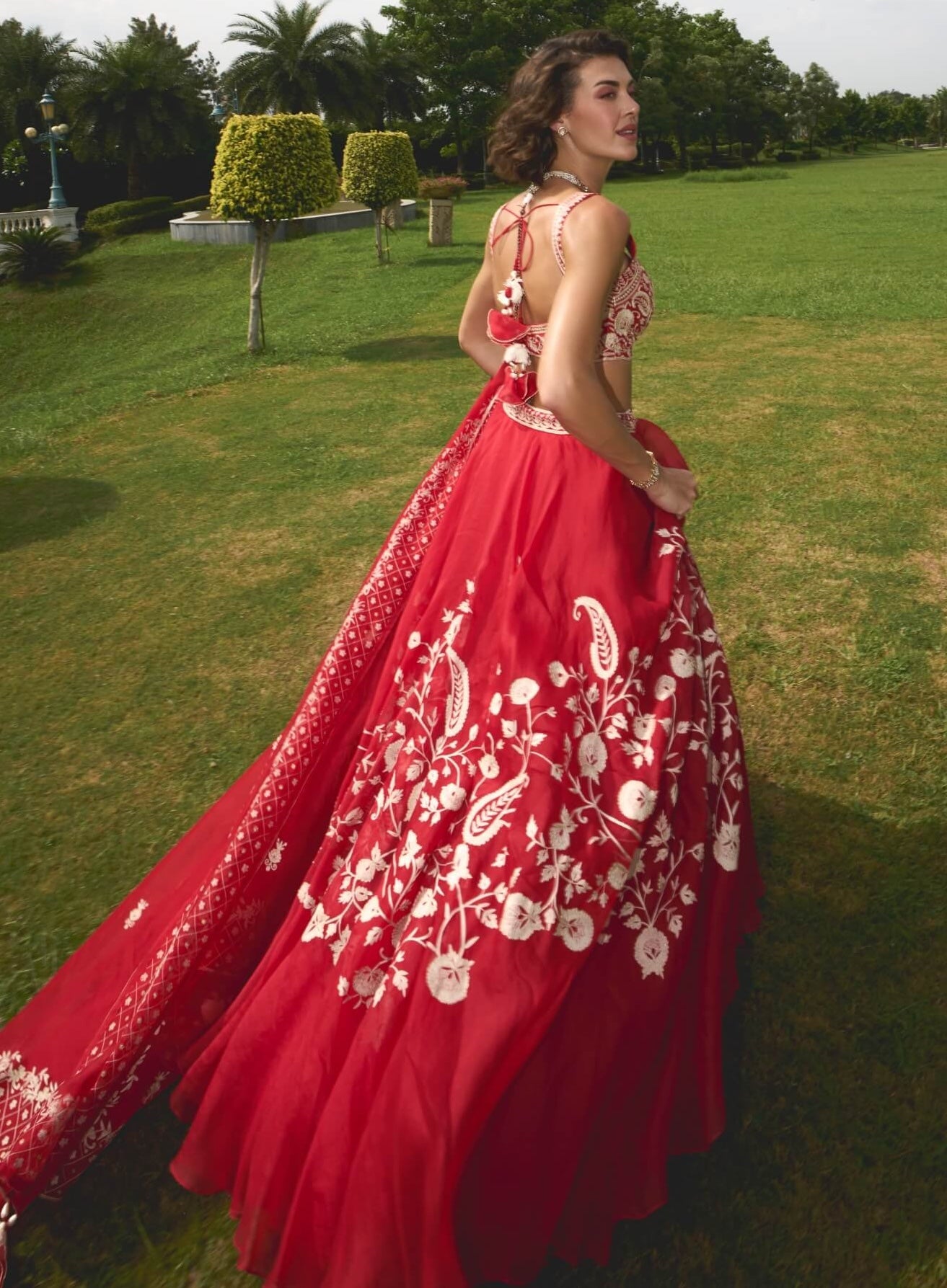 Step into sophistication with our red pure silk organza lehenga, blouse, and dupatta set, a stunning ensemble that exudes elegance. The lehenga and blouse showcase exquisite floral jaal aari work embroidery, crafted with intricate resham and zari threads that create a rich, textured look. This beautifully detailed work adds a luxurious touch to the vibrant red silk organza.