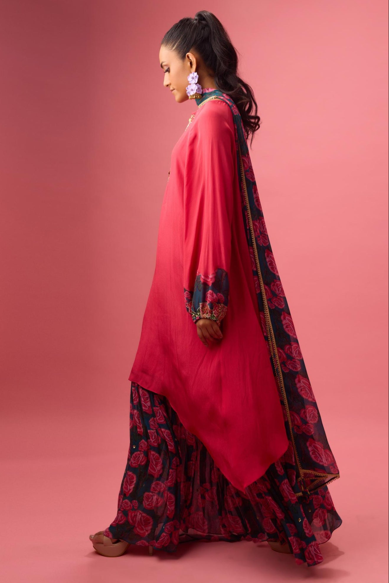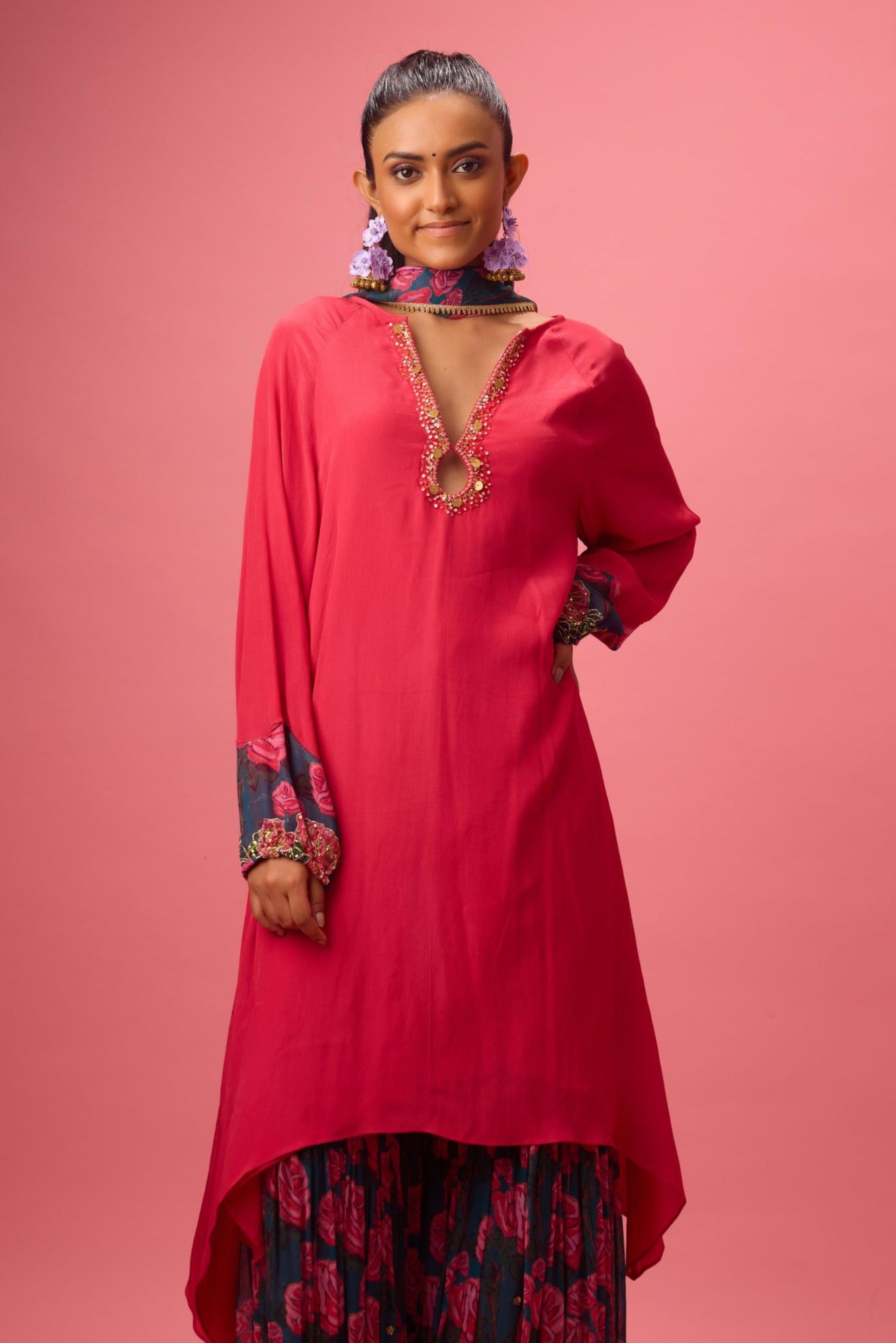 Red watermelon solid crepe asymmetrical handwork kurta paired with printed sharara and dupatta