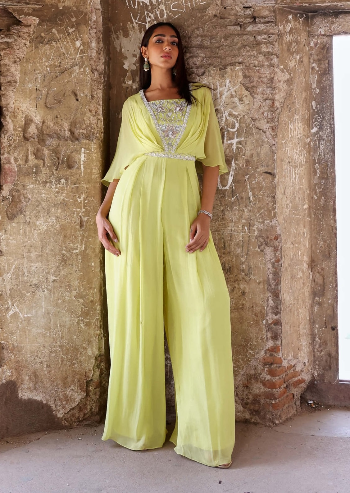 The renell neon green pleated draped jumpsuit features a stunning embellished bodice that adds a touch of glamour to the design. With its flowing silhouette and vibrant hue, this jumpsuit offers a perfect blend of modern elegance and comfort, making it an ideal choice for special occasions and stylish events. Elevate your wardrobe with this eye-catching piece that ensures a standout look.