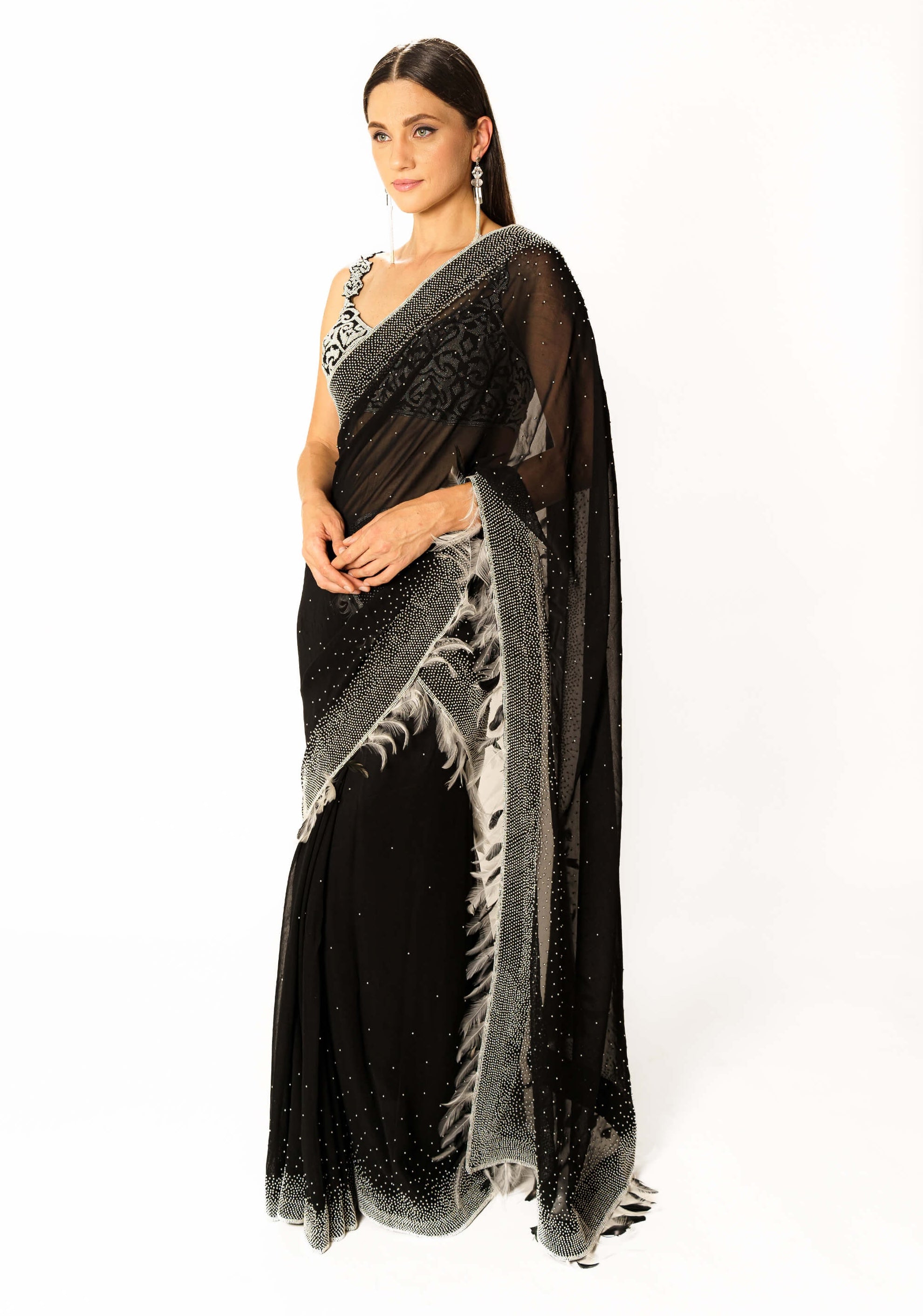 Adding to its unique charm, the saree is adorned with feathers at the drape, creating a dramatic and graceful effect as you move. Perfect for formal events, weddings, and special occasions, the rhea saree set ensures a memorable appearance with its blend of exquisite embroidery and luxurious details.