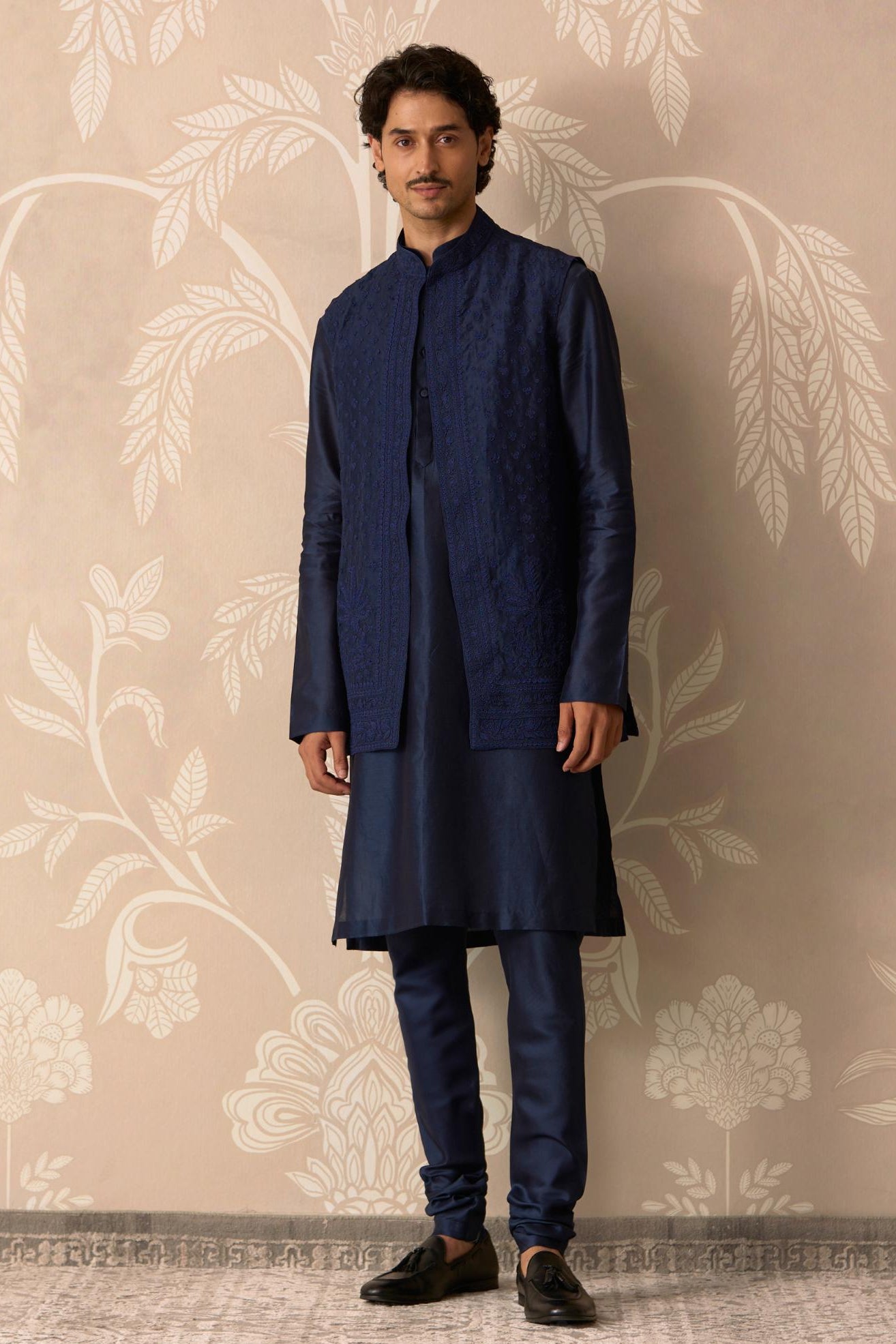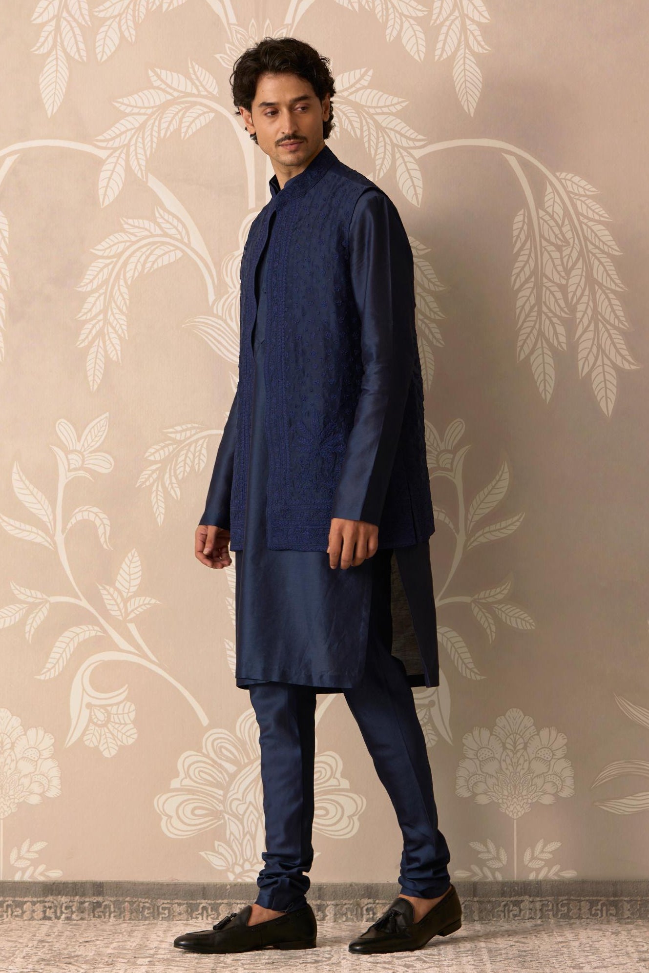 This handsome blue kurta bandi set offers a rich, classic alternative to black or red. The deep blue bandi (Nehru jacket) is paired with a matching kurta and trouser, creating a refined and distinguished look. Ideal for evening events, providing a subtle color statement with traditional structure.