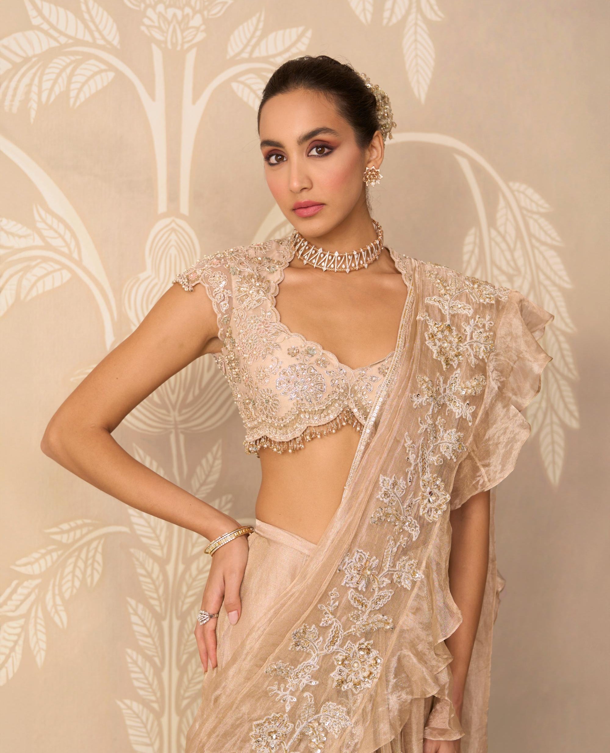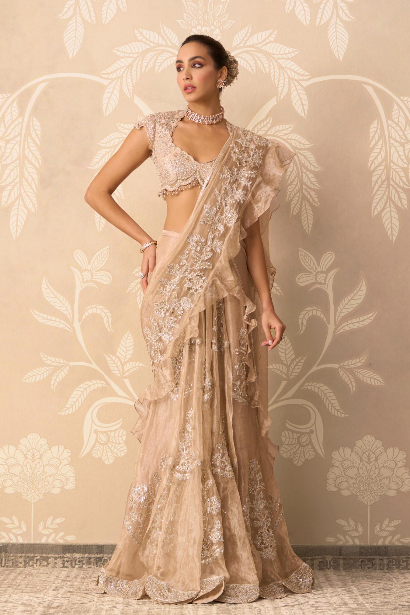 Embrace red-carpet glamour with this magnificent saree gown ensemble. This piece brilliantly combines a tailored blouse with a flowing saree skirt and an attached pallu drape, giving the dramatic appearance of a saree with the structure and ease of a gown. The rich gold hue is instantly luxurious, making it the quintessential choice for high-profile evening events, grand receptions, or glamorous cocktail parties. The architectural precision of the pallu drape by Ridhi Mehra ensures maximum impact. This is the ultimate attire for the woman who demands sophisticated structure and unforgettable elegance, allowing her to move with confidence and poise.