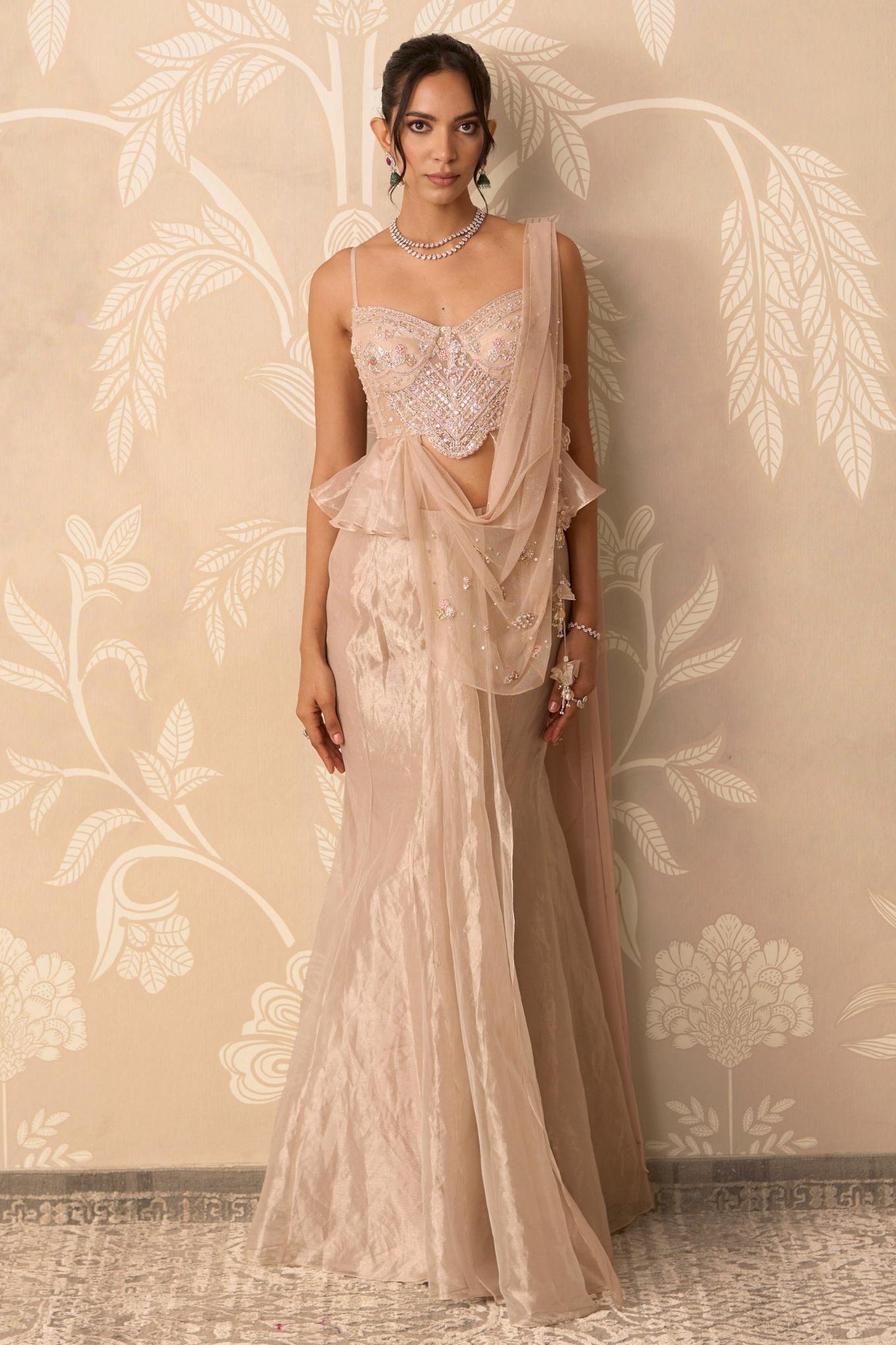 Make a dazzling entrance in the Gold Blouse and Stitched saree skirt ensemble from Ridhi Mehra. This innovative two-piece outfit redefines festive wear by blending the grace of a saree with the structure of a modern skirt. The tailored gold blouse, often adorned with subtle metallic work, pairs flawlessly with the voluminous, ready-to-wear saree skirt. The saree skirt offers unparalleled ease and comfort, making it a highly popular choice for guests who want a traditional look with contemporary convenience. This saree skirt ensures a magnificent silhouette that flows beautifully as you move. Crafted from premium, luxurious materials, this saree skirt is ideal for upscale wedding parties and high-glamour events. The fusion design guarantees uniqueness and compliance with modern dressing codes. Invest in this sophisticated saree skirt to add architectural elegance to your collection.