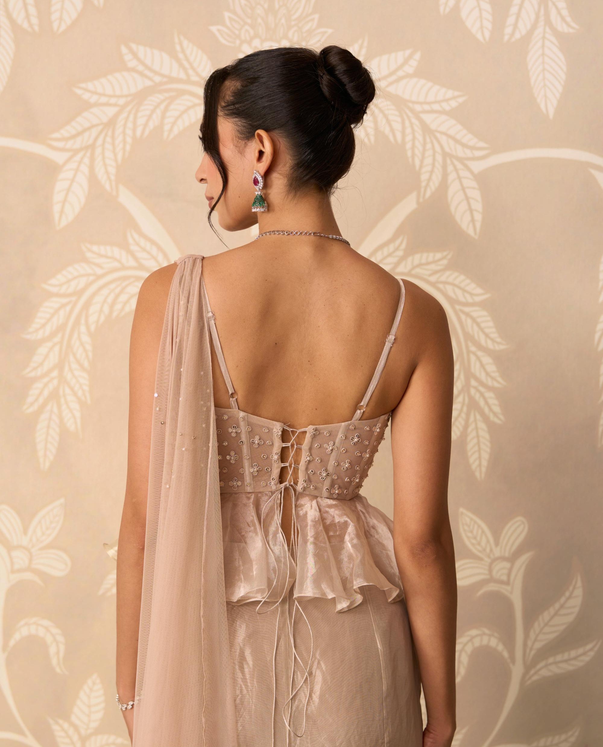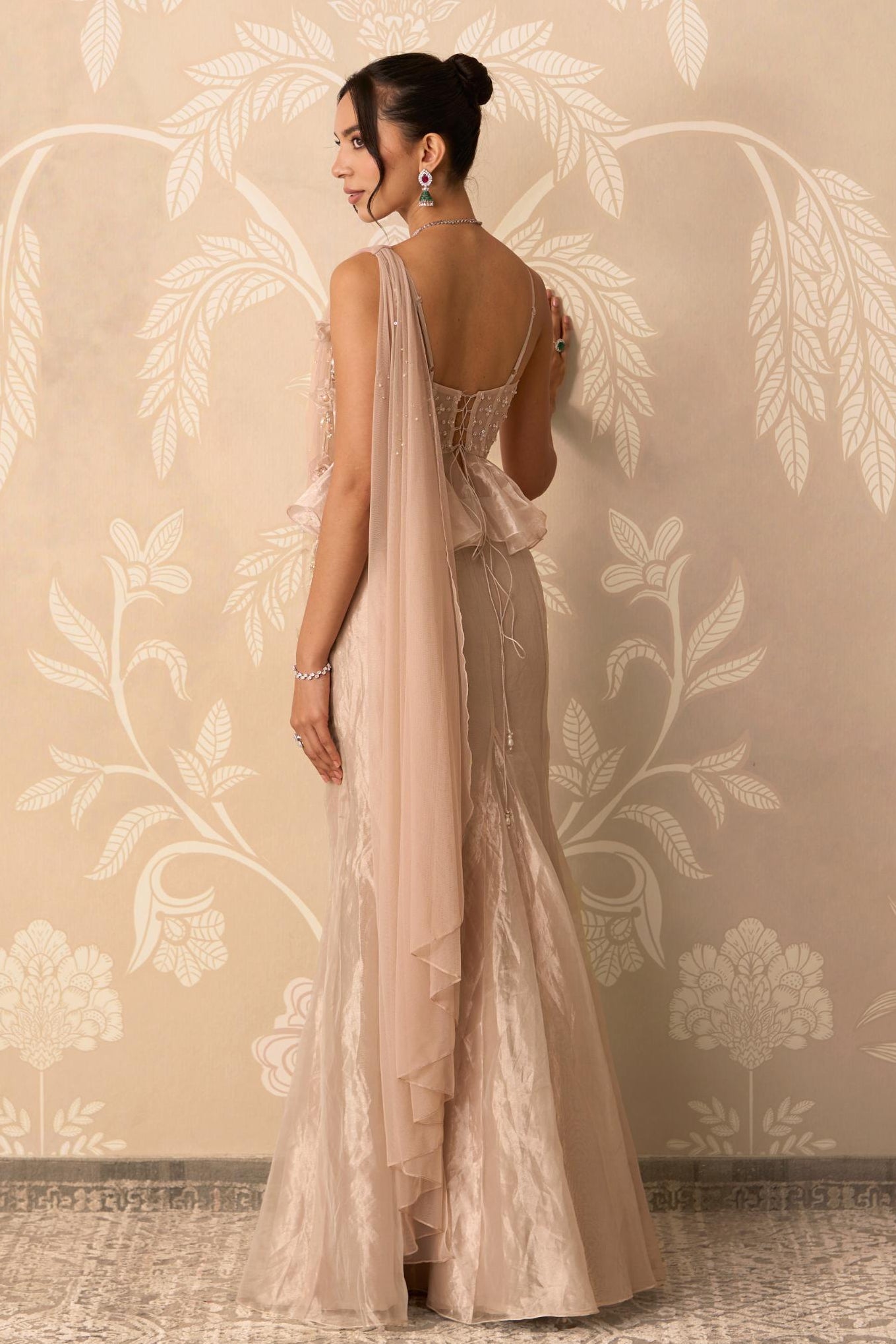 This striking piece is a sophisticated blend of traditional glamour and modern tailoring, featuring a chic gold blouse paired with a meticulously stitched saree skirt. The skirt provides the volume and movement of a saree without the need for intricate draping, making it supremely comfortable and easy to wear. This fusion design is ideal for Sangeet, fusion weddings, or evening cocktail parties where contemporary style is appreciated. The shimmer of the gold blouse beautifully complements the fluid structure of the saree skirt. Ridhi Mehra has created the ultimate celebratory outfit for the woman who loves movement and statement-making elegance.
