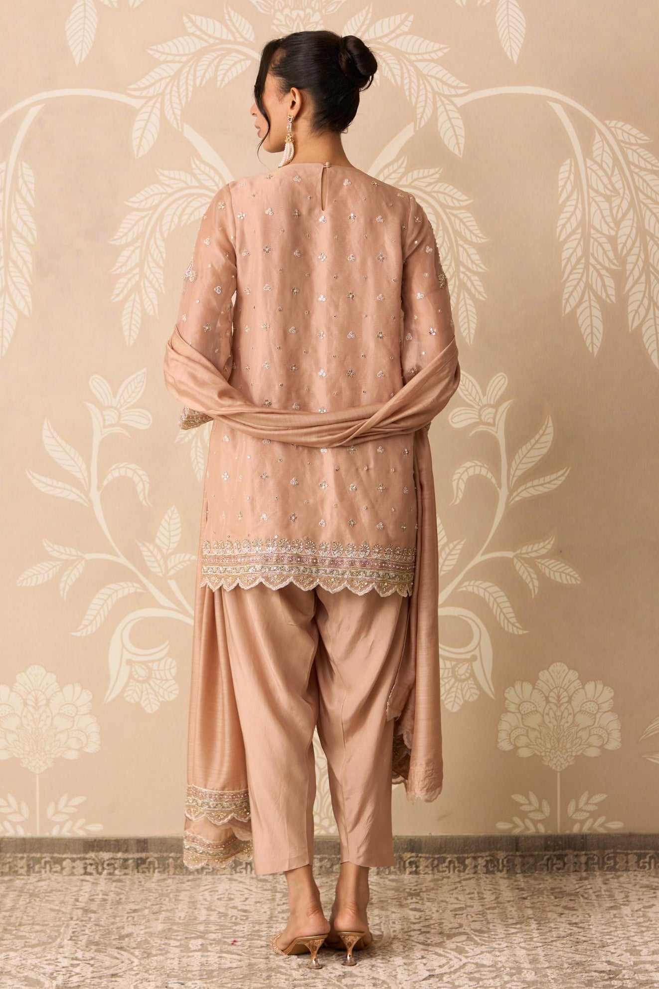 Add a touch of subtle glamour to your festive collection with the Gold kurta set from Ridhi Mehra. This elegant three-piece ensemble is a perfect balance of traditional comfort and festive sophistication. The classic kurta set features a beautifully tailored kurta, a comfortable salwar, and a complementary dupatta.