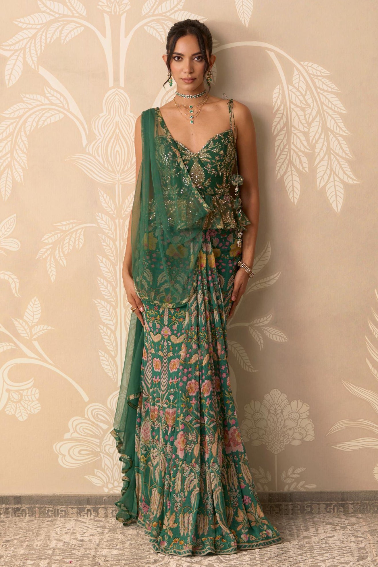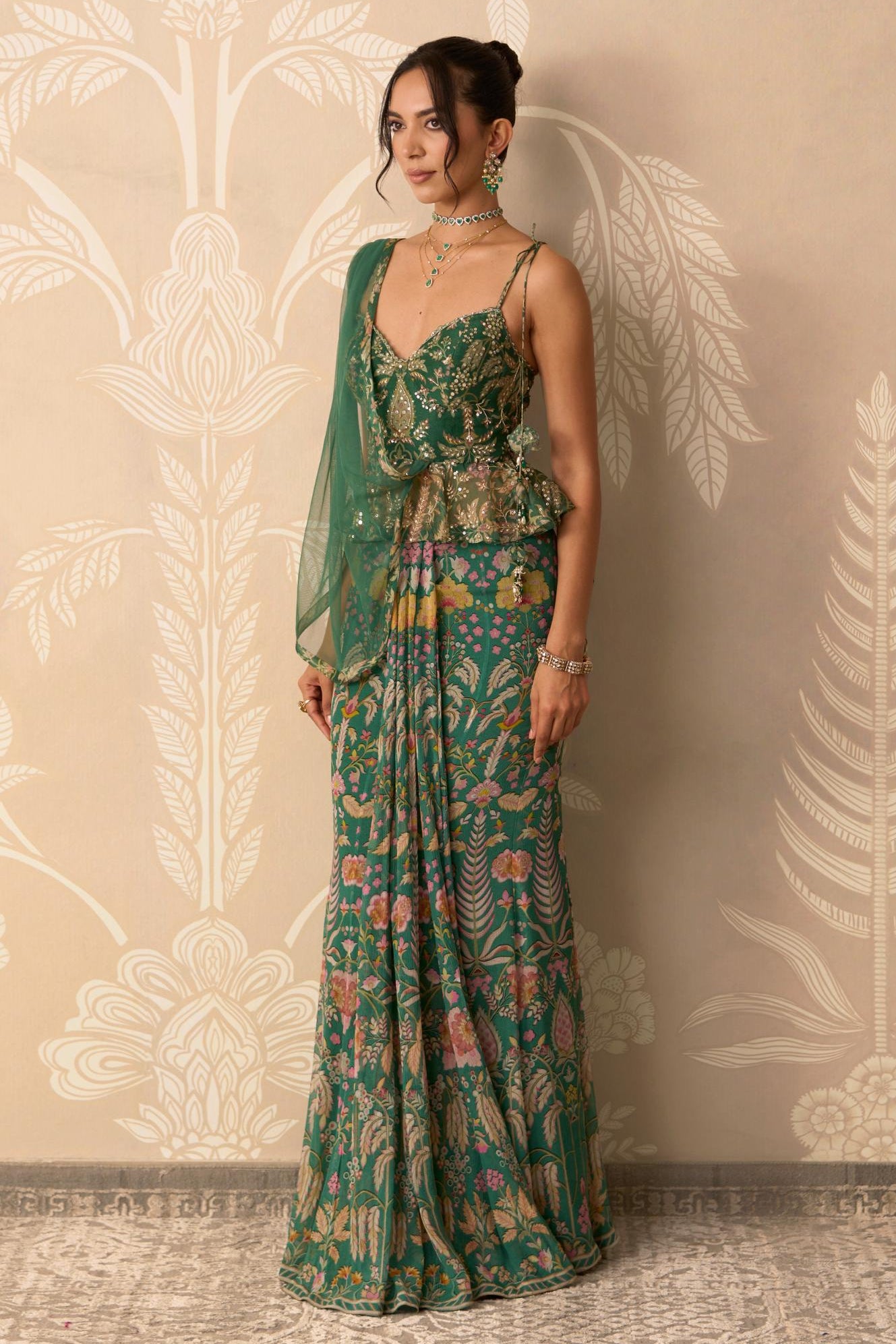 Experience the ultimate in fusion elegance with this stunning ensemble. Featuring a tailored green blouse and a fluid stitched saree skirt with an attached drape, this piece delivers the volume and silhouette of a saree with the structure of a gown. The rich green color is sophisticated and flattering, making it ideal for evening receptions or fashionable cocktail events. The attached drape and stitched saree skirt eliminate any need for complex styling, allowing you to achieve a flawless, high-fashion look instantly. Ridhi Mehra has masterfully combined convenience with couture detailing in this chic, modern outfit.