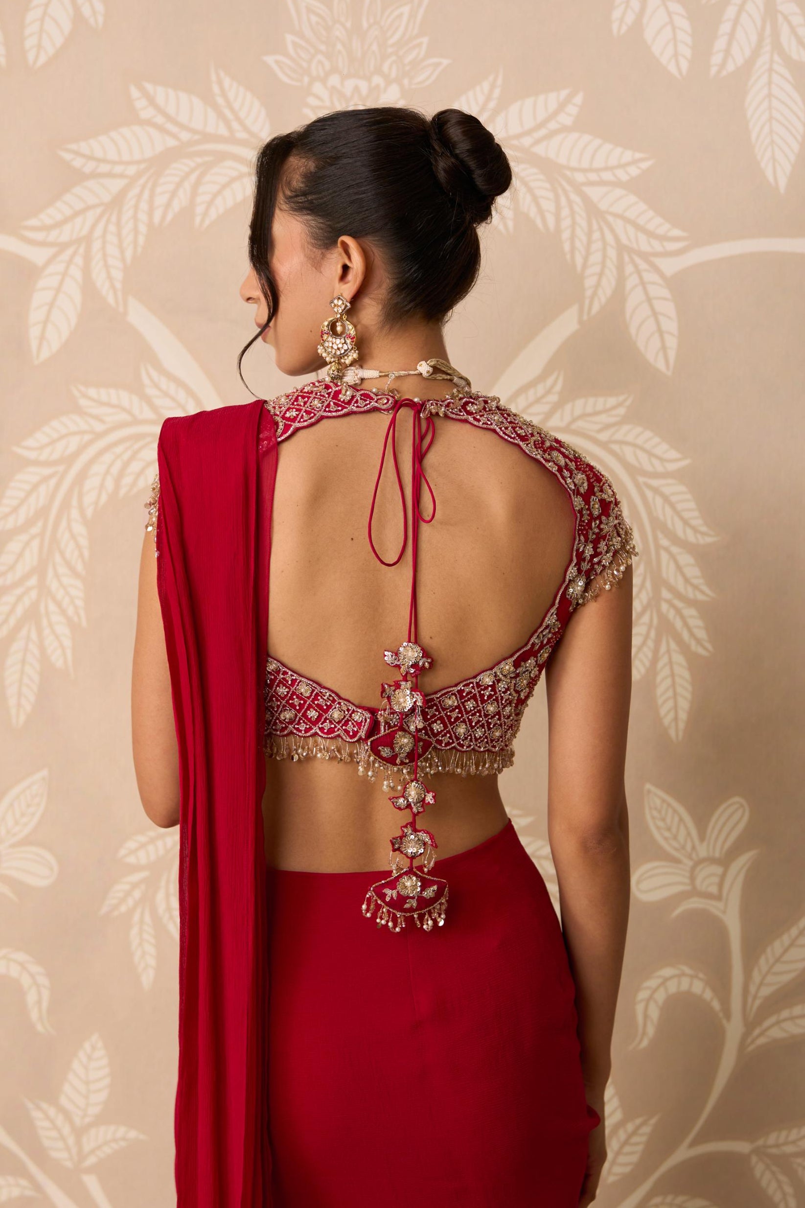 Command attention in this classic yet contemporary red ensemble. Featuring a tailored red blouse and a perfectly structured pre-draped saree, this piece is designed for maximum impact. The vibrant red is a traditional power color in Indian celebrations, making it an excellent choice for a wedding reception or a grand Diwali party. The convenience of the pre-draped saree silhouette ensures a magnificent, ready-to-wear look that feels both luxurious and effortless. Ridhi Mehra's attention to structured tailoring guarantees a flattering fit. This outfit is ideal for the guest who appreciates a flawless drape and a bold, unforgettable statement.