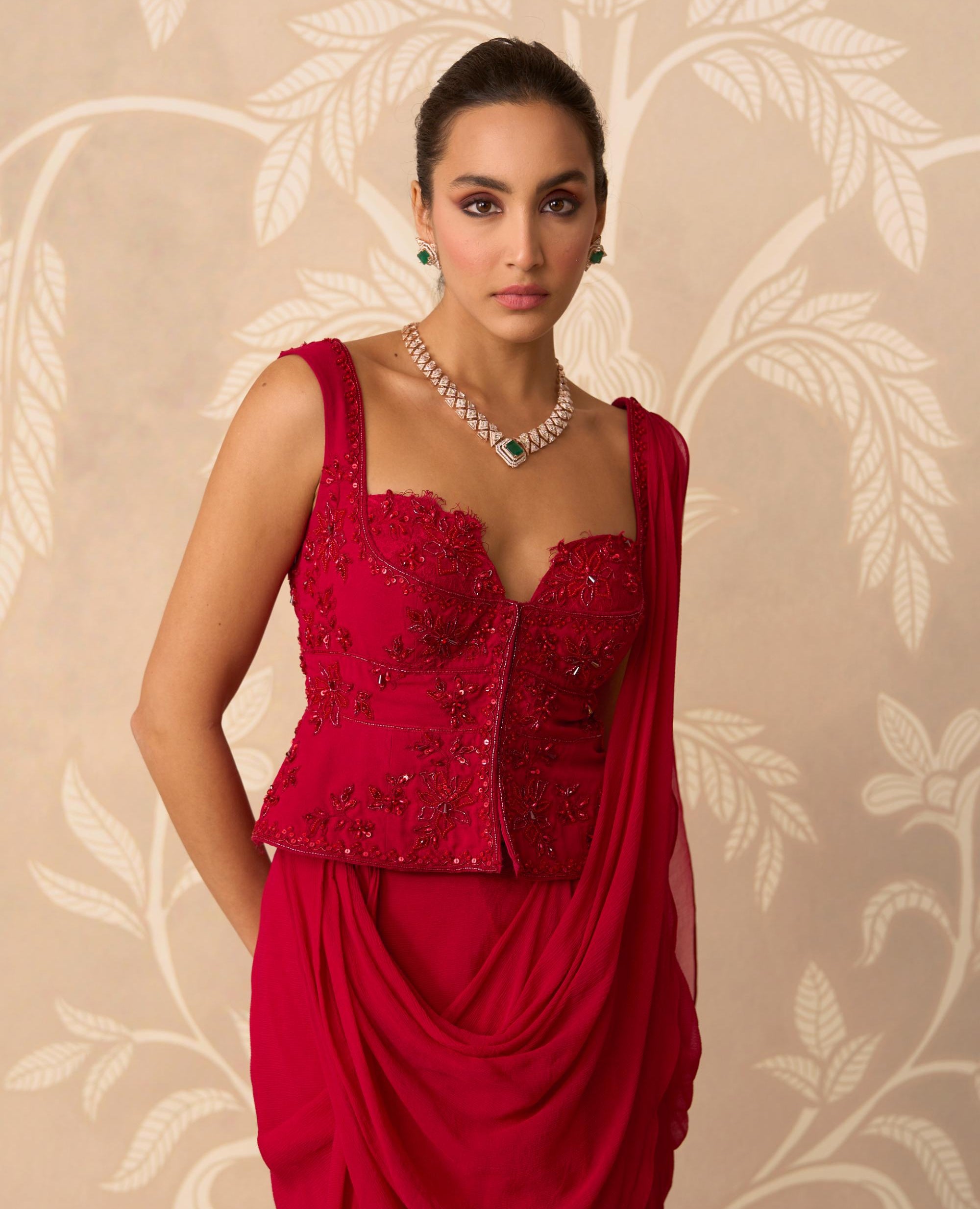 Step into the spotlight with the breathtaking Red Long Blouse and draped saree ensemble by Ridhi Mehra. This outfit is meticulously crafted for the woman who desires a blend of iconic Indian artistry and contemporary runway sensibility. The elegant, elongated blouse provides a modern canvas for subtle detailing, contrasting beautifully with the voluminous, sweeping silhouette of the draped saree. This draped saree is designed for maximum impact with minimal effort, offering a comfortable fit that doesn't compromise on luxury. The vibrant red color is universally flattering and perfectly suited for grand celebratory occasions. We've ensured the fabric choice for this draped saree is premium, allowing the garment to flow and move with grace. Its construction guarantees a perfect drape every time, making wardrobe malfunction a non-issue. Perfect for the main wedding ceremony or an engagement party, this sophisticated draped saree will quickly become the most cherished piece in your ethnic wear collection. Experience the ease and luxury of a perfectly styled draped saree for your next big event.