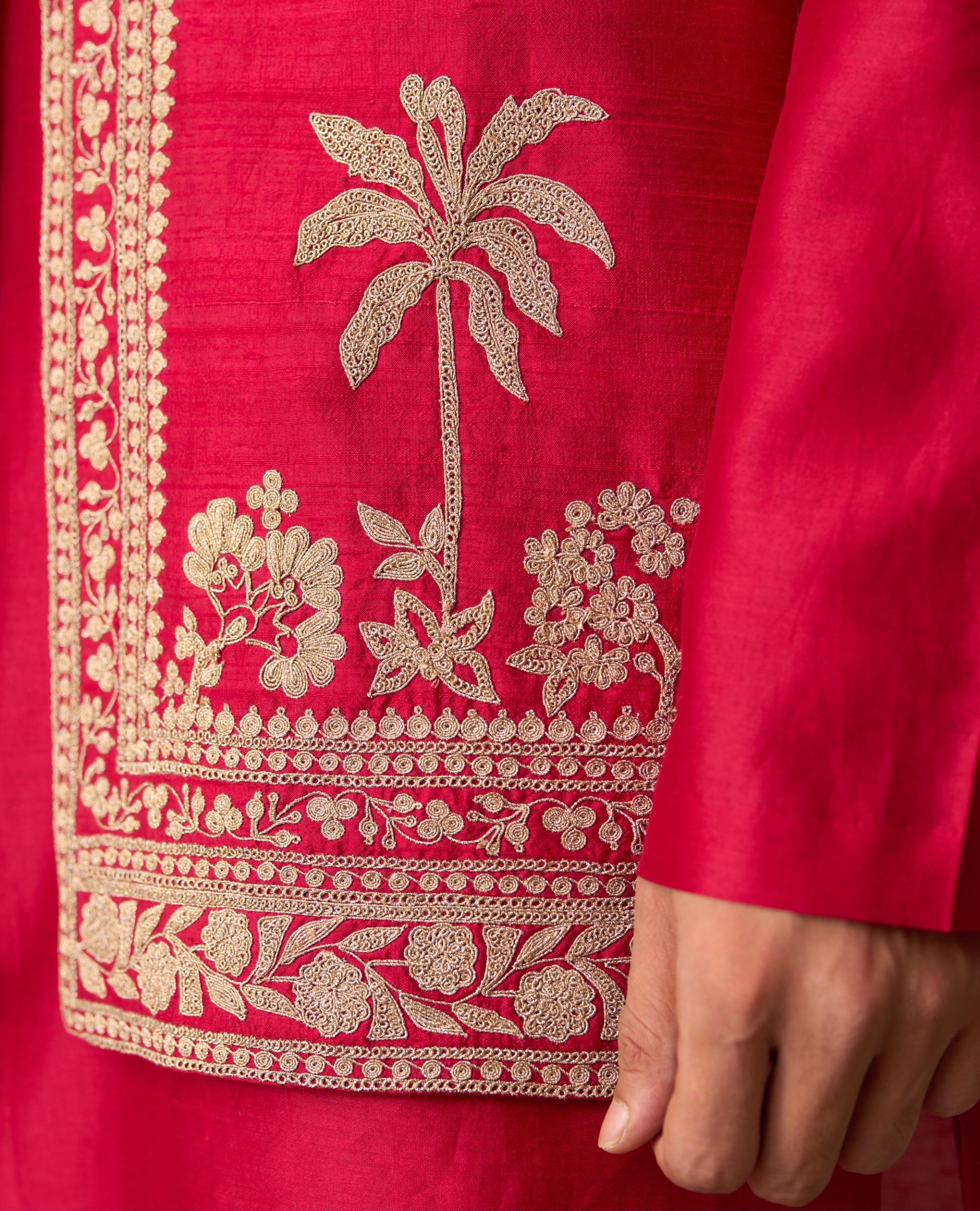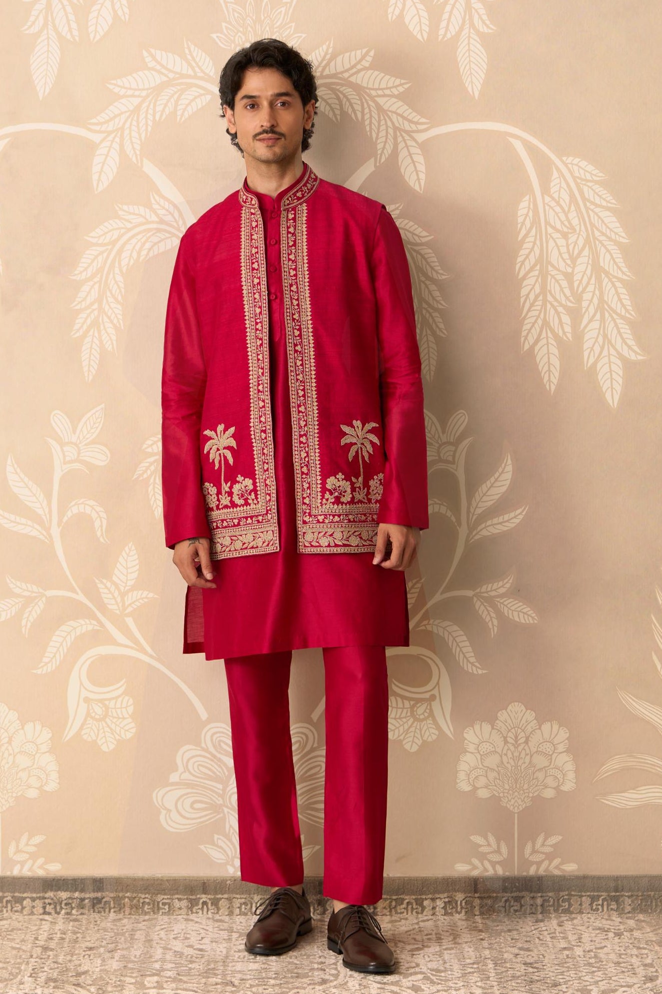 Invest in exquisite texture with the Red Raw Silk Bandi and Kurta Set from Ridhi Mehra. The rich raw silk fabric of the red raw silk bandi provides a luxurious, structured drape, ensuring a commanding and traditional look at the most important celebrations.