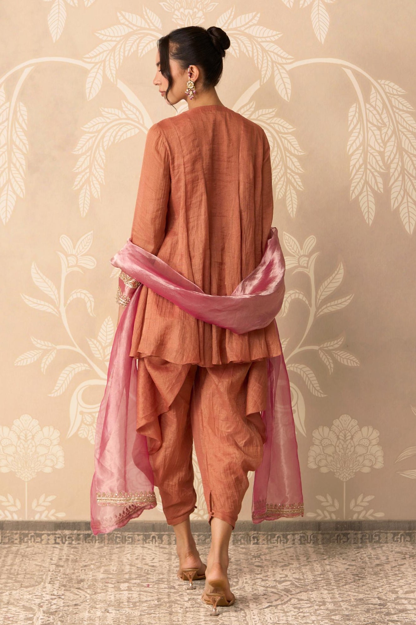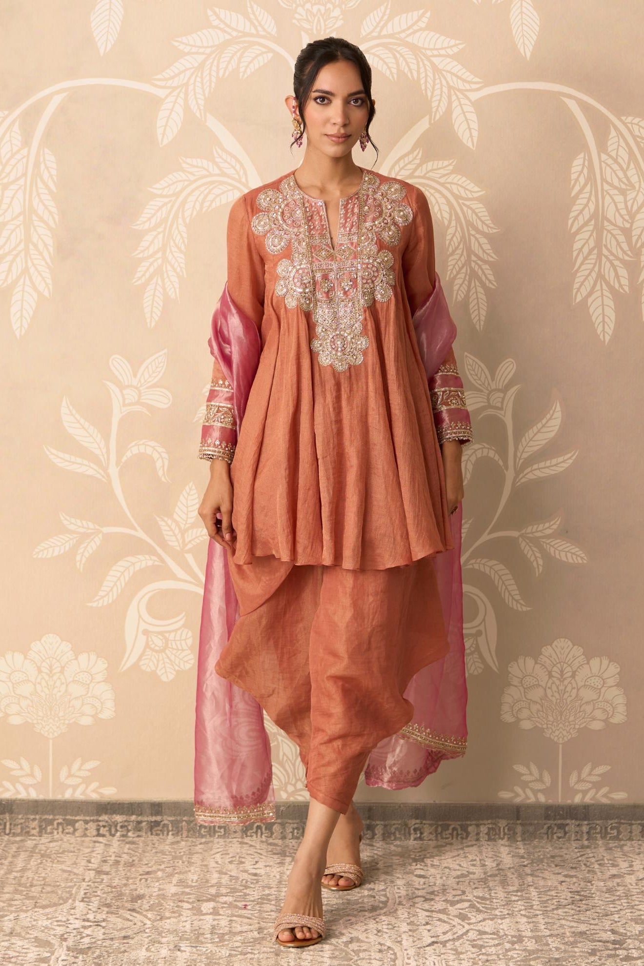Brighten any occasion with the Vibrant orange kurta set from Ridhi Mehra. This delightful three-piece ensemble is defined by its stunning, high-energy orange hue, making it a perfect choice for celebratory daytime functions. The tailored kurta and contemporary drape salwar ensure a flattering fit.