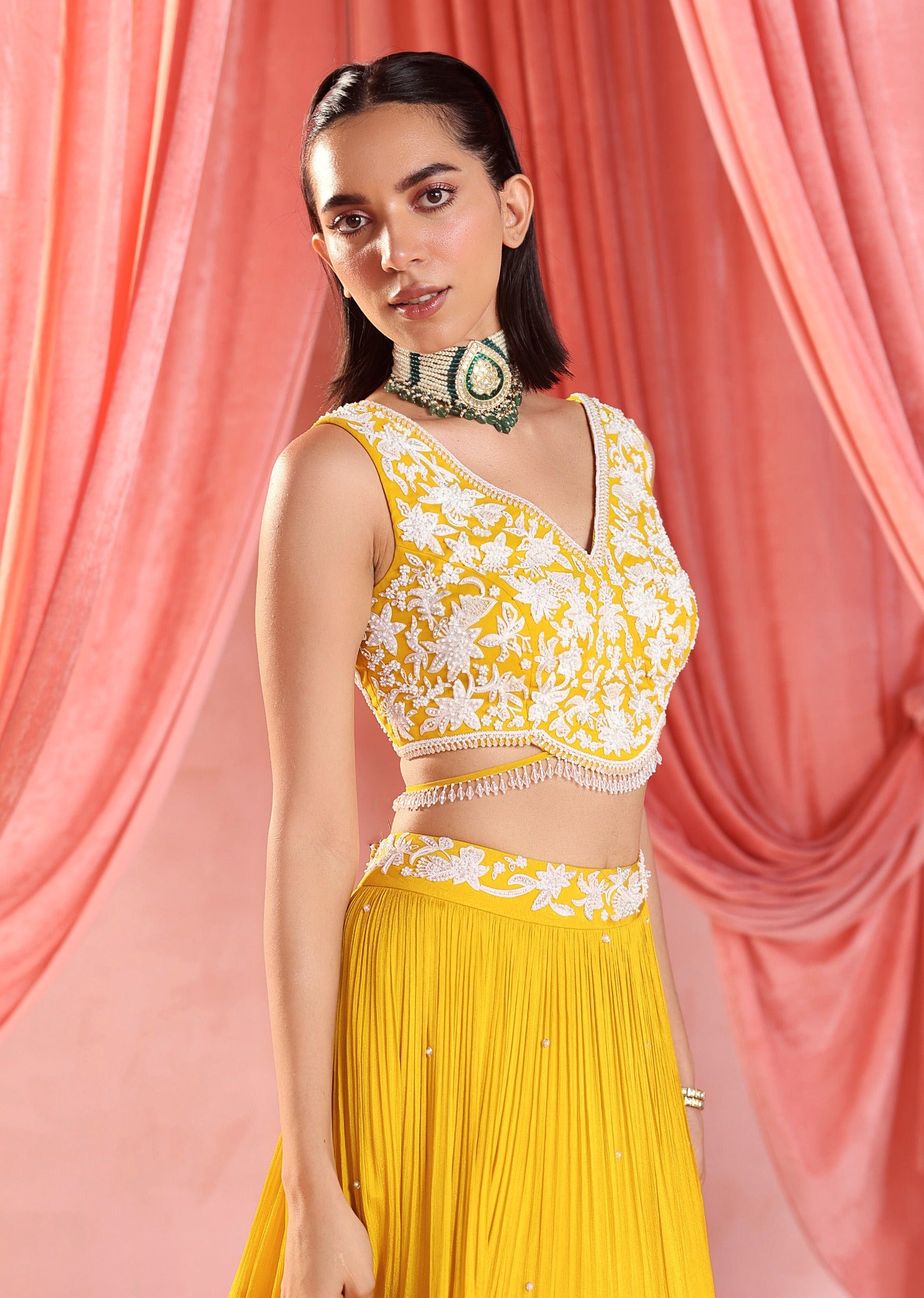 Embroidery: Machine and hand embroidery with resham thread, sequins, beads, glass beads, pearls and crystals.