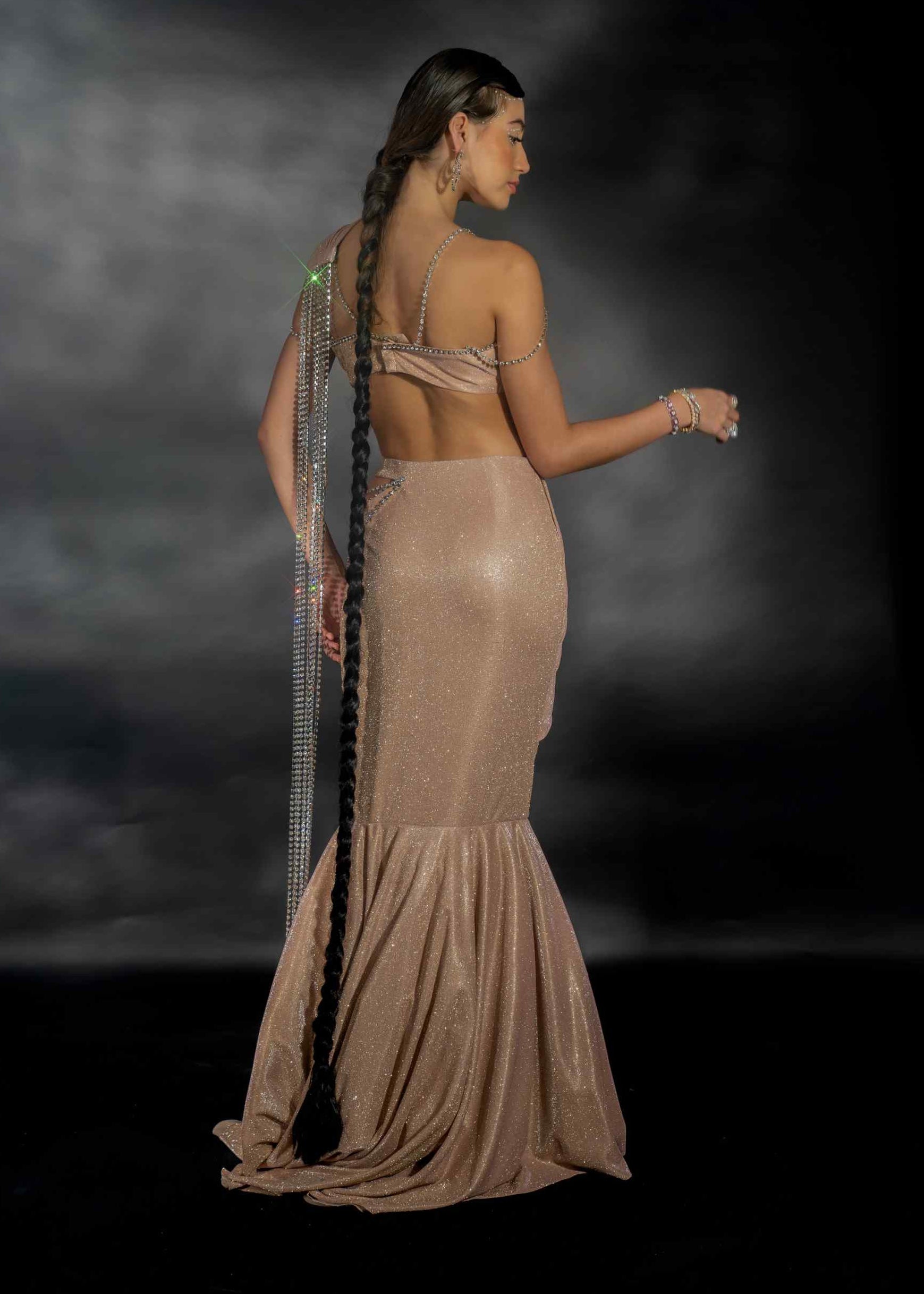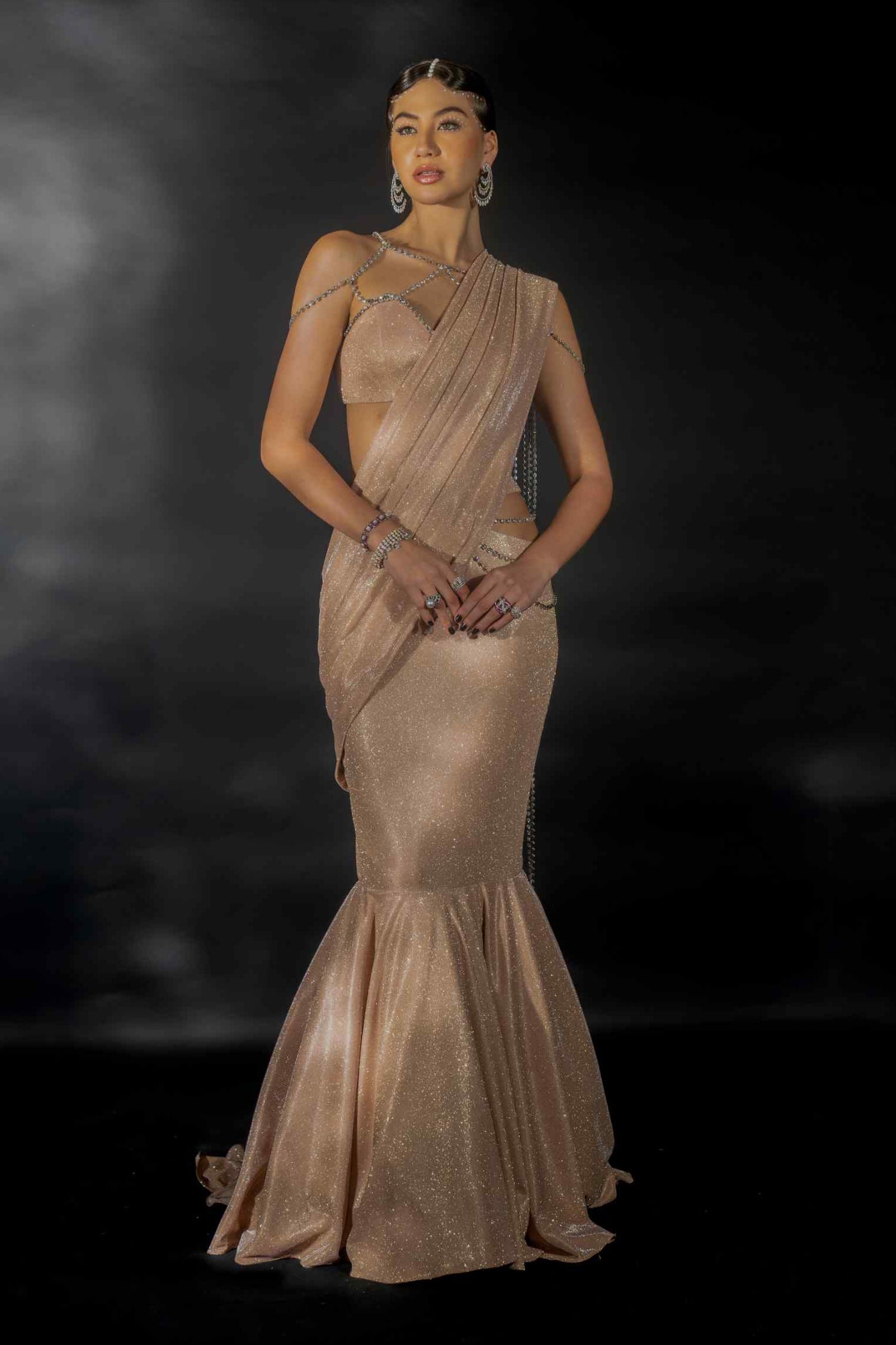 Step into sophistication with our rose gold fishtail lehenga saree, exquisitely adorned with diamond strings. The lehenga saree features a luxurious rose gold fabric that shimmers with every movement, creating a radiant and elegant look. The fishtail silhouette enhances the drama and allure, while the diamond strings provide a dazzling touch of sparkle and refinement. Ideal for weddings, gala events, or festive celebrations, this ensemble effortlessly combines modern glamour with timeless grace, ensuring you make a stunning impression on any occasion.