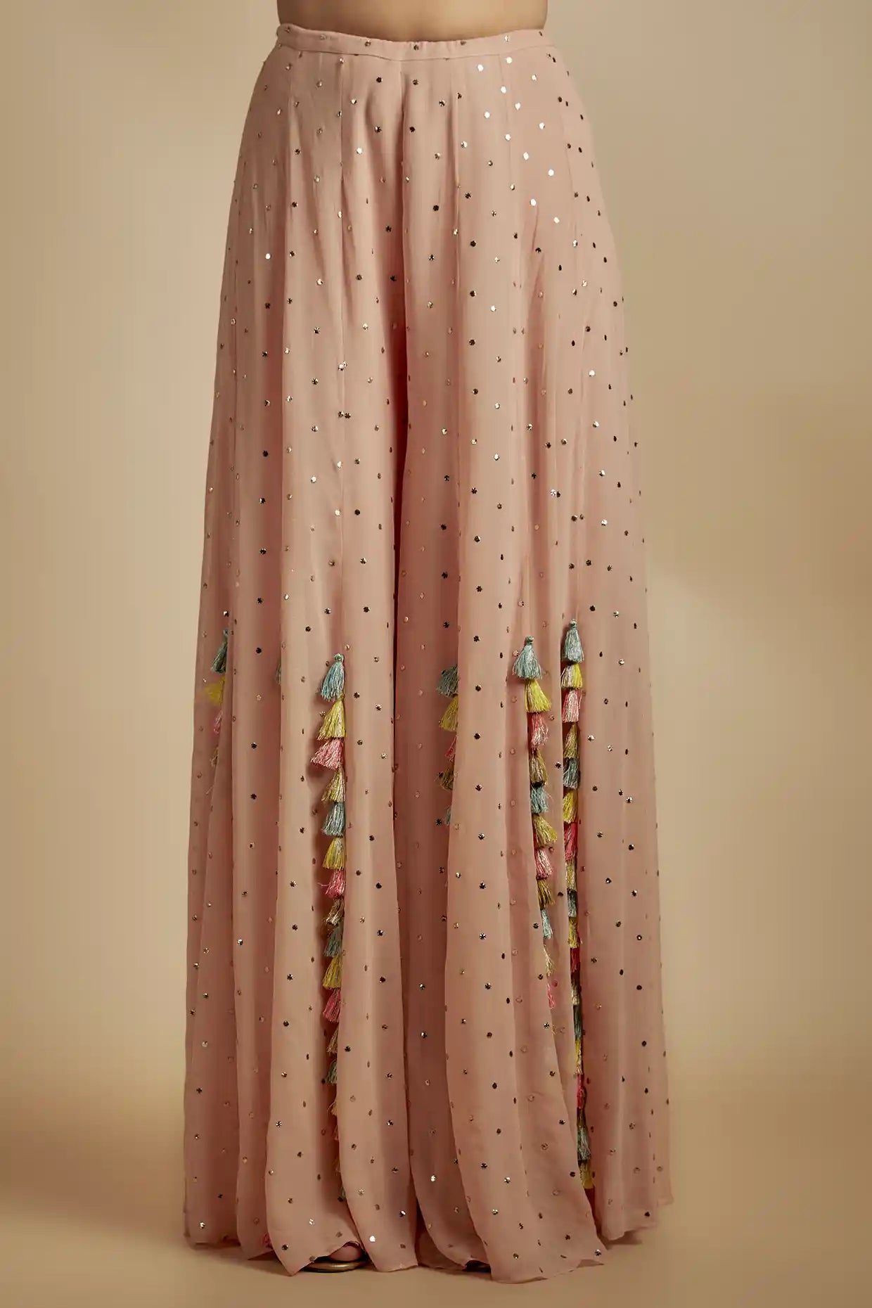 Embrace elegance with this rose pink georgette embroidered back tie-up choli, beautifully paired with a flowing mukaish georgette sharara. The intricate embroidery on the choli adds a delicate charm, while the back tie-up design enhances the flattering silhouette. The sharara drapes gracefully, providing both comfort and style. Perfect for festive occasions and special celebrations, this ensemble effortlessly blends traditional allure with modern sophistication, ensuring you make a memorable impression at any event.