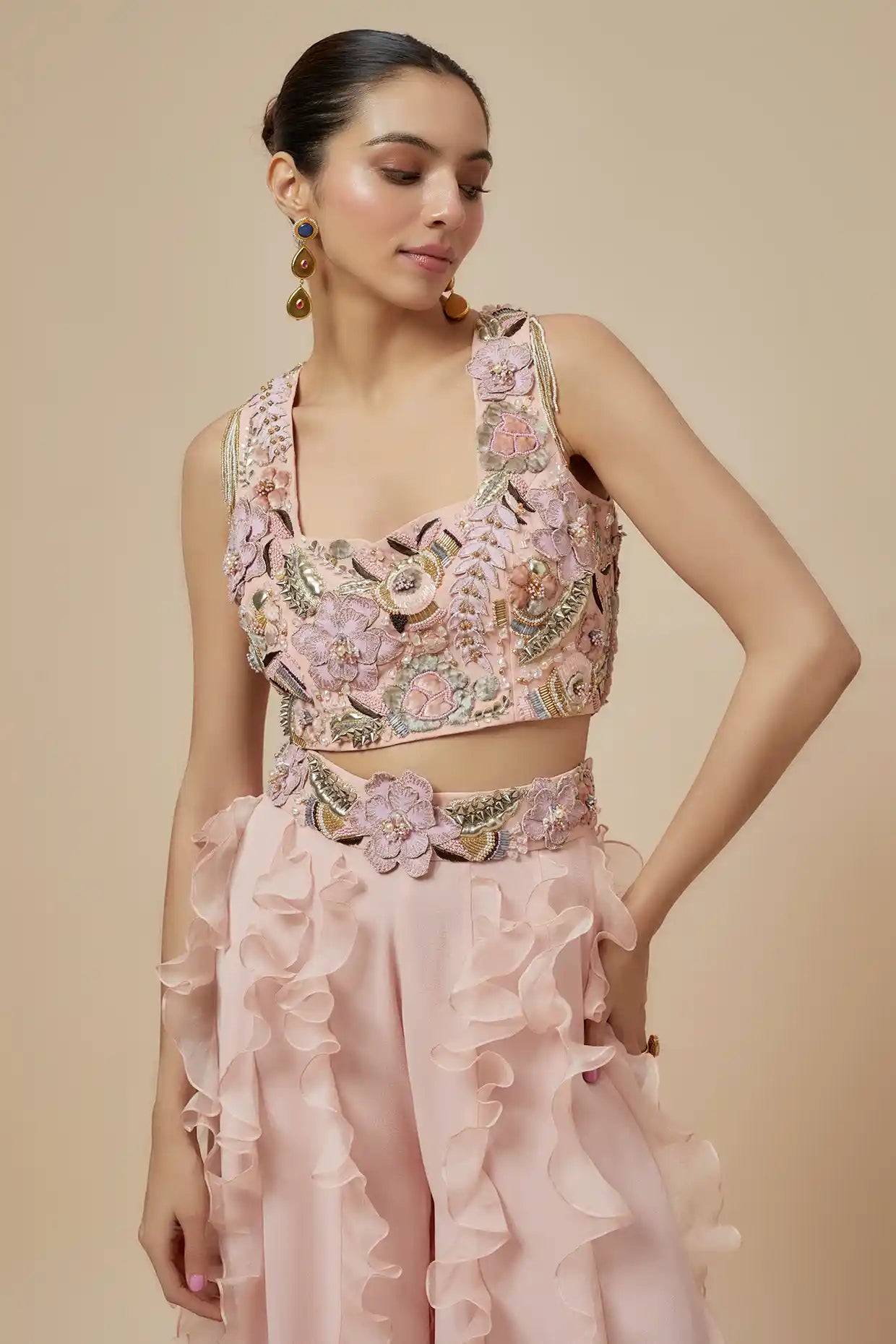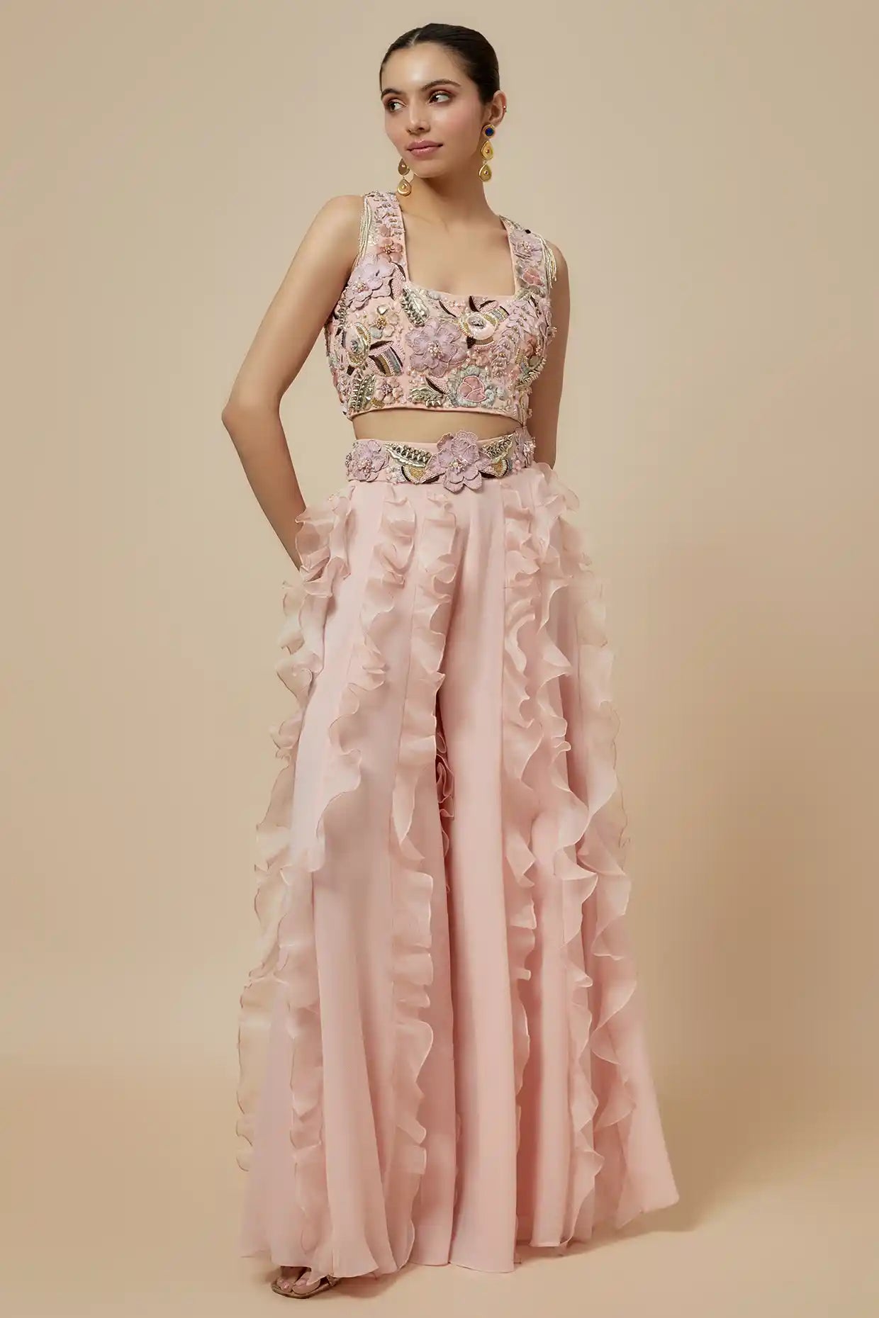 Elevate your style with this rose pink georgette embroidered back tie-up choli, beautifully complemented by an organza ruffled georgette sharara. The intricate embroidery on the choli adds a touch of elegance, while the ruffled sharara brings a playful and modern twist. Perfect for festive occasions and special celebrations, this ensemble combines traditional charm with contemporary flair, ensuring you make a stunning impression.