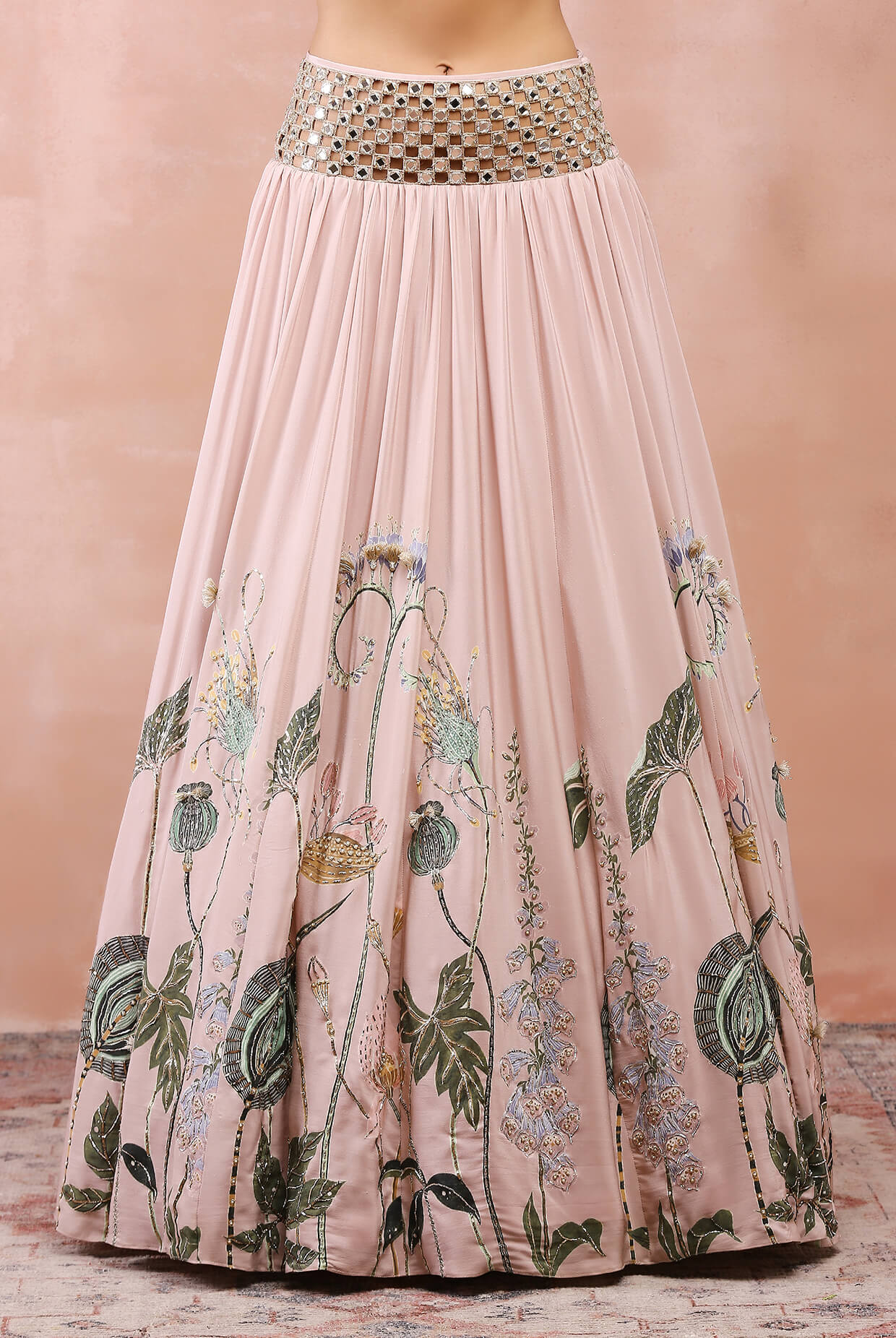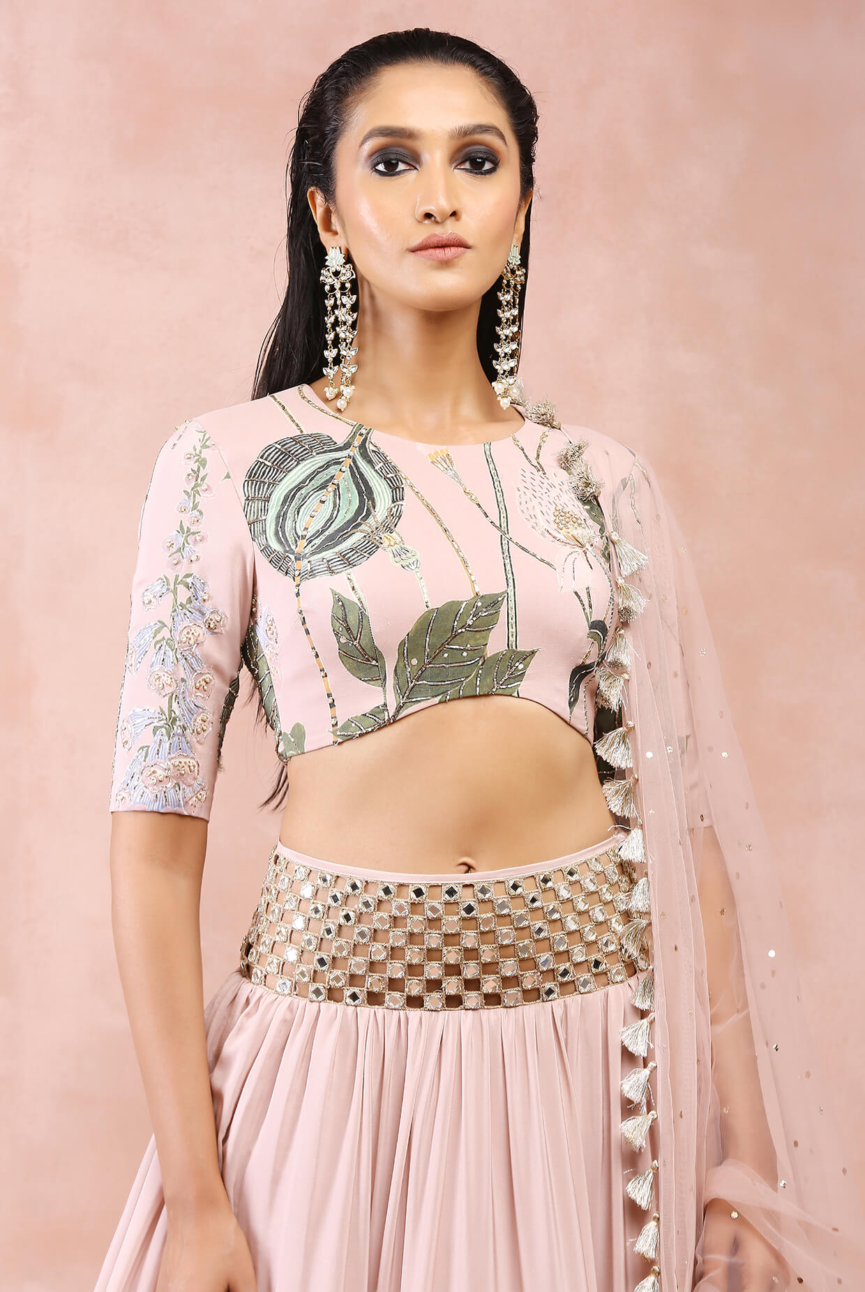 Immerse yourself in timeless elegance with our Rose Pink Niloufar Print Crepe Choli and Lehenga Set. The choli, adorned with a delicate niloufar print and exquisite embroidery, pairs flawlessly with a flowing lehenga. The ensemble is accentuated by a cutwork embroidered belt that adds a touch of sophistication and a mukaish net dupatta for a hint of shimmering allure. Perfect for weddings and festive occasions, this set combines traditional grace with contemporary style.