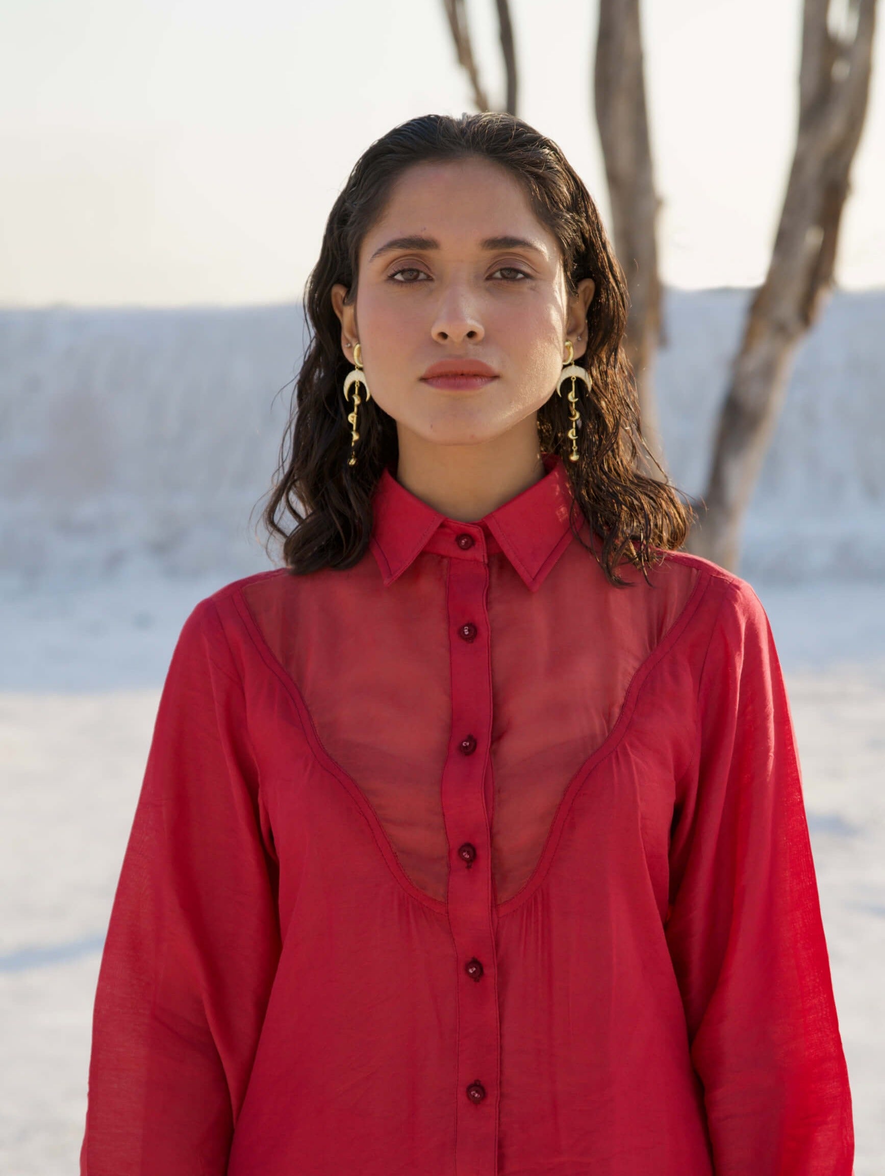 Discover casual chic with our versatile red co-ord set. The statement piece is a button-down shirt featuring a curved hem and balloon sleeves, with an abstract sheer yoke neckline at the front and sheer details on the cuffs. Adding a unique touch, our patent charkha is delicately embroidered at the shirt's bottom. This set includes comfortable silk pants in a matching shade, complete with side pockets for added functionality. Perfect for effortlessly stylish looks, this co-ord set blends comfort with contemporary flair.