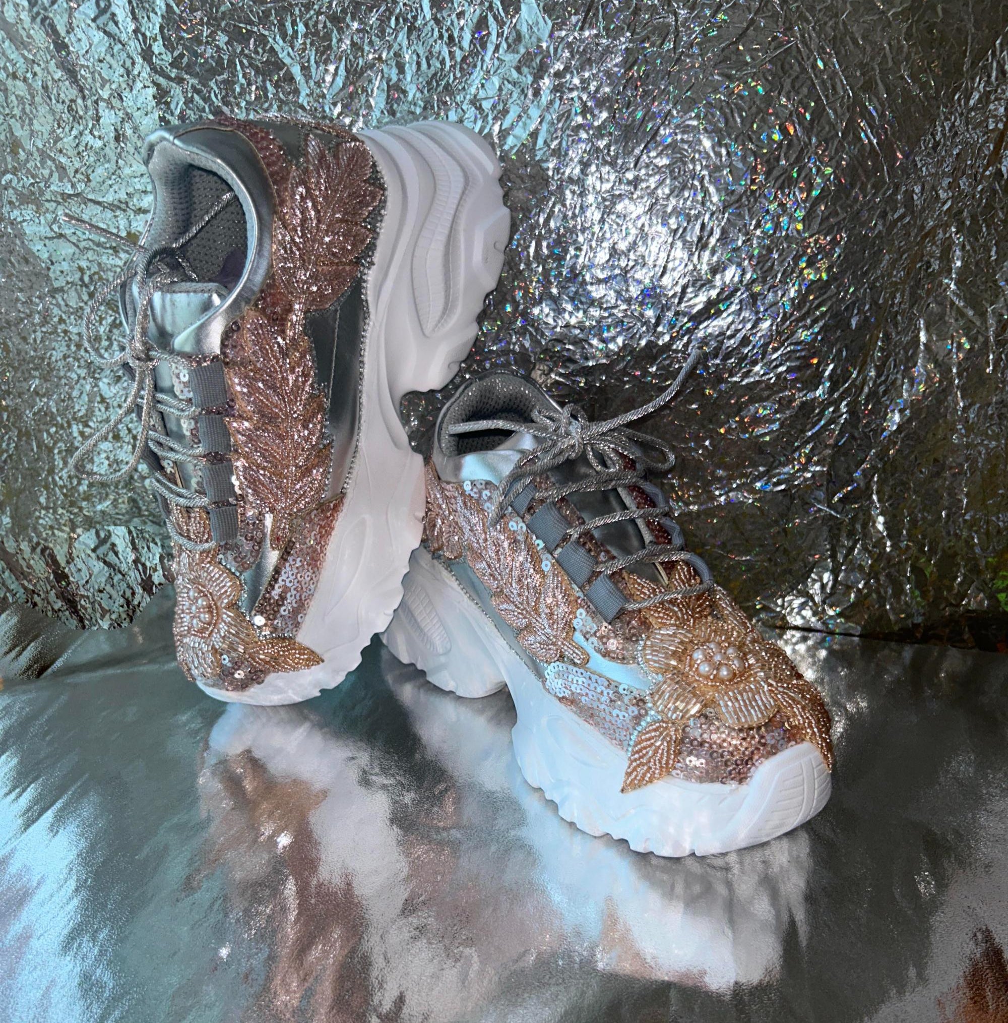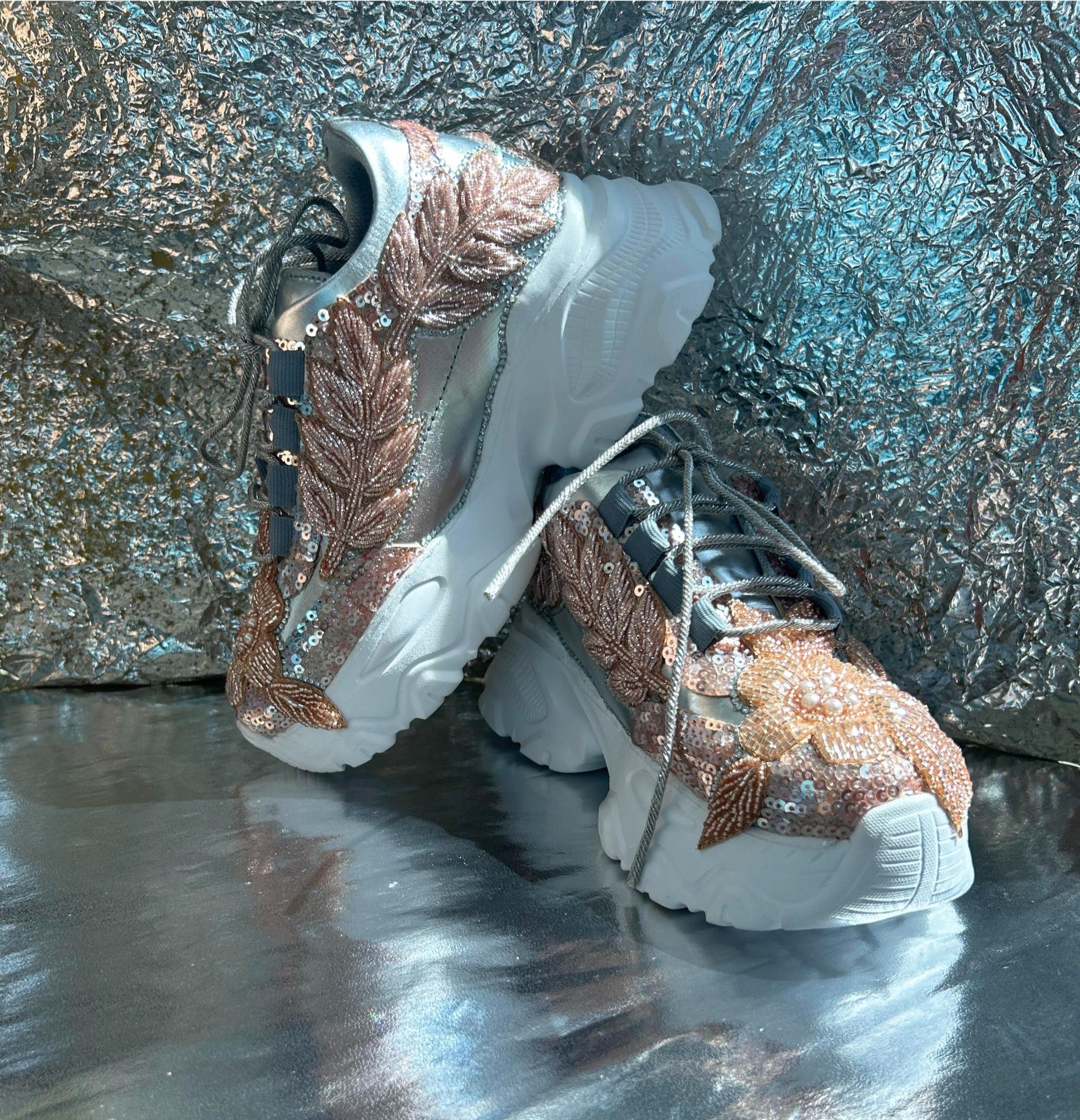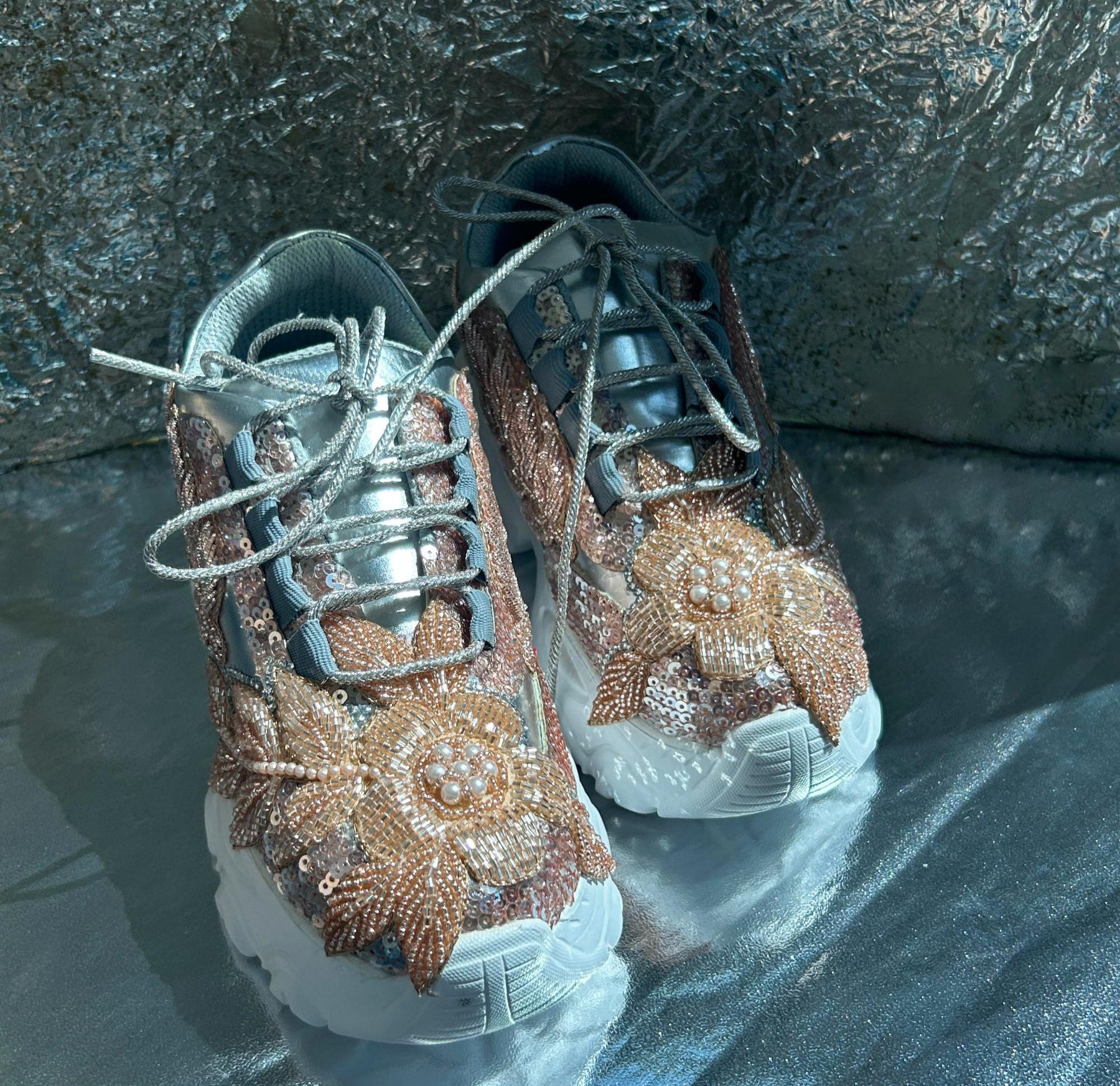 A stunning blend of couture craftsmanship and unmatched comfort, these statement sneakers showcase intricate floral and leaf embroidery adorned with rose gold sequins, delicate pearls, and shimmering beads. Designed for the modern bride and fashion-forward trendsetters, they are the perfect choice for weddings, sangeet nights, engagements, and festive soirees ensuring you shine with every step.