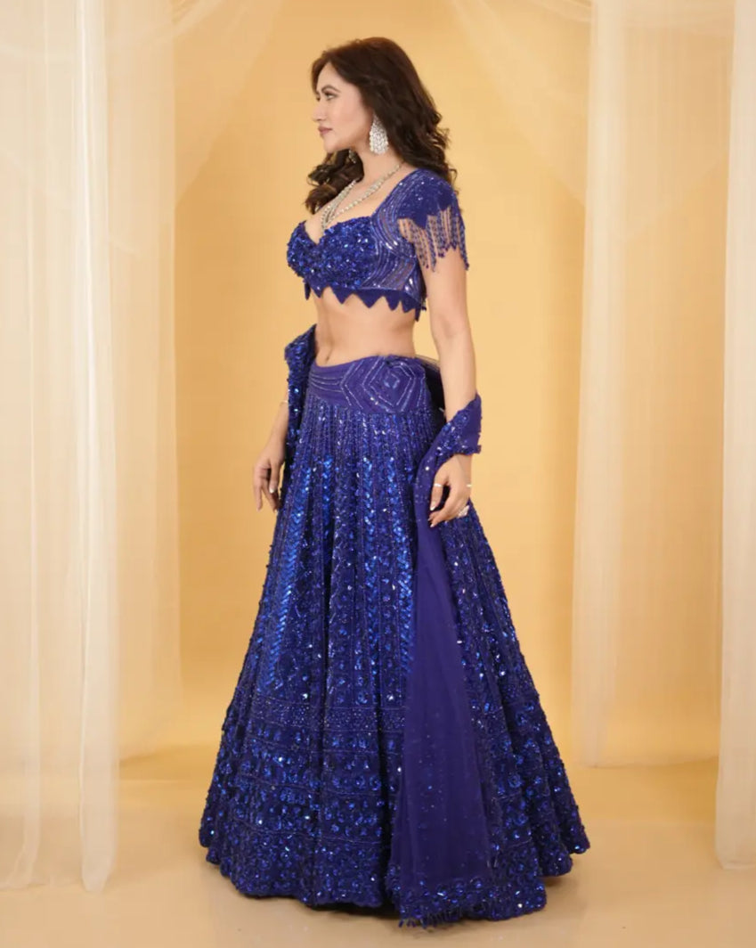 Step into a world of opulence with our Royal Blue Embroidered Lehenga Set, a stunning ensemble that radiates grace, elegance, and timeless beauty. This exquisite lehenga set features a rich royal blue hue that symbolizes sophistication and grandeur, making it the perfect choice for weddings, gala events, and festive celebrations. The lehenga is adorned with intricate embroidery, creating a beautiful contrast with the deep blue fabric, giving it a luxurious and regal appeal.