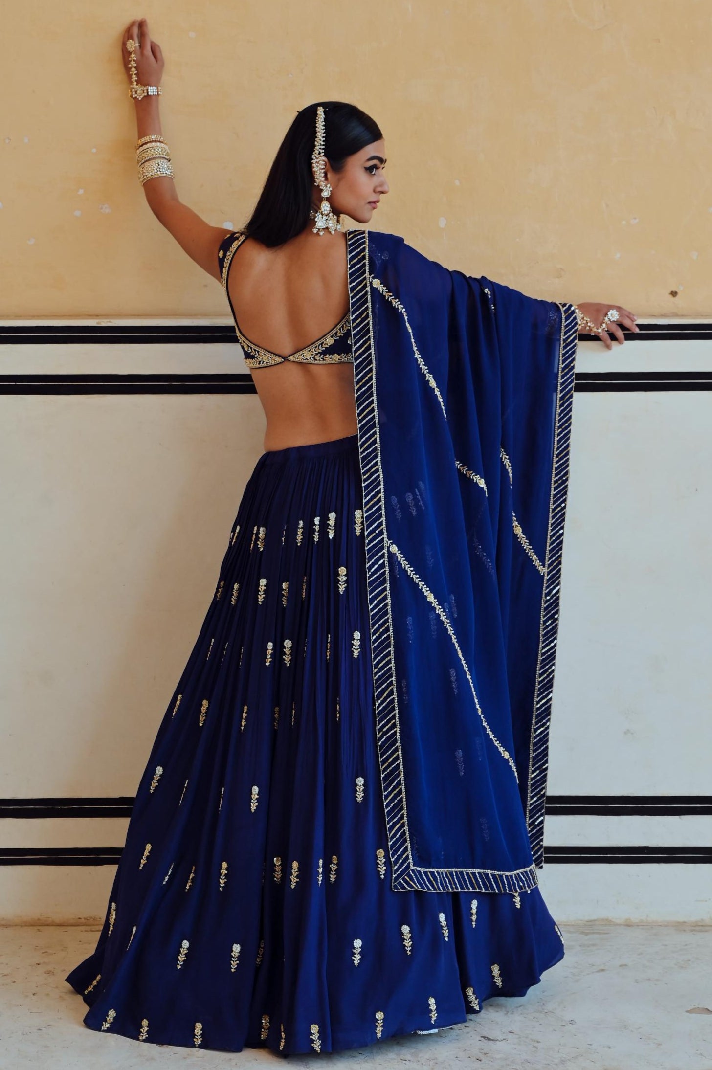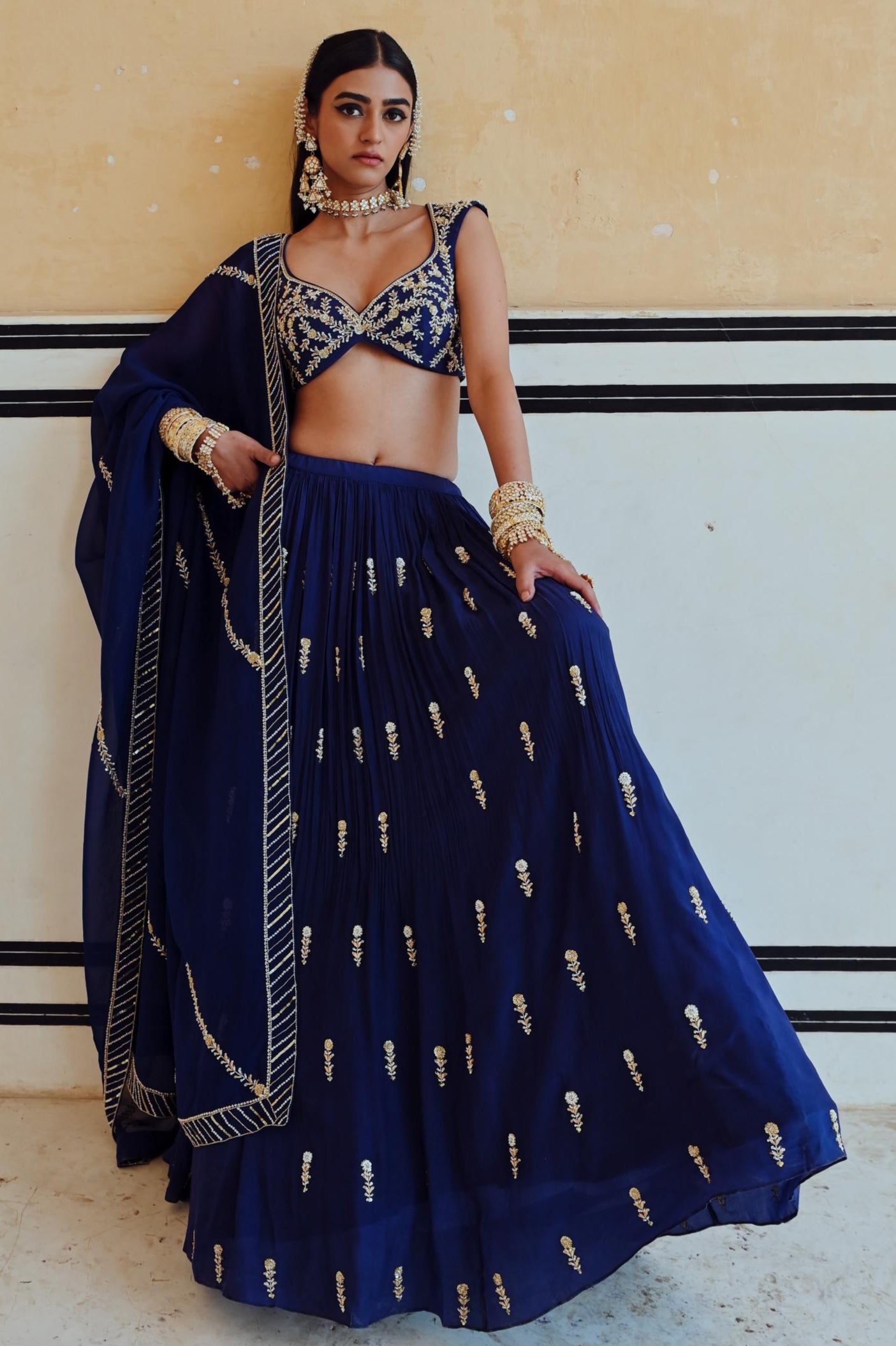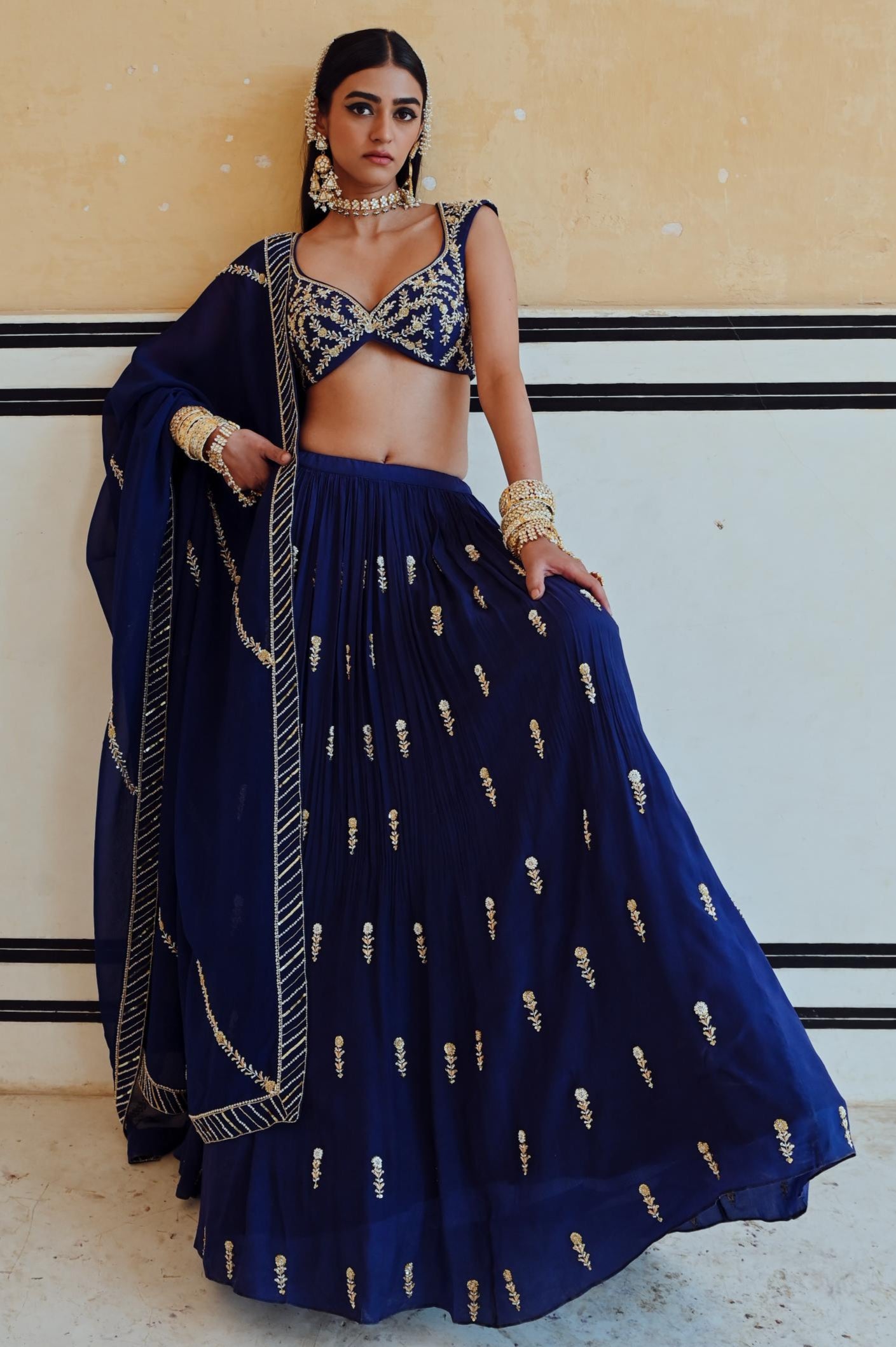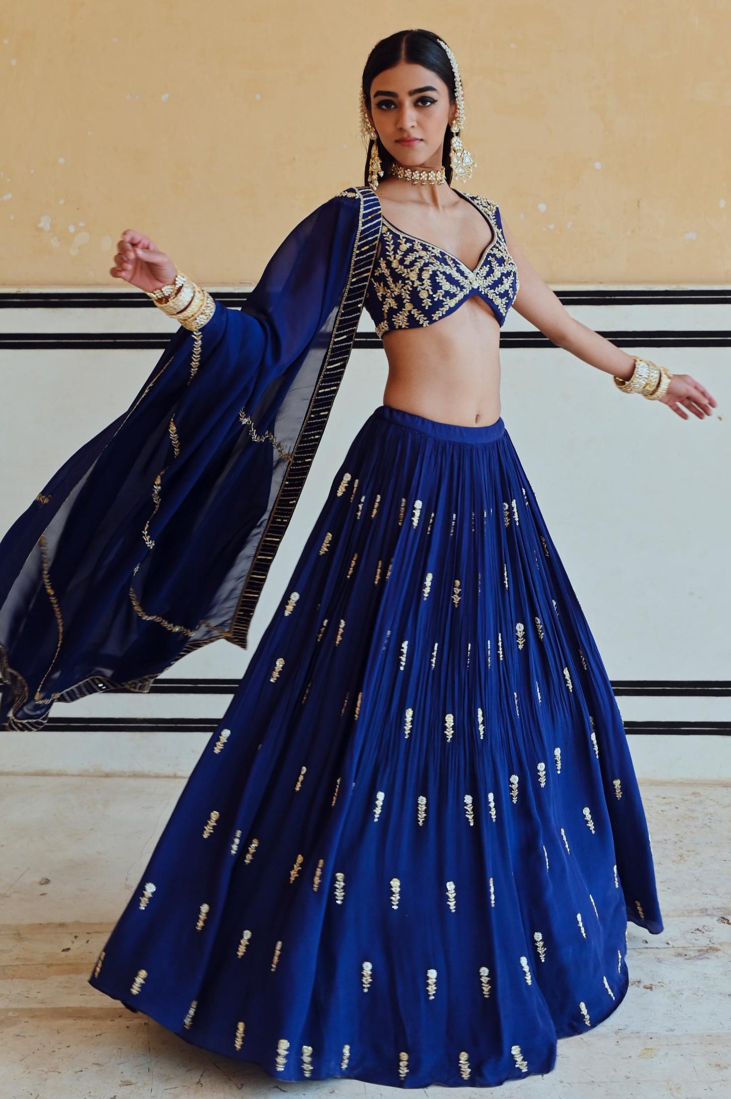 Exude regal elegance in the Royal Blue Rahi Blouse with Lehenga and Dupatta. Featuring a rich hue and a timeless silhouette, this ensemble is perfect for weddings, festive celebrations, and special occasions.