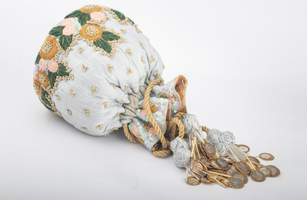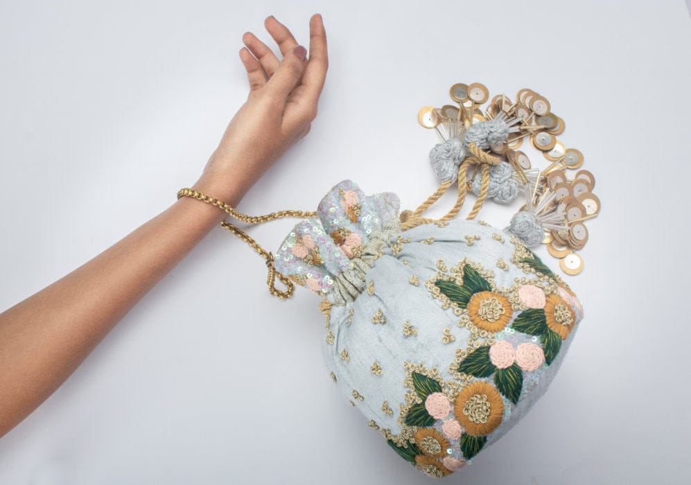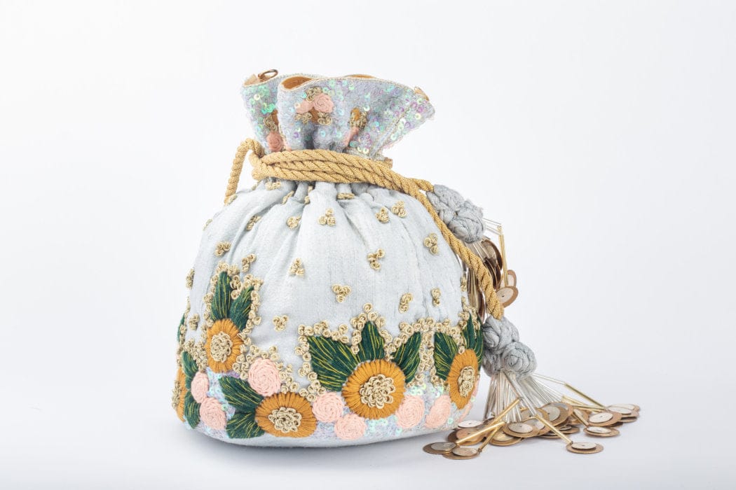 Crafted with bright, intricate thread work and highlighted with delicate zari knots, this Potli clutch exudes elegance and tradition. The beautifully handcrafted flower tassels, a signature USP of the brand, enhance its charm. Perfect for festive occasions, weddings, and celebrations, this statement piece adds a touch of heritage to your ensemble.