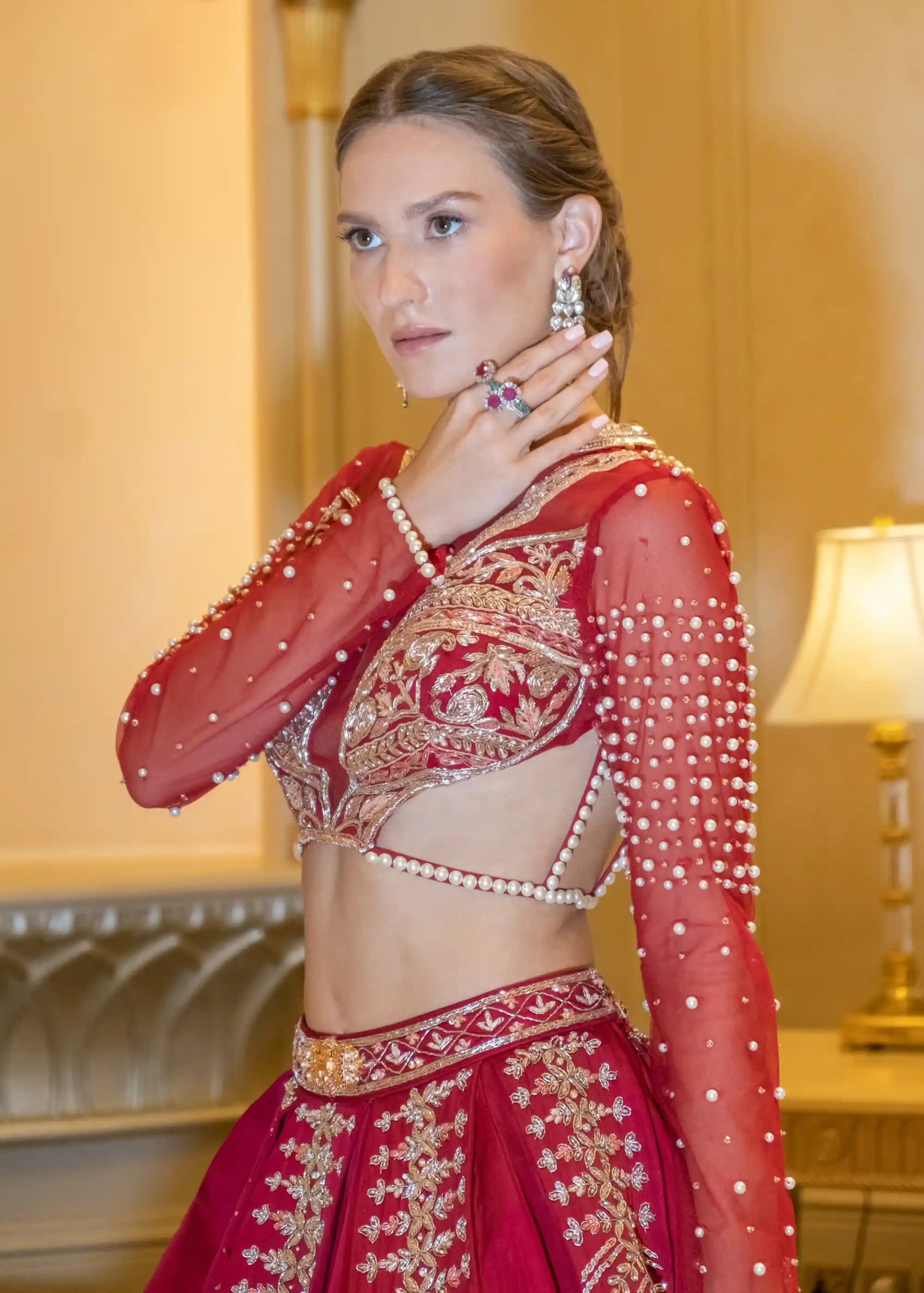 Experience the allure of the rich ruby red lehenga set, an exquisite ensemble designed to make a statement. This stunning outfit features a lehenga crafted from luxurious linen satin, showcasing unique box pleat silhouettes that blend modern style with timeless elegance. The rich ruby red hue is beautifully adorned with intricate gold zardoshi handwork, enhancing its opulent appeal. A distinctive maroon velvet patch at the bottom, designed in a pearlescent drop shape, adds an exquisite finishing touch that sets this lehenga apart.