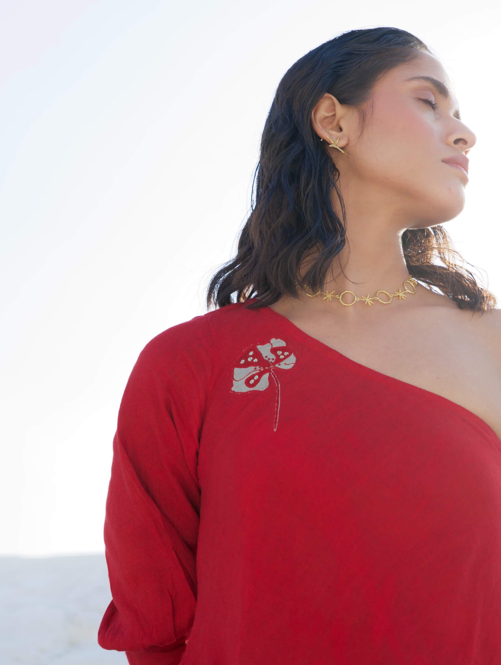 Meet 'Ruby Red,' the versatile dress that effortlessly transitions from day to night with style and comfort. Crafted from fine and thick chanderi silk, this off-shoulder, one-sleeve bias-cut dress is designed to flatter. It features practical side pockets and a delicate baking detail at the hem for added elegance. The highlight of the dress is the beautifully hand-embroidered hibiscus flower adorning the top right bodice, adding a touch of artisanal charm. Whether worn casually during the day or dressed up for chic evening affairs, 'Ruby Red' is your go-to piece for every occasion.