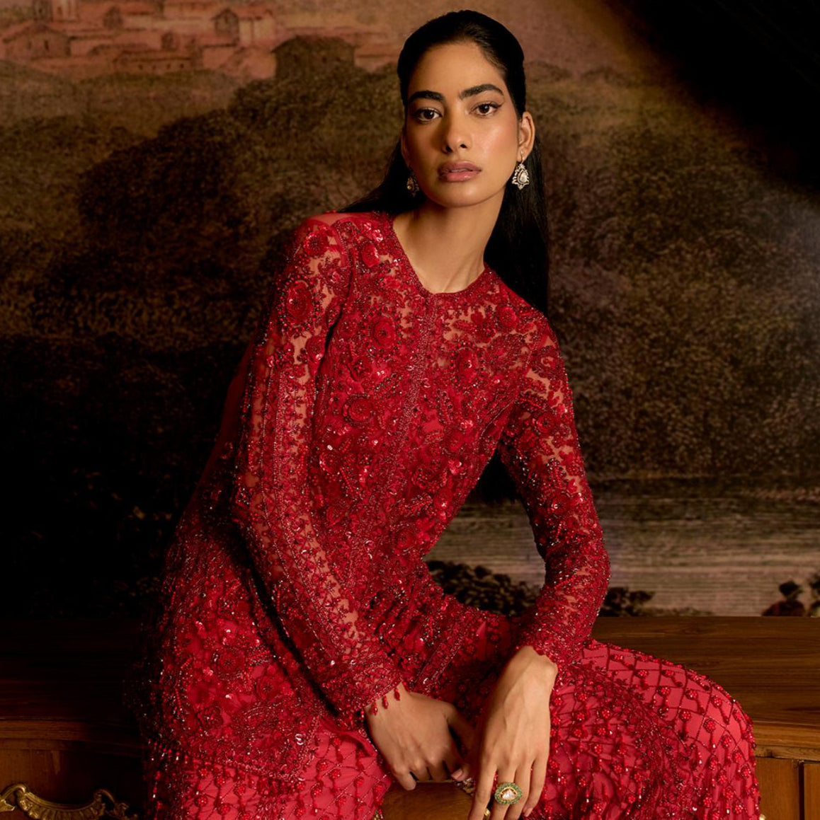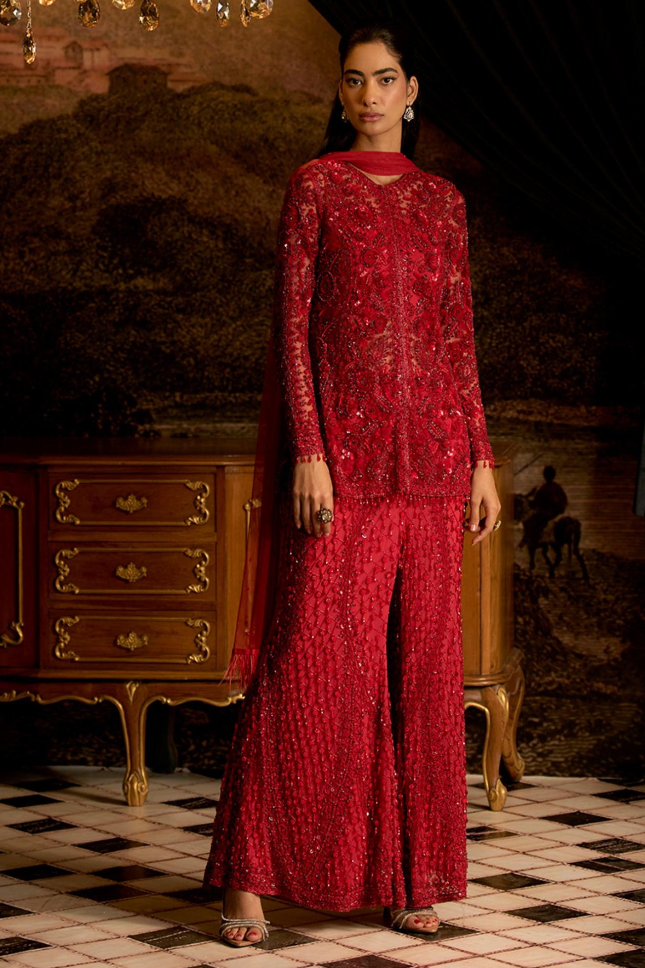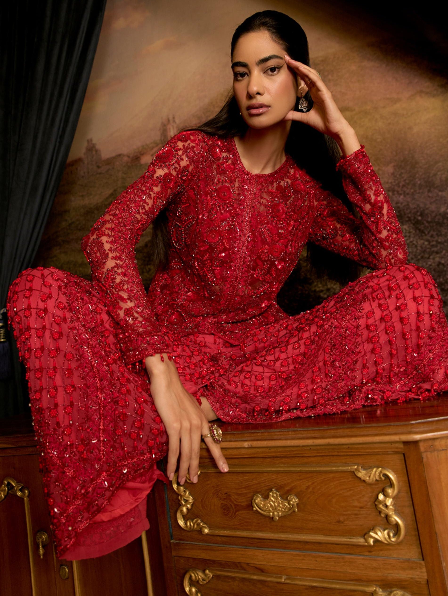 Turn heads in this ruby red chiffon-based kurta, featuring an embroidered border for a touch of elegance. Paired with a net embroidered jacket with tassels and a chiffon sharara, this set exudes sophistication. The ensemble is completed with a net dupatta, trimmed with tassels, making it perfect for weddings and festive celebrations.