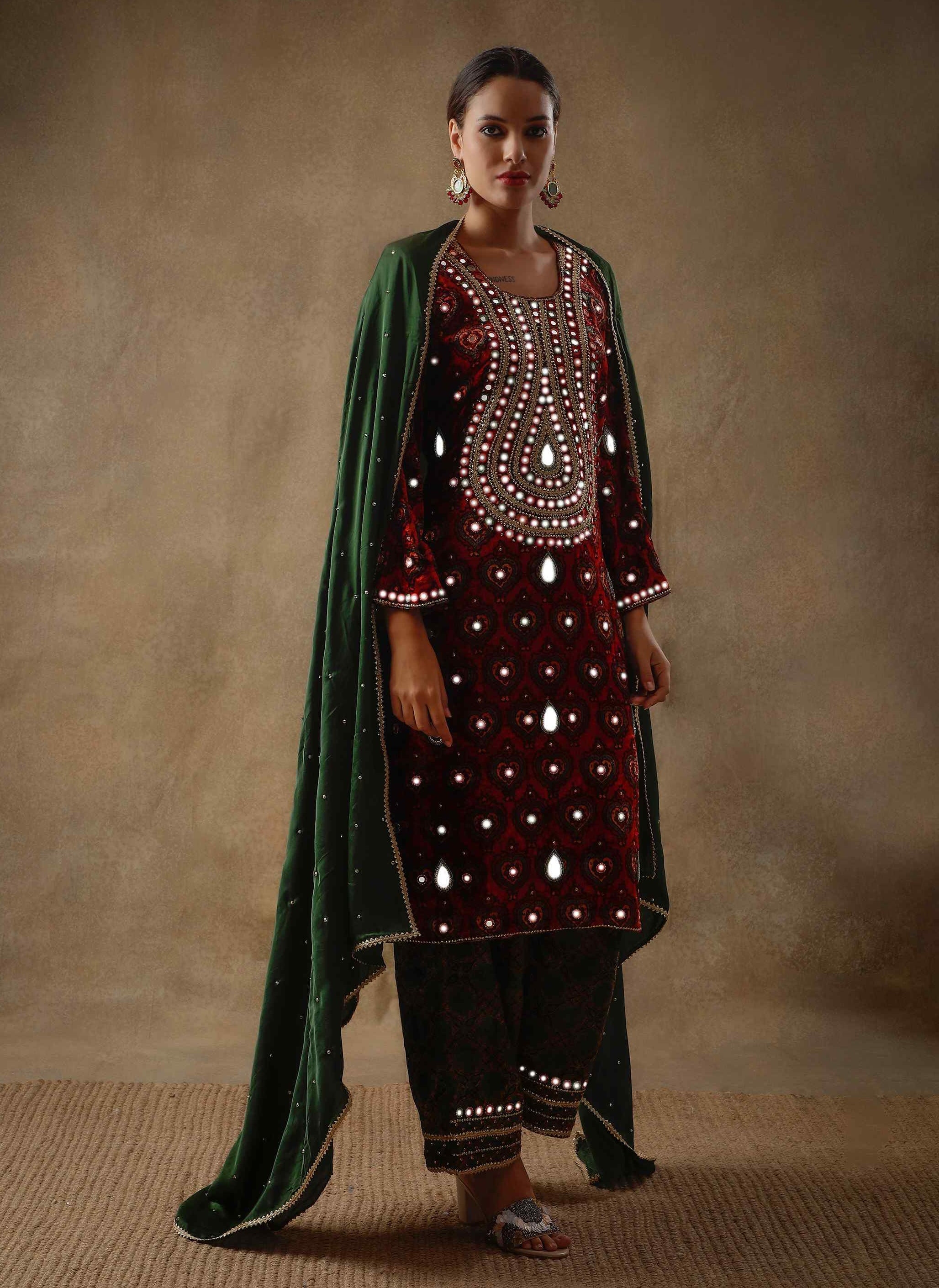 Elevate your style with our Ruby Red Velvet Kurta, featuring a unique long yoke adorned with hand-embroidered sheeshakari, resham, zari, aari, and beadwork. The kurta's rich velvet and bell sleeves are complemented by intricate mirror work. Paired with hand-embroidered green velvet pants and a matching green silk dupatta, this ensemble blends traditional craftsmanship with contemporary elegance.