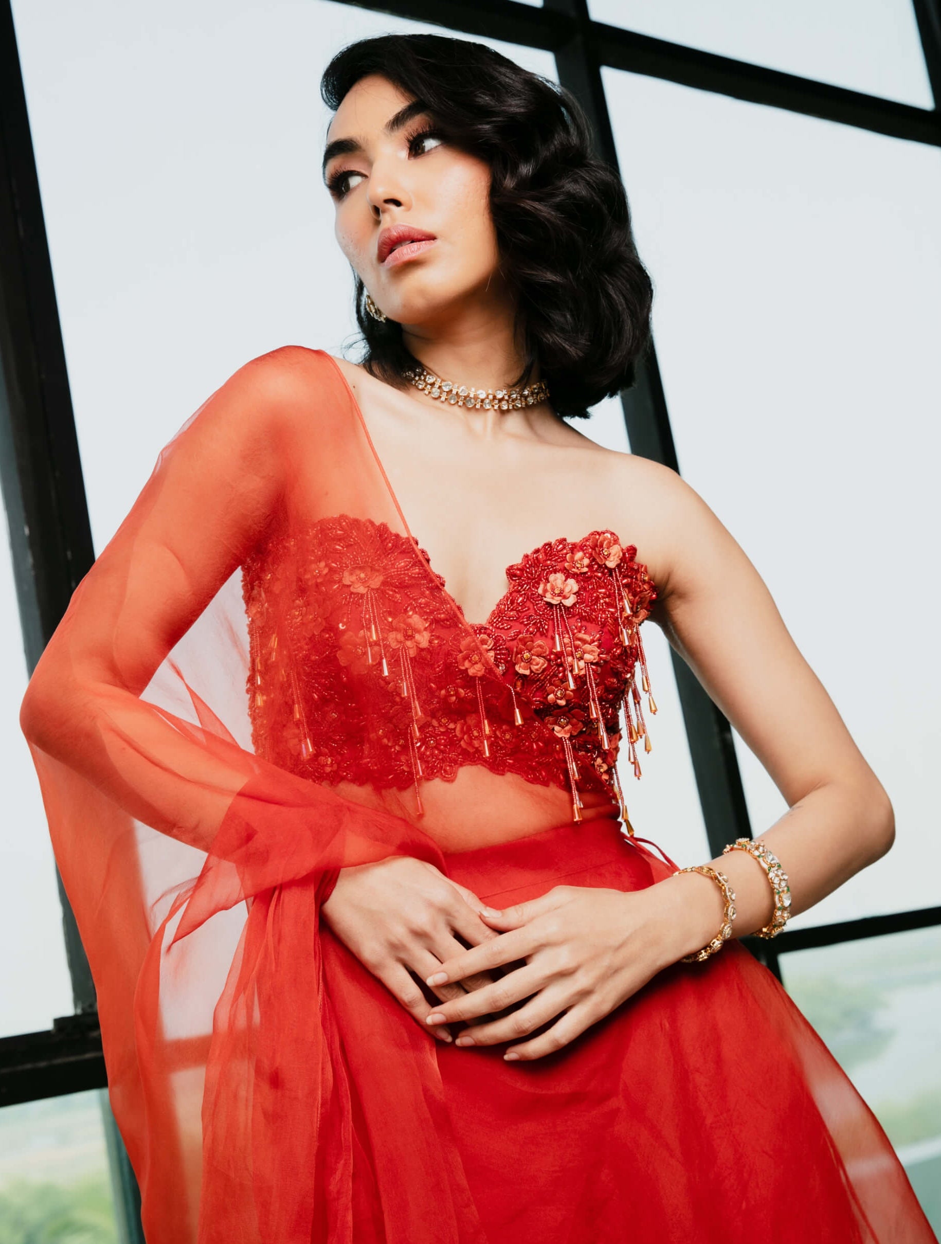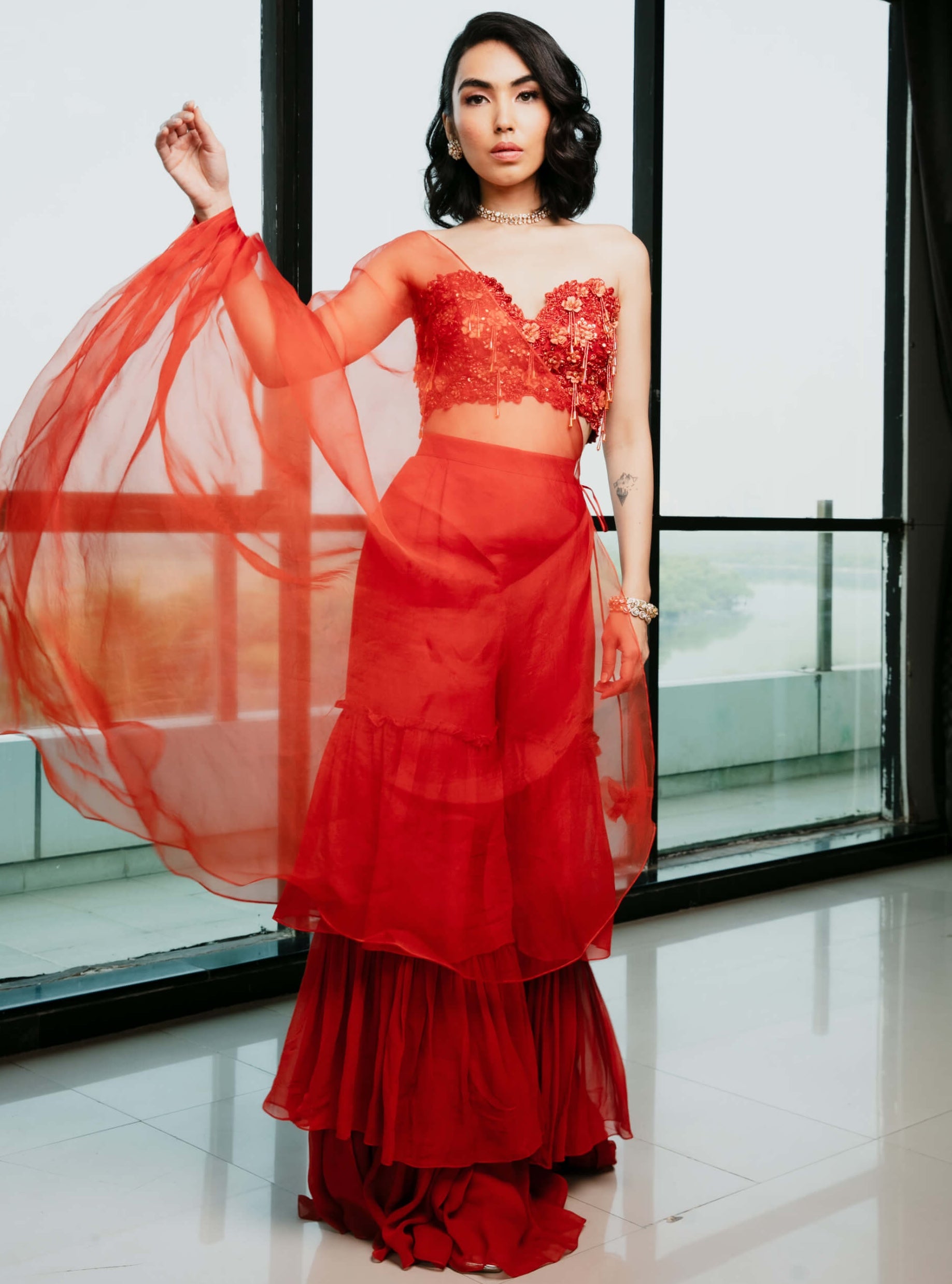 Step into elegance with our embroidered bustier paired with layered pants and an organza cover-up. This ensemble blends sophistication with a modern twist, featuring intricate embroidery that adds a touch of opulence to the bustier. The layered pants offer a contemporary silhouette with layers of fabric that flow gracefully, while the sheer organza cover-up adds a delicate and ethereal touch. Perfect for formal gatherings and special events, this outfit promises to make a statement with its refined craftsmanship and luxurious detailing. Embrace the fusion of traditional charm and contemporary style with this captivating ensemble that exudes grace and confidence.
