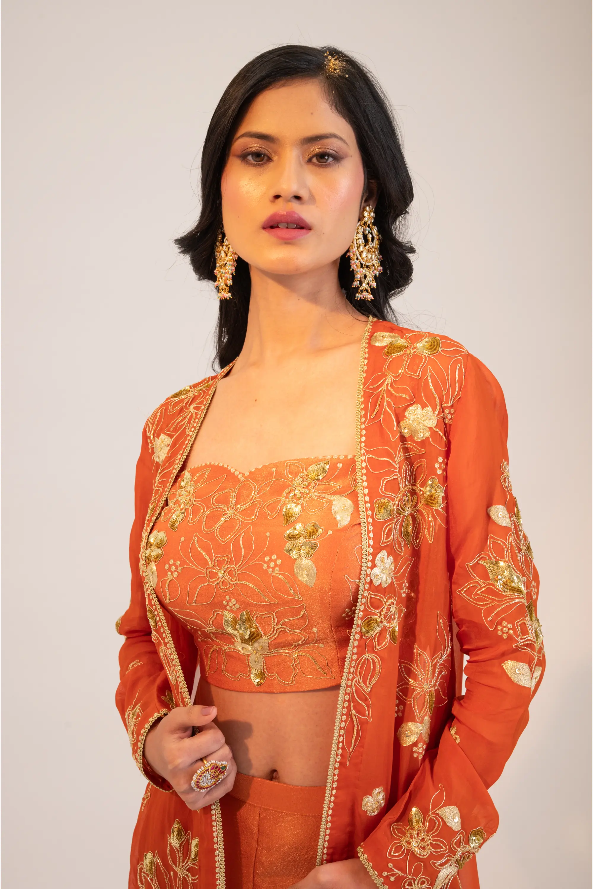 Step into sophistication with our rust embroidered organza jacket, a striking piece that adds a layer of elegance to any outfit. This beautifully designed jacket features intricate embroidery that highlights its sheer organza fabric, creating a stunning visual contrast. Paired with tailored pants and a complementary blouse, this ensemble is perfect for a variety of occasions, from festive celebrations to elegant gatherings. The rich rust color exudes warmth and charm, making it a versatile choice for both day and evening wear. Elevate your wardrobe with this unique outfit that celebrates contemporary fashion while honoring traditional craftsmanship.
