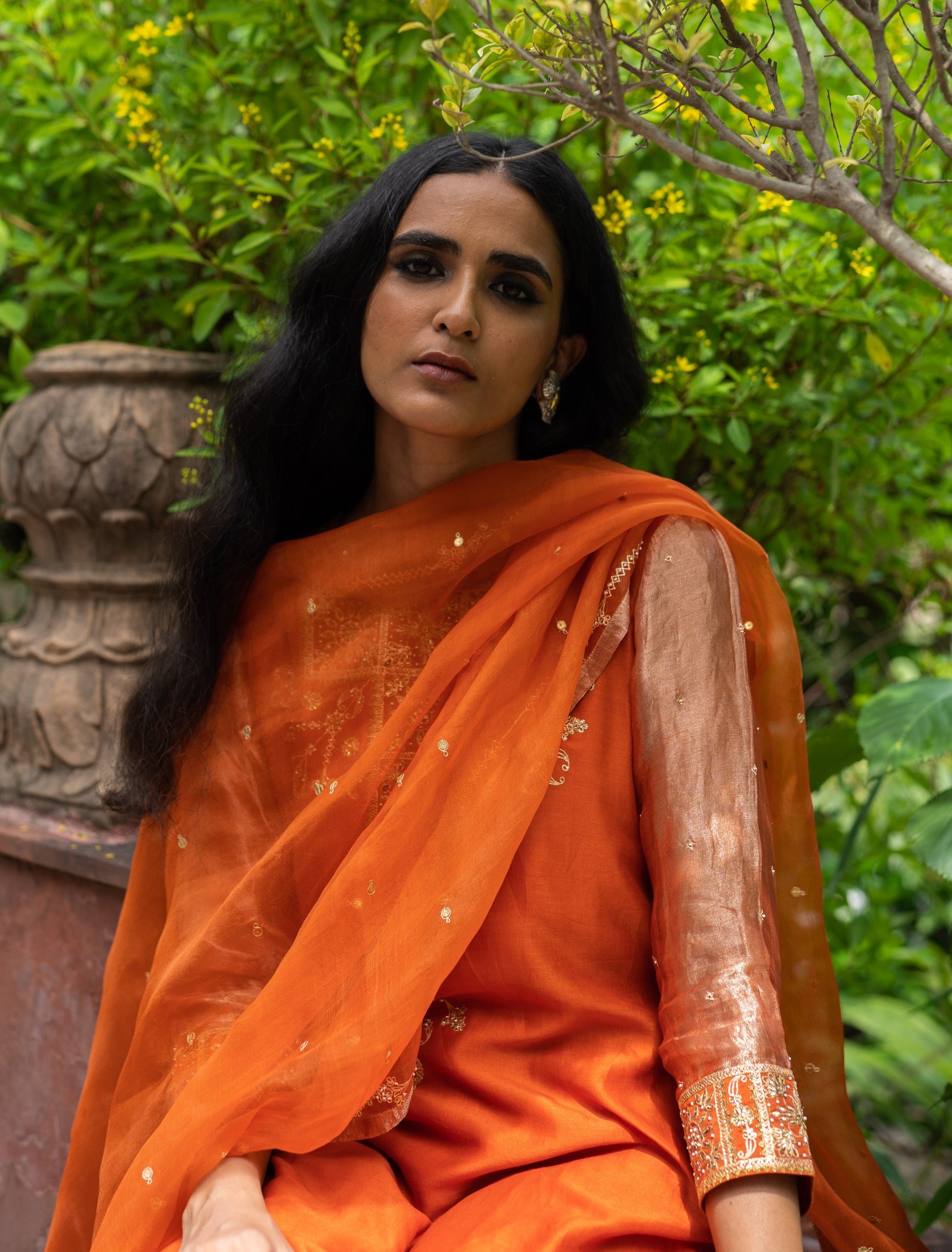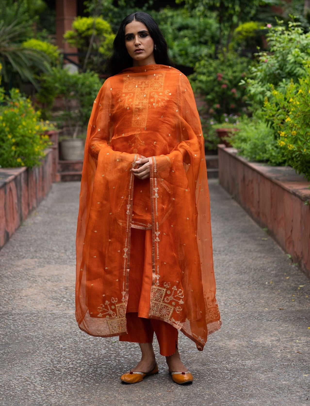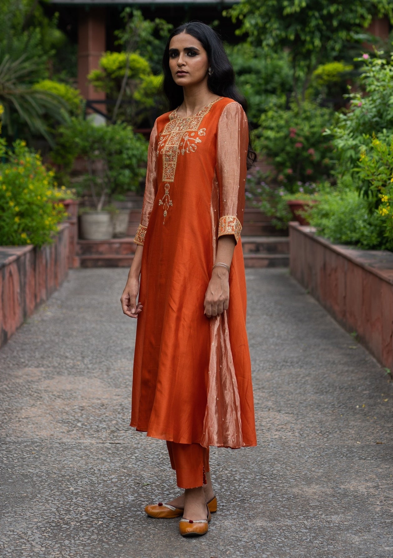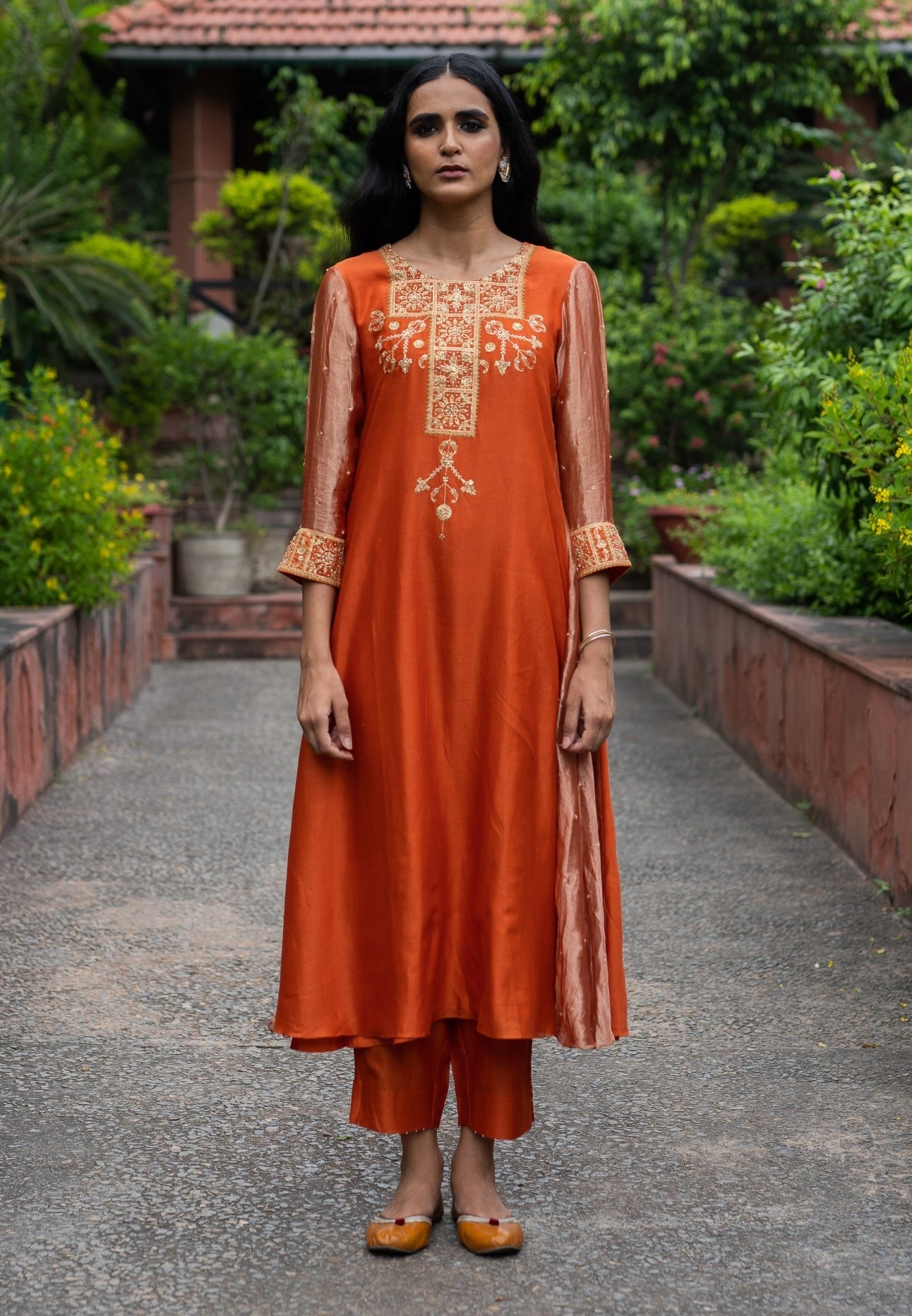 Step into refined elegance with our rust orange A-line dress, featuring exquisite hand embroidery on the yoke and tissue silk side panels. This stunning outfit is paired with matching rust orange straight pants and a beautifully embroidered dupatta with a tissue silk border. Perfect for special occasions, it combines intricate detailing with luxurious fabric for a sophisticated and striking look.