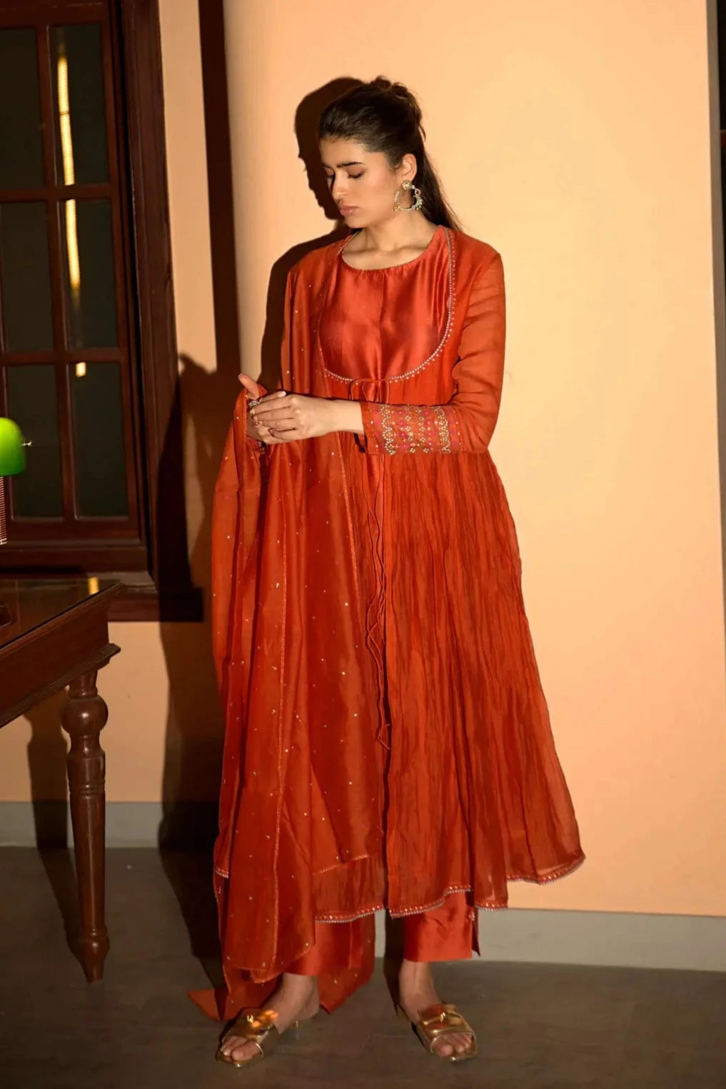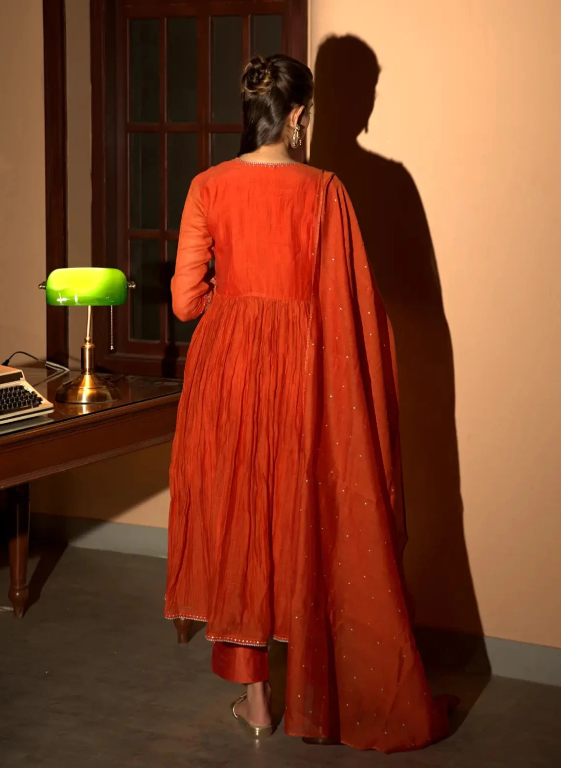 This stunning rust orange gather angrakha features intricate zari and resham-embroidered dots outlining the yoke, adding a touch of elegance and sophistication. Designed with a luxurious Chanderi slip, it ensures a graceful drape while providing comfort. The ensemble is paired with straight pants for a chic silhouette and complemented by a multi-color dotted Chanderi dupatta, beautifully embroidered all over. This outfit seamlessly blends traditional craftsmanship with modern style, making it perfect for festive occasions or special celebrations.