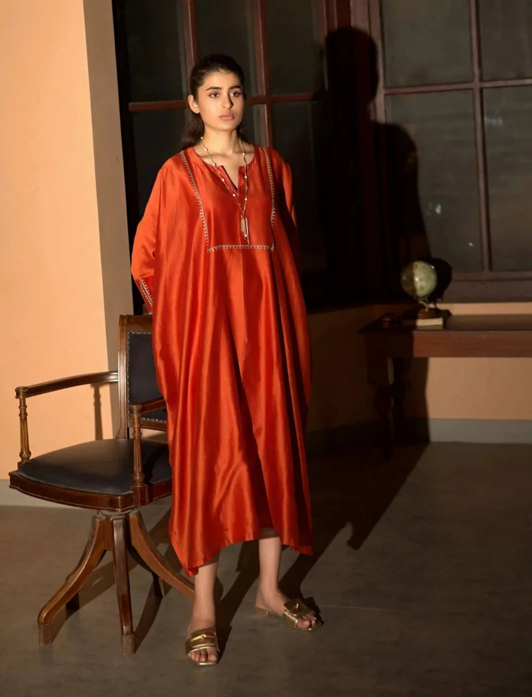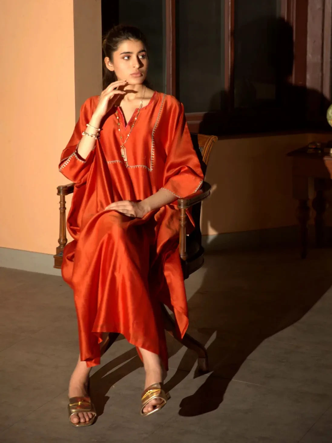 This elegant rust orange kaftan is beautifully adorned with hand-embroidered dotted lines in luxurious zari and resham on the yoke and sleeves, adding a touch of sophistication and artistry. The flowing silhouette offers comfort and style, making it perfect for both casual outings and festive occasions. The intricate embroidery enhances the overall design, reflecting exquisite craftsmanship and attention to detail. This kaftan is a versatile piece that effortlessly combines traditional elements with contemporary fashion, making it a standout addition to any wardrobe.
