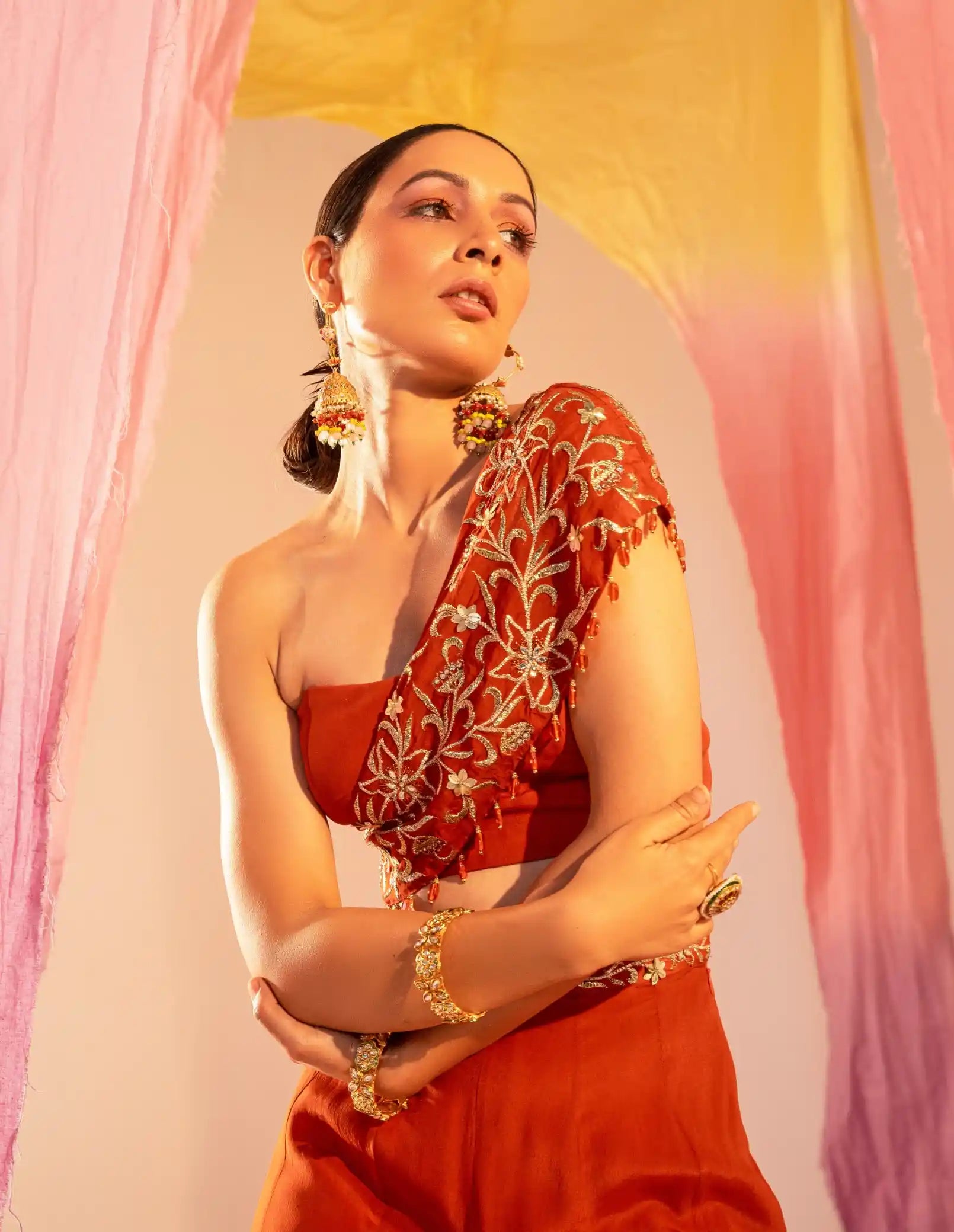 Elevate your style with our rust orange embroidered one-shoulder tube blouse paired with chic palazzo pants. This stunning set features intricate embroidery and a trendy one-shoulder design, offering a contemporary flair that flatters your silhouette. Perfect for special occasions or a night out, it’s a fashionable choice that exudes elegance and confidence!