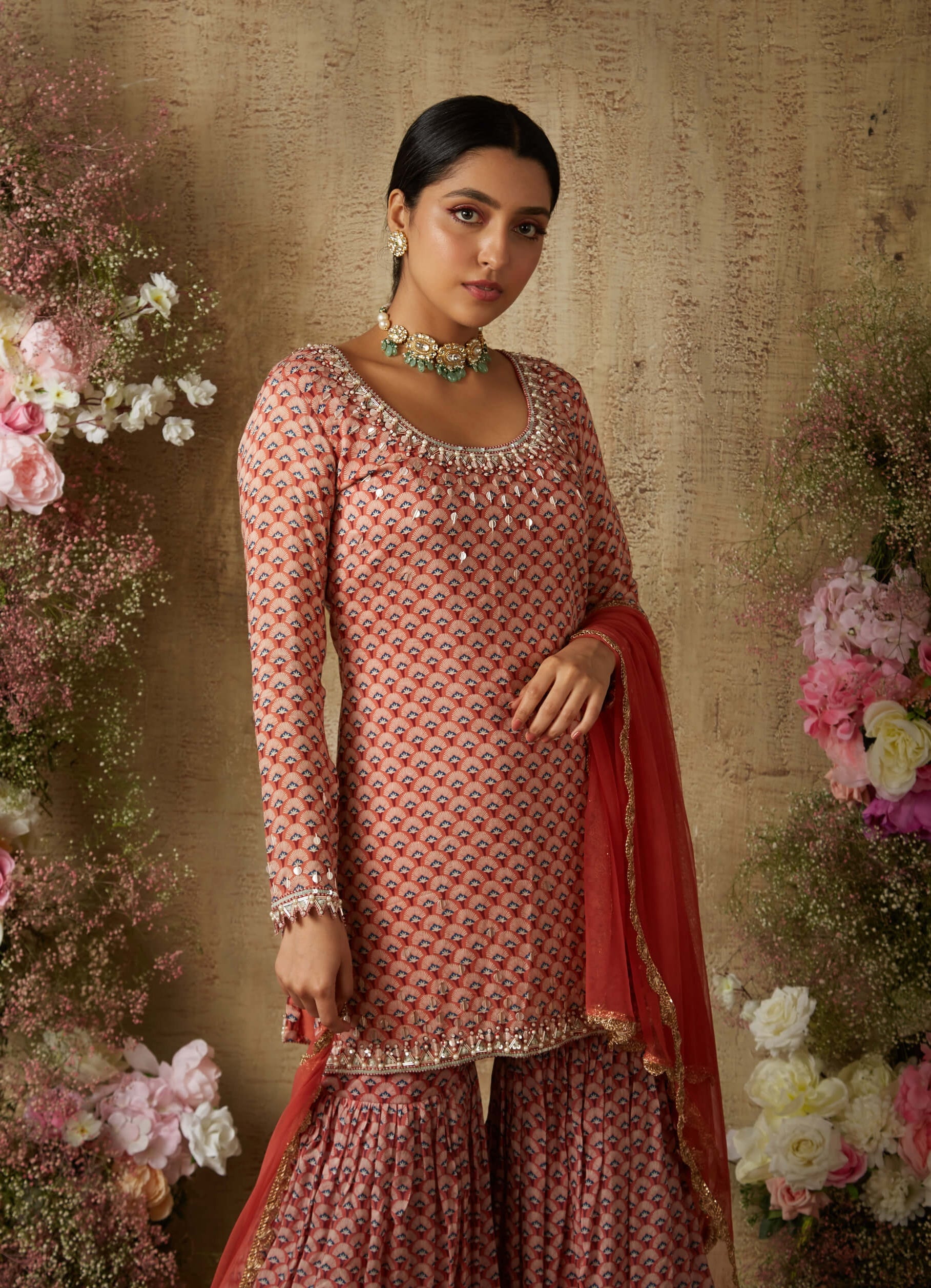 Presenting our vibrant red printed sharara set, featuring a printed straight top and a delicate net dupatta. This ensemble embodies a perfect blend of traditional charm and contemporary style. The printed sharara pants add a lively touch with their intricate patterns, complemented by the elegant simplicity of the straight top. The ethereal net dupatta enhances the ensemble with its light and airy texture, making it ideal for festive occasions and celebrations. Embrace the beauty of cultural richness and modern design with this striking outfit that promises elegance and grace in every step.