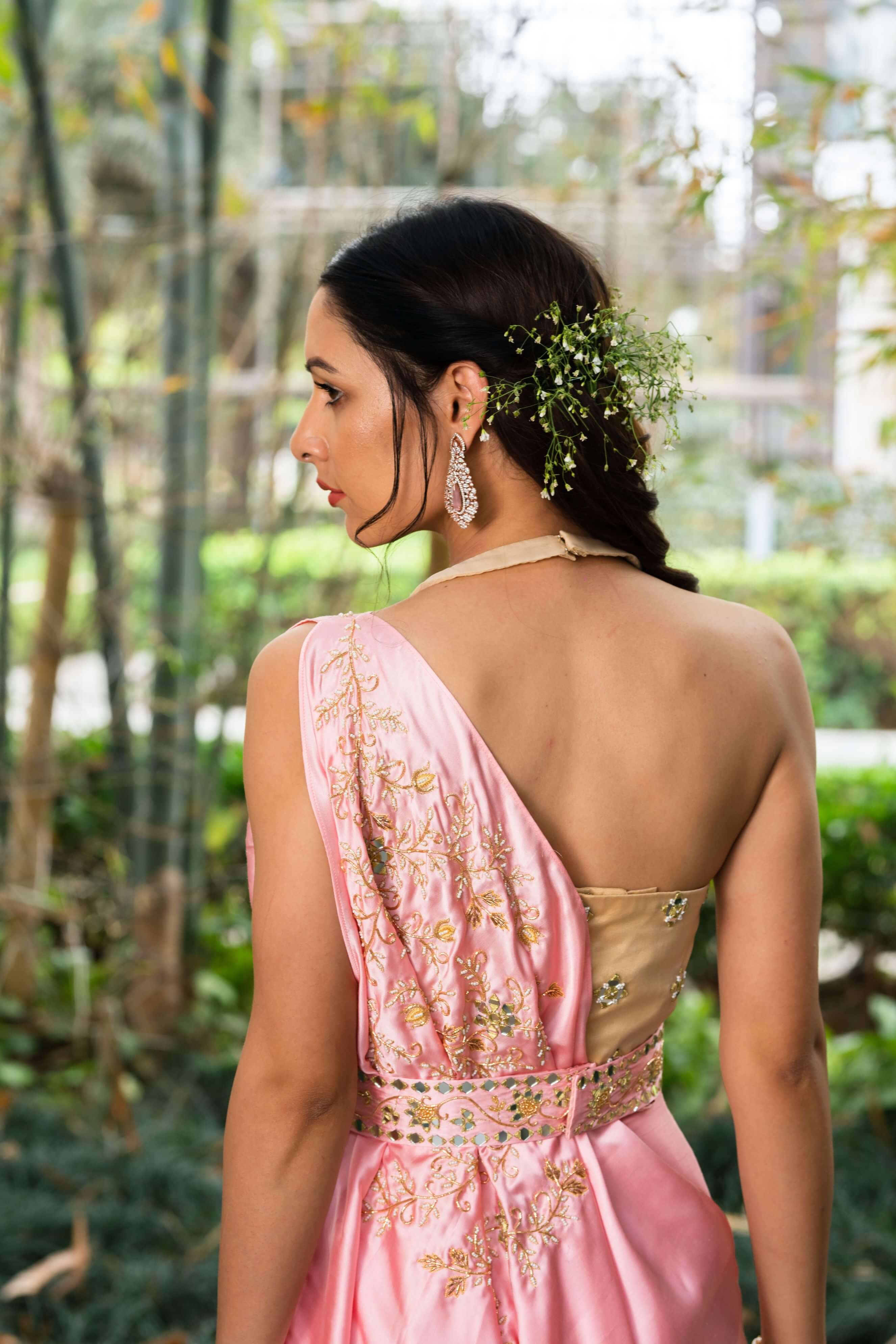 Step into sophistication with the pink drape saree cape paired elegantly with a silk organza halter blouse and silk pants, finished beautifully with an embroidered silk belt. The drape saree cape, in a charming pink hue, adds a contemporary twist to traditional attire, offering effortless elegance. Complementing this ensemble is the silk organza halter blouse, which combines grace with a modern silhouette. Complete your look with the silk pants, providing comfort and a streamlined appearance. Enhancing the outfit is the embroidered silk belt, adding a touch of opulence and cinching the waist with exquisite craftsmanship. Ideal for weddings and special occasions, this ensemble merges traditional richness with contemporary design, ensuring you radiate refined style and timeless allure.