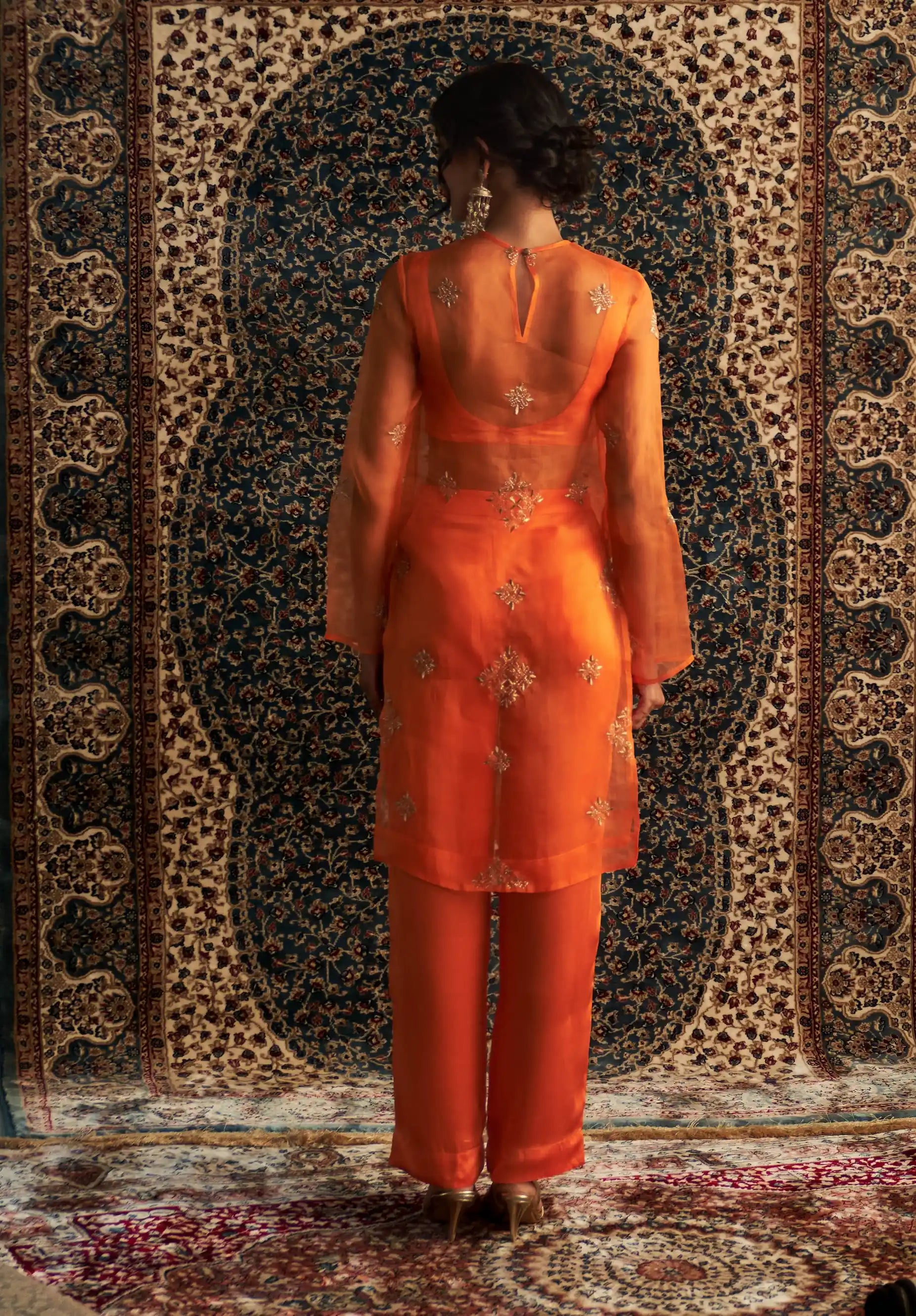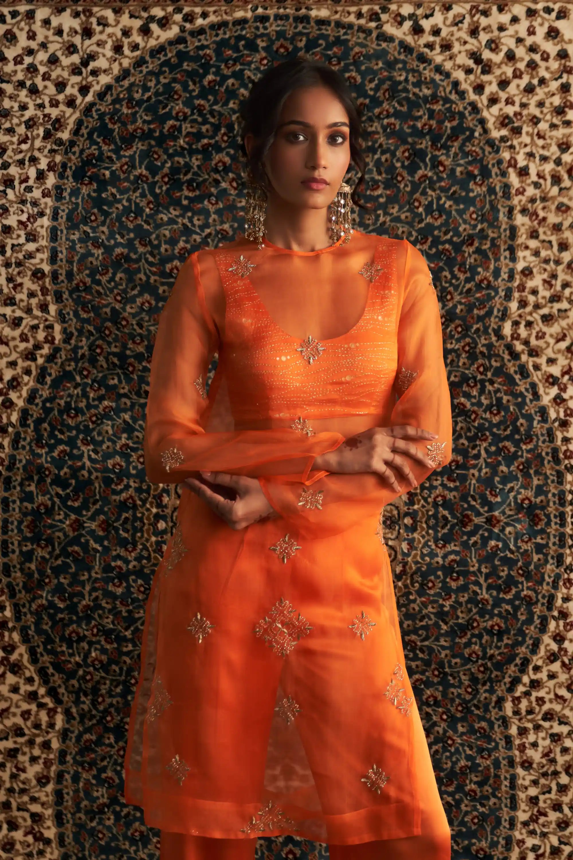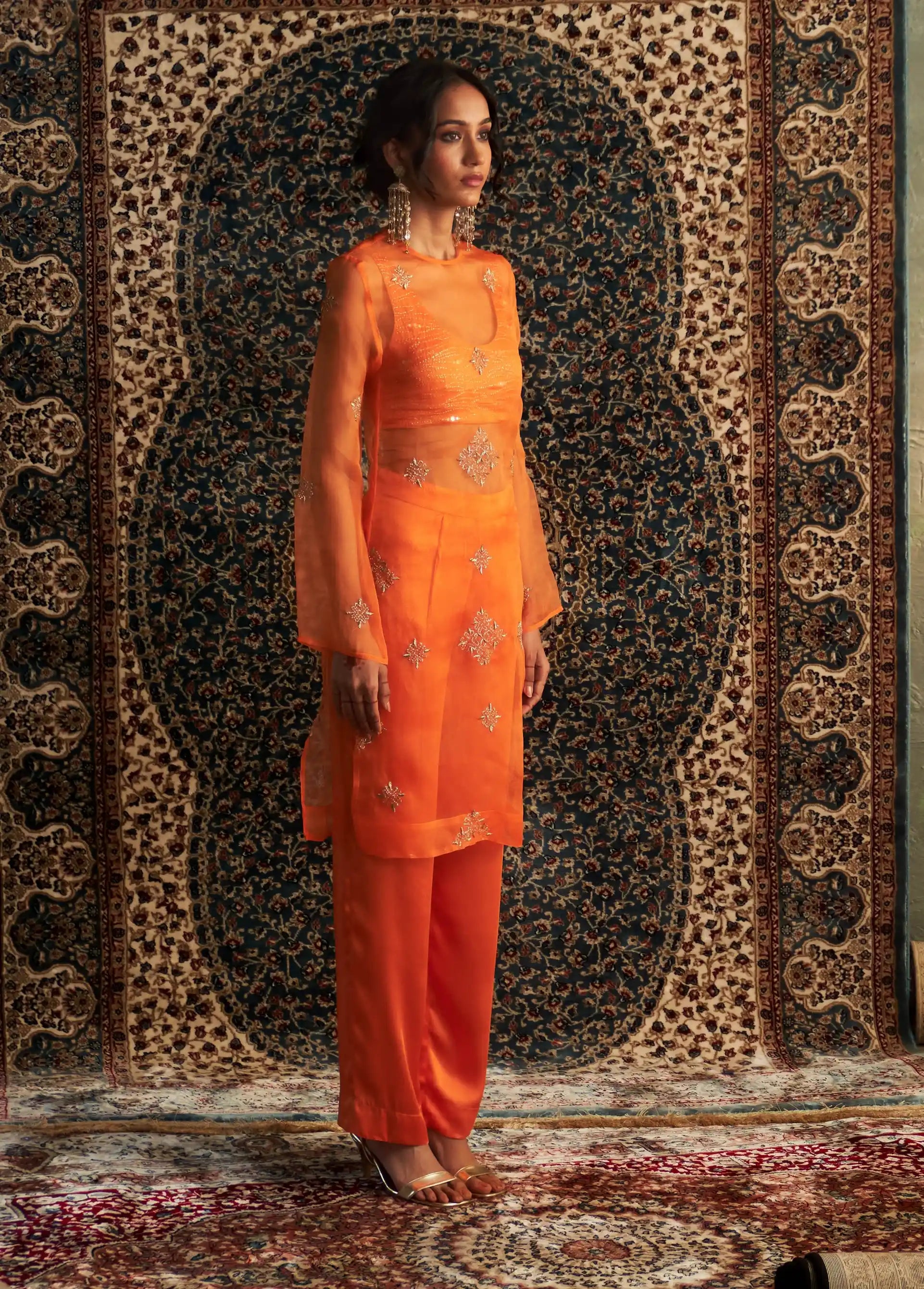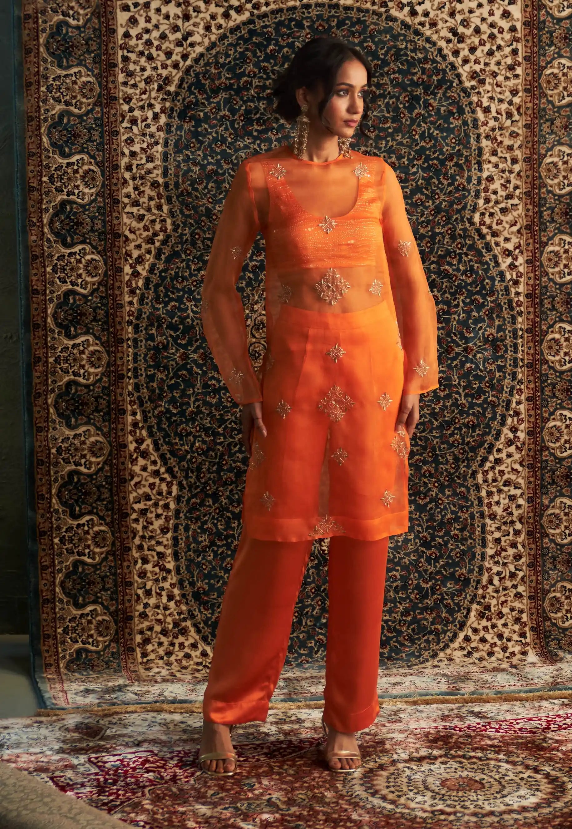 Step into the spotlight with this stunning saffron organza kurta, elegantly paired with sleek, tailored straight trousers. The sheer organza fabric, adorned with intricate zari and dabka motifs, exudes timeless beauty and sophistication. The fully embroidered bustier, featuring captivating wave motifs enhanced by golden zari work, adds an exquisite touch of opulence.