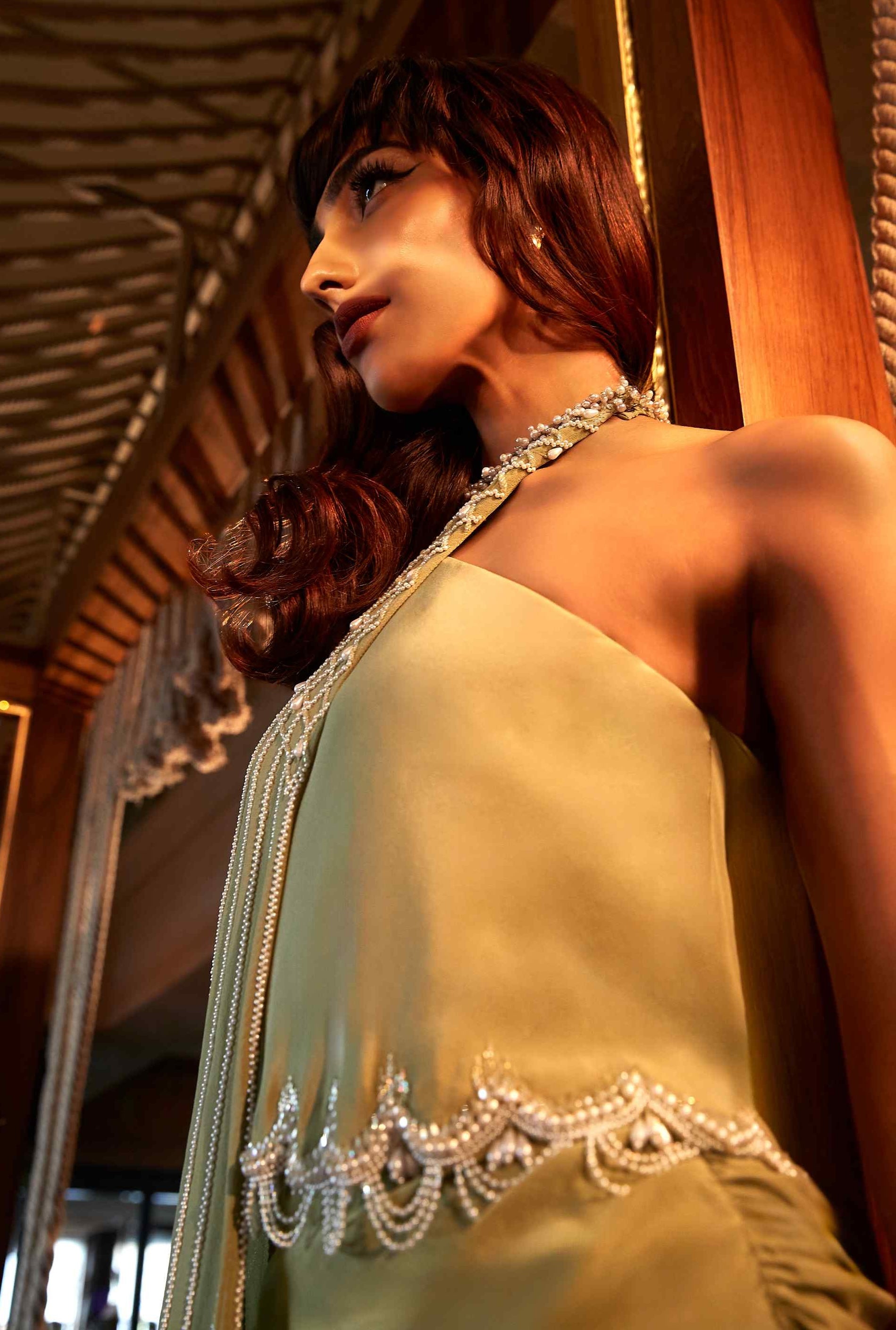 Elevate your elegance with our embellished pearl jacket, adorned with sparkling crystals for a touch of luxury. This exquisite piece is perfectly paired with a pure satin draped skirt, creating a fluid and sophisticated silhouette. Completing the ensemble is a halter top featuring a distinctive neckline that adds a modern, chic flair. Ideal for making a statement at any special event, this outfit seamlessly blends opulent details with contemporary style, ensuring a look that is both refined and unforgettable.