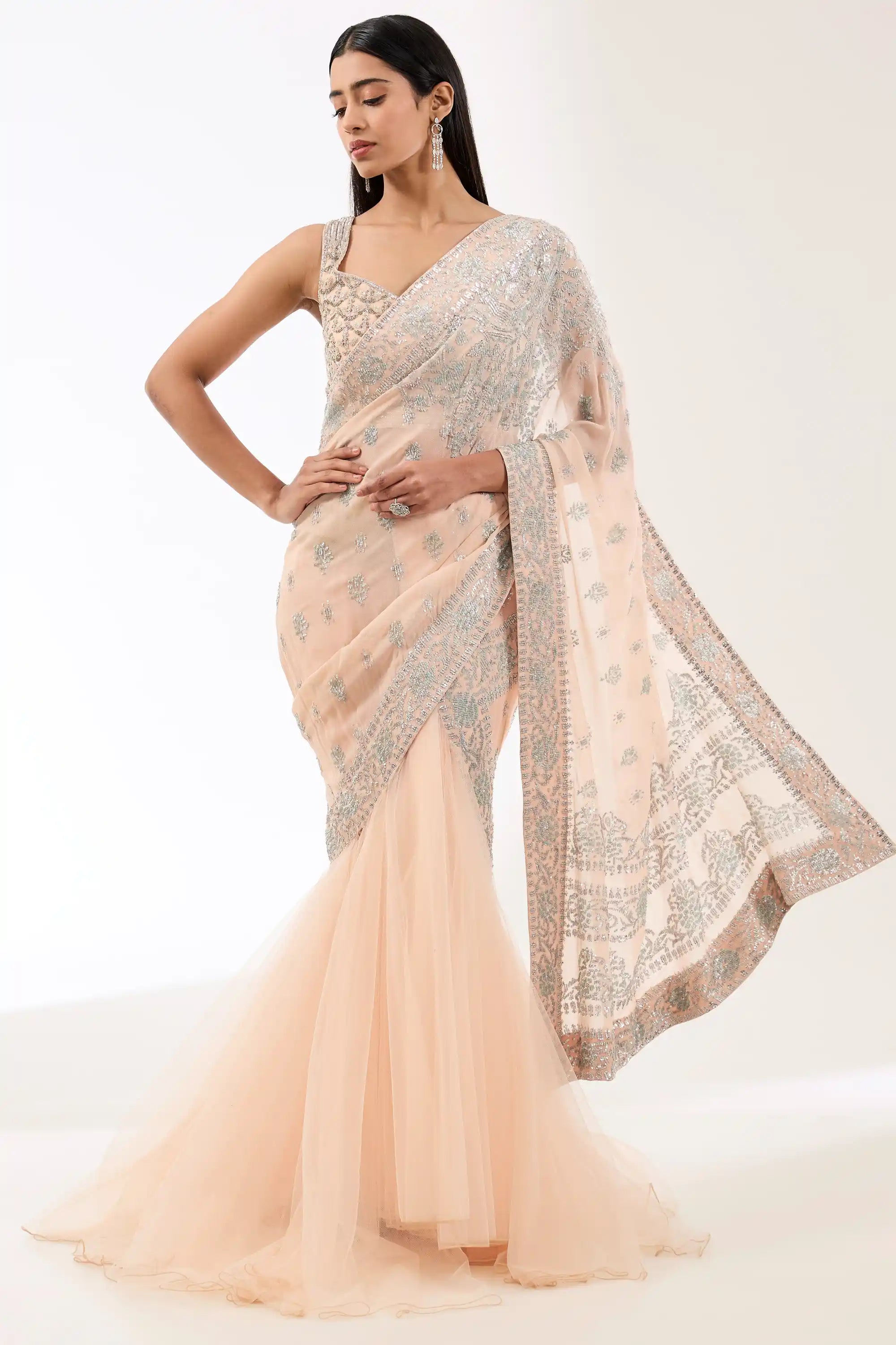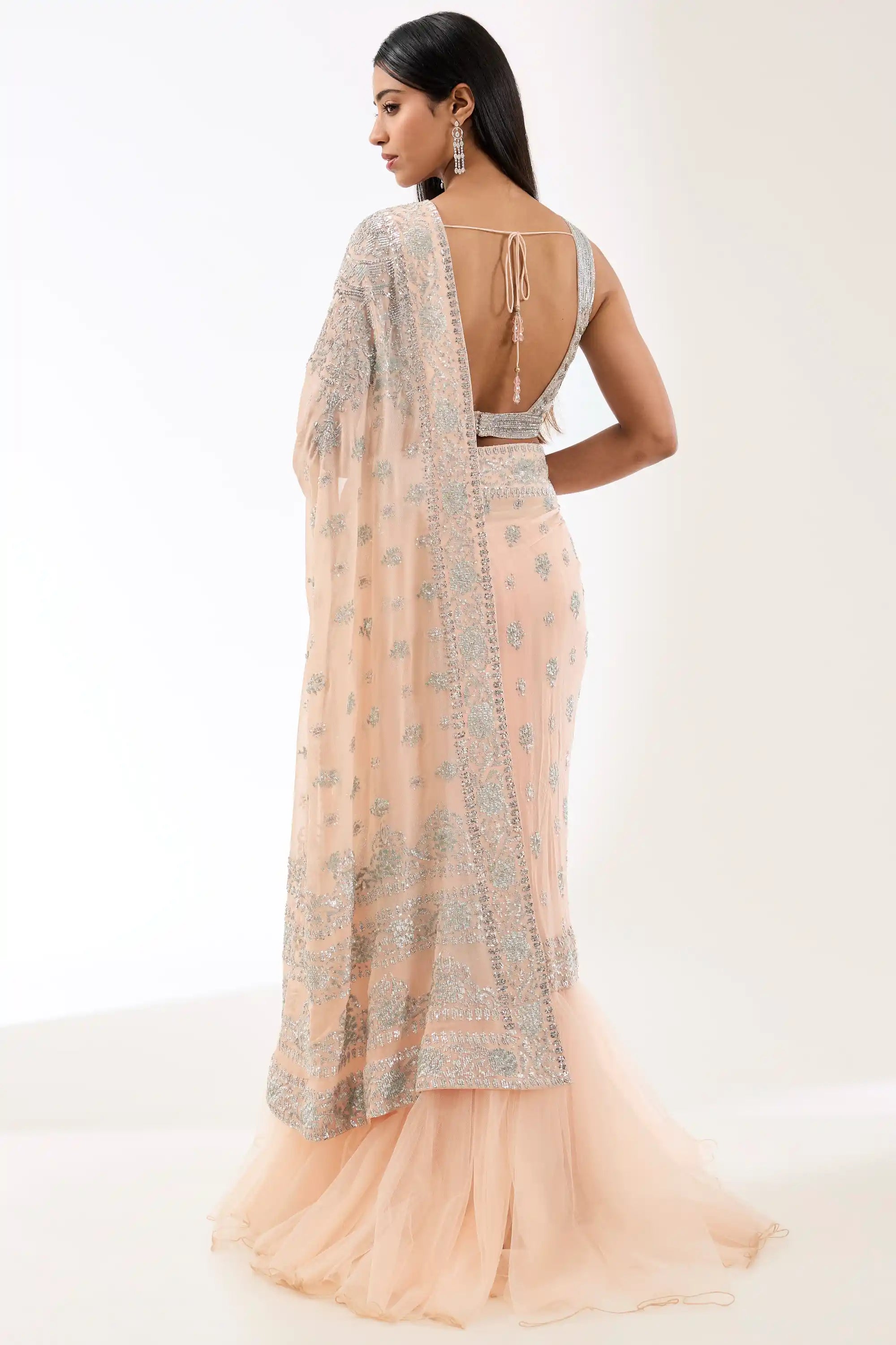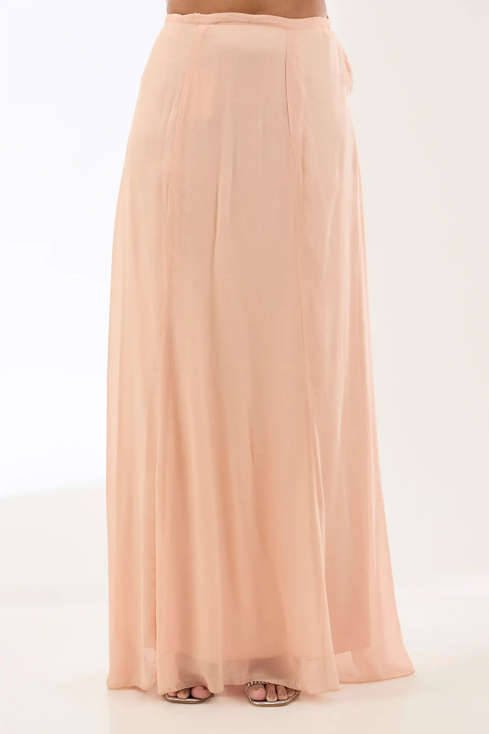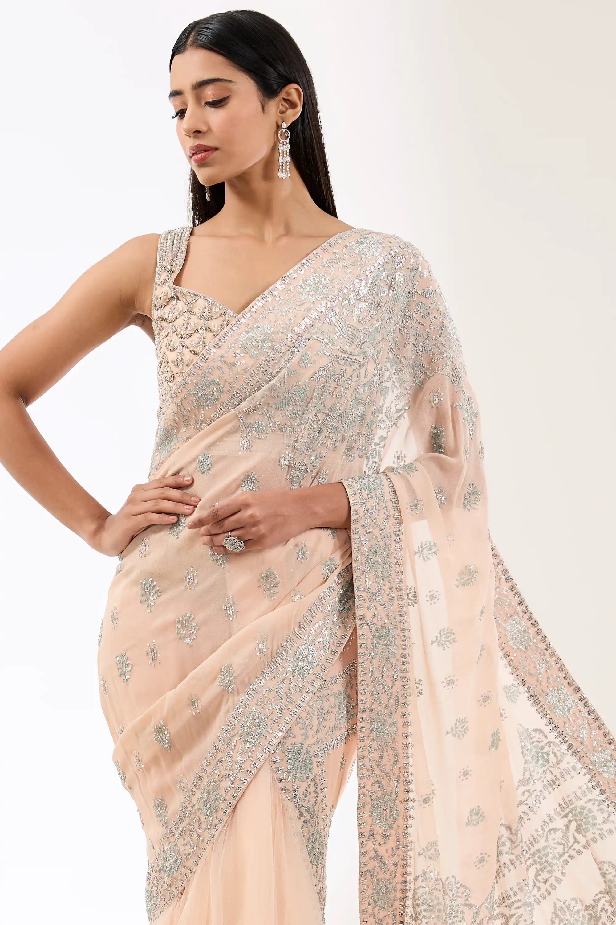 Embrace elegance with this blush pink georgette lehenga sari set, featuring intricate hand embroidery for a touch of sophistication. The draped design beautifully flows, while the matching blouse completes the look. Perfect for weddings and special occasions, this ensemble effortlessly combines traditional charm with modern style.