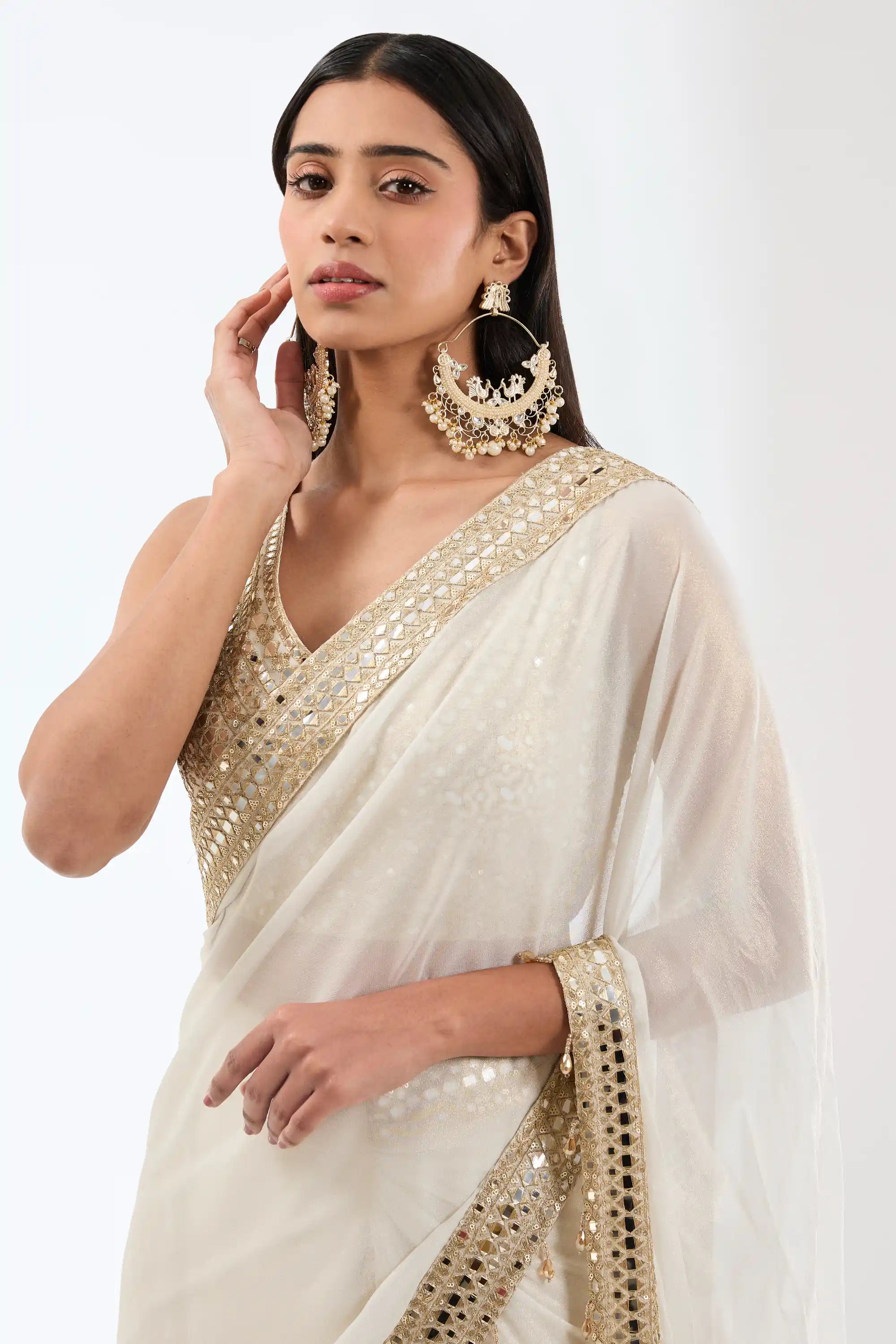Elevate your elegance with this exquisite ivory georgette palazzo stitched sari set, beautifully adorned with gold zari, sequins, and mirror work. The stylish palazzo design offers comfort while maintaining a chic silhouette. Perfect for festive occasions, this ensemble combines traditional craftsmanship with modern flair.