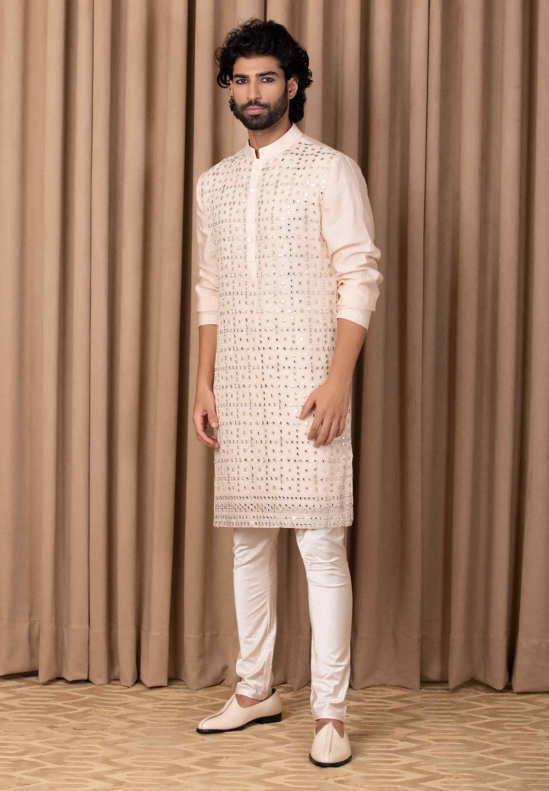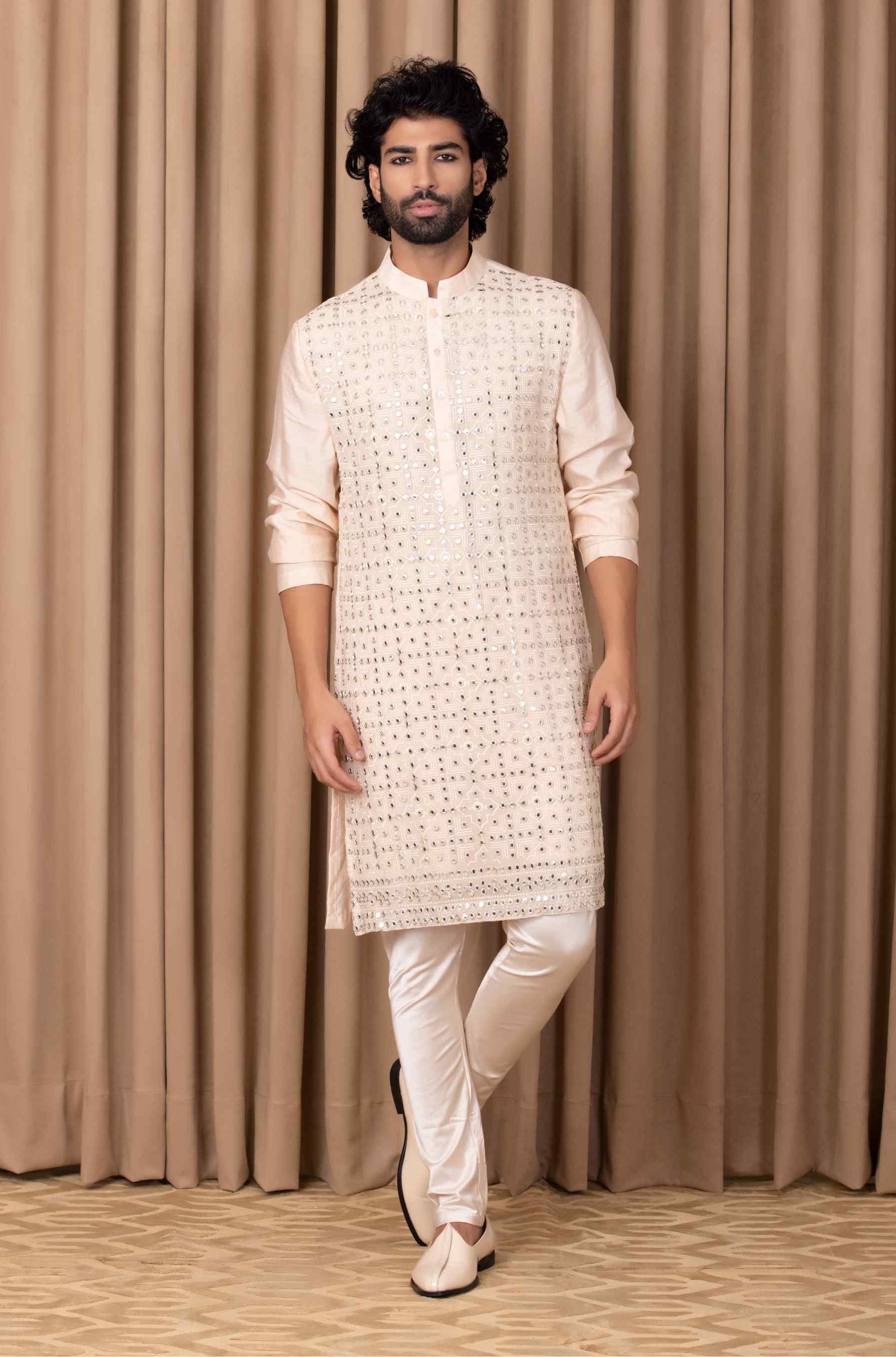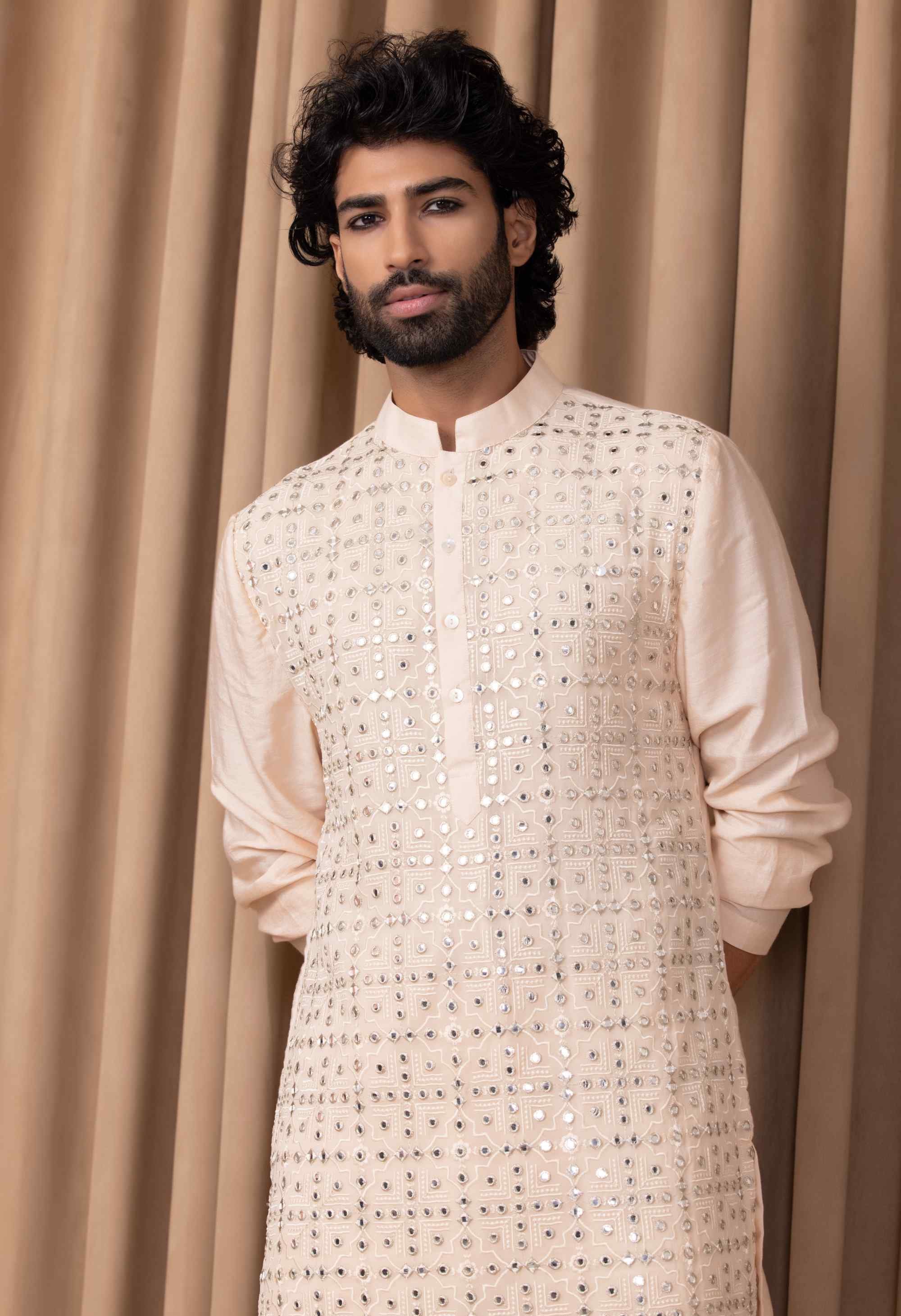 Step into refined elegance with our bespoke cotton silk kurta set in a soft peach hue. This exquisite ensemble features stunning mirror work and intricate machine embroidery across the full front, blending traditional artistry with modern sophistication. Perfect for outdoor occasions, it is crafted for the contemporary groom or groomsmen who value both style and comfort. Paired with an ivory classic churidaar, the outfit ensures a polished and cohesive look. Elevate your special day with this beautifully designed kurta set, merging delicate embellishments with understated charm for a memorable appearance.