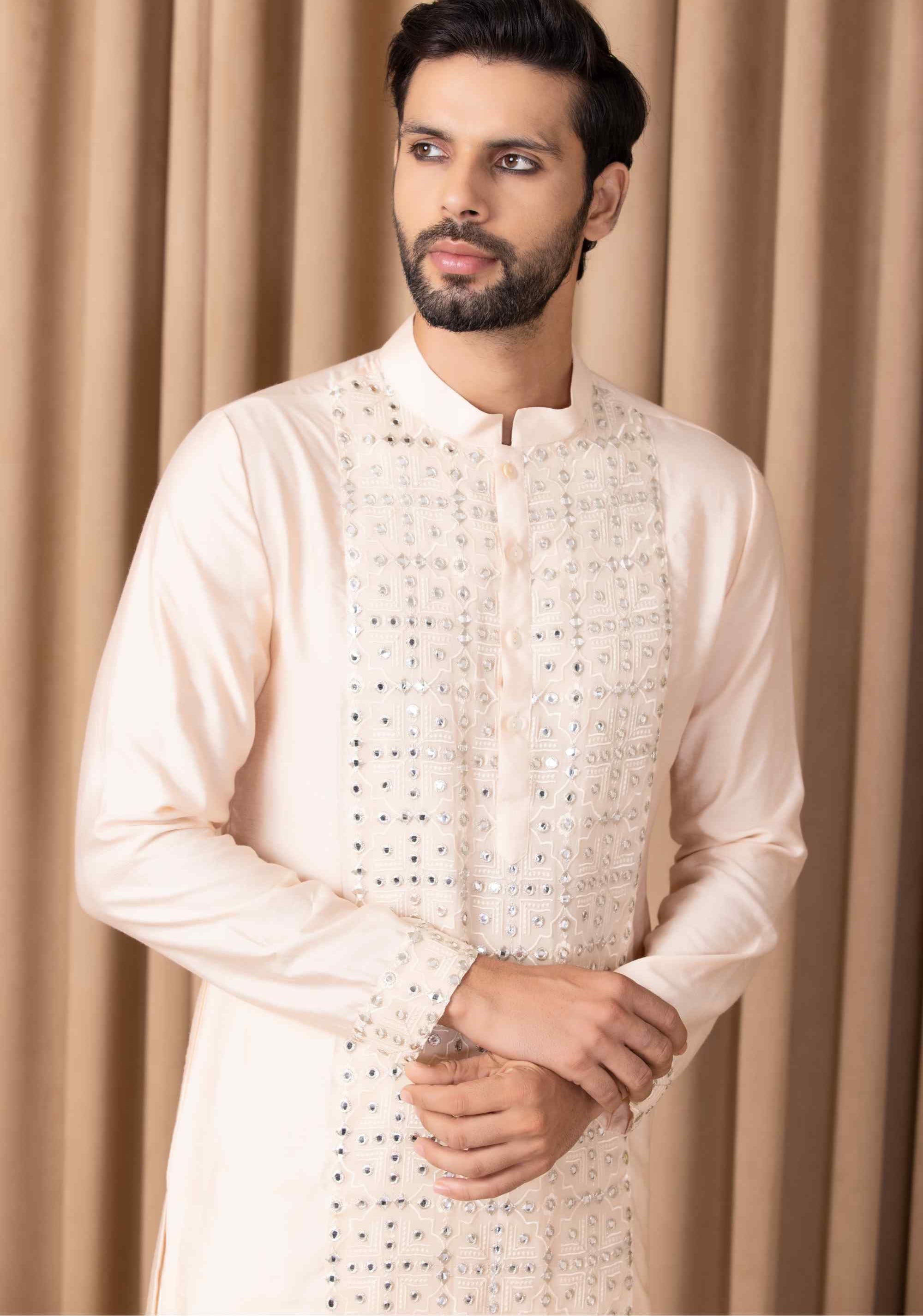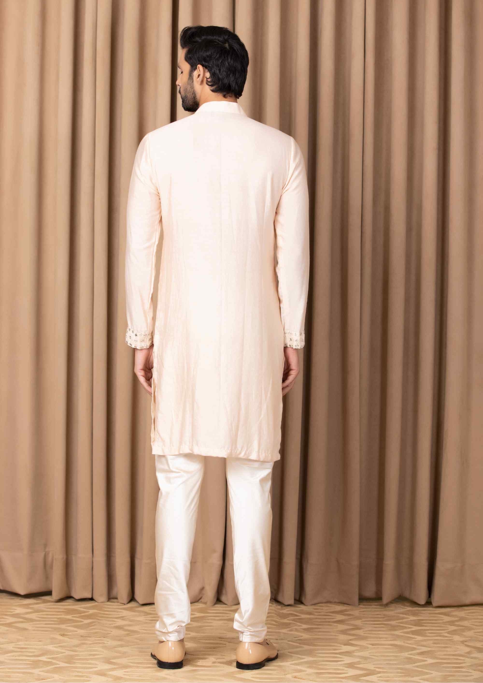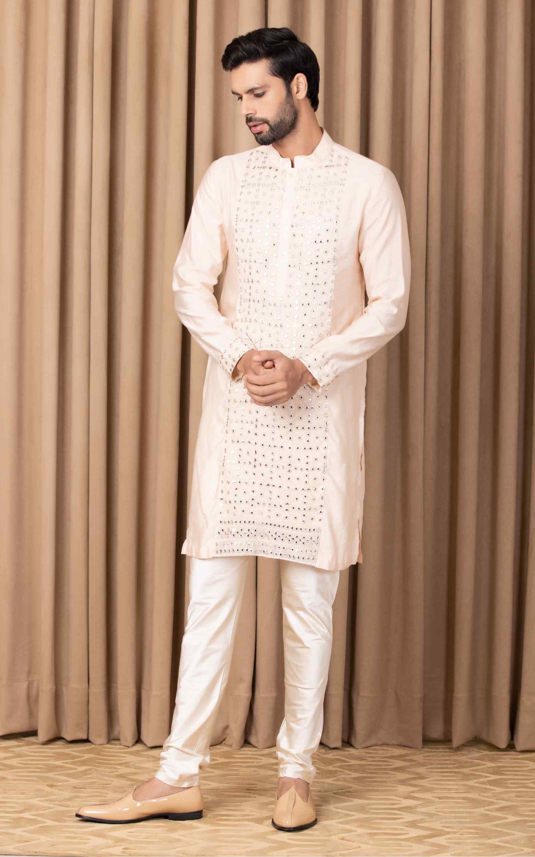 Embrace sophistication with our bespoke cotton silk kurta set in a soft peach hue. This elegant ensemble is highlighted by intricate mirror work and machine embroidery on the front, offering a graceful fusion of traditional craftsmanship and modern design. Perfect for outdoor occasions, it is tailored for the contemporary groom or groomsmen who seek both style and comfort. Paired with an ivory classic churidaar, this outfit ensures a seamless and refined look. Make a memorable impression on your special day with this beautifully crafted kurta set, combining delicate details with timeless elegance.